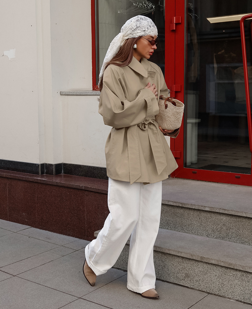 2025 유럽과 미국의 국경 간 새로운 디자인 윈드 브레이커 여성 중간 길이 카키색 재킷 레이스 업 가을 긴팔 재킷