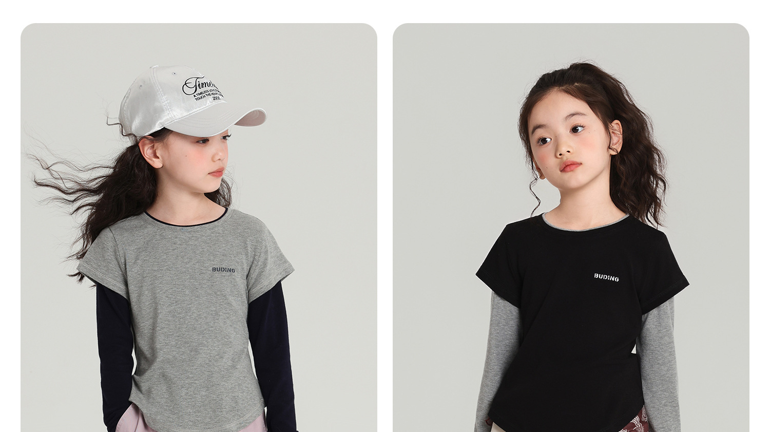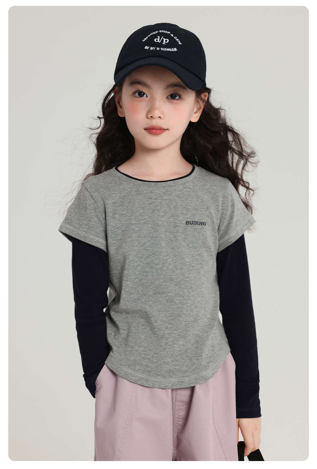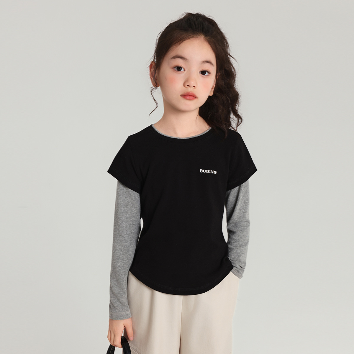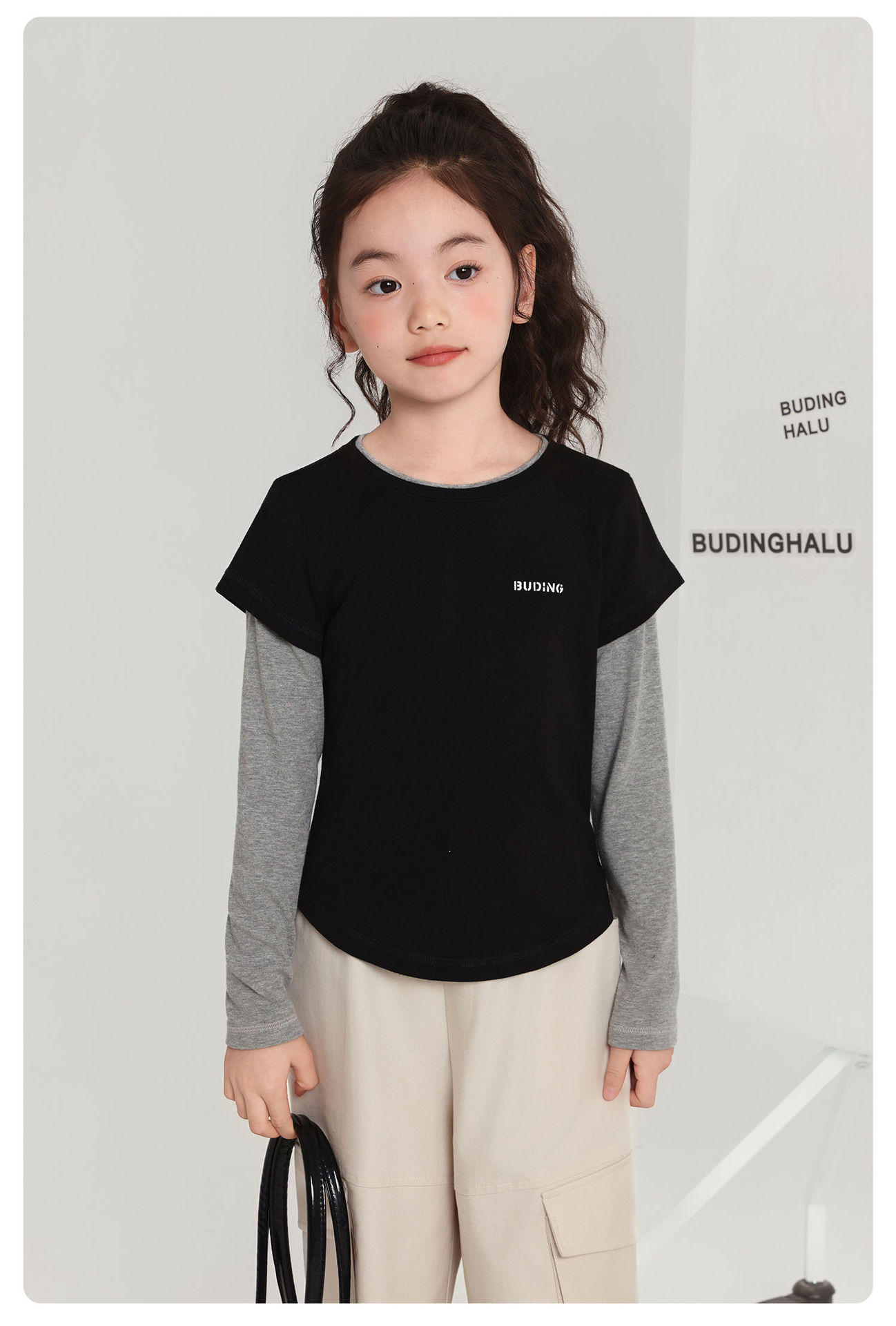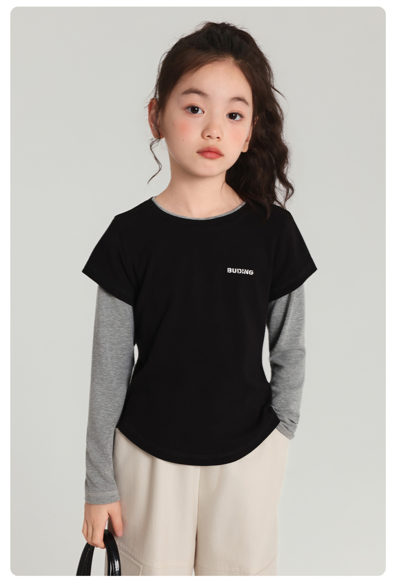 Pudding Haru 아동용상의 소녀 심플 긴팔 2025 가을 신작 아동용 가짜 투피스 캐시미어 바닥 셔츠스토어 가기