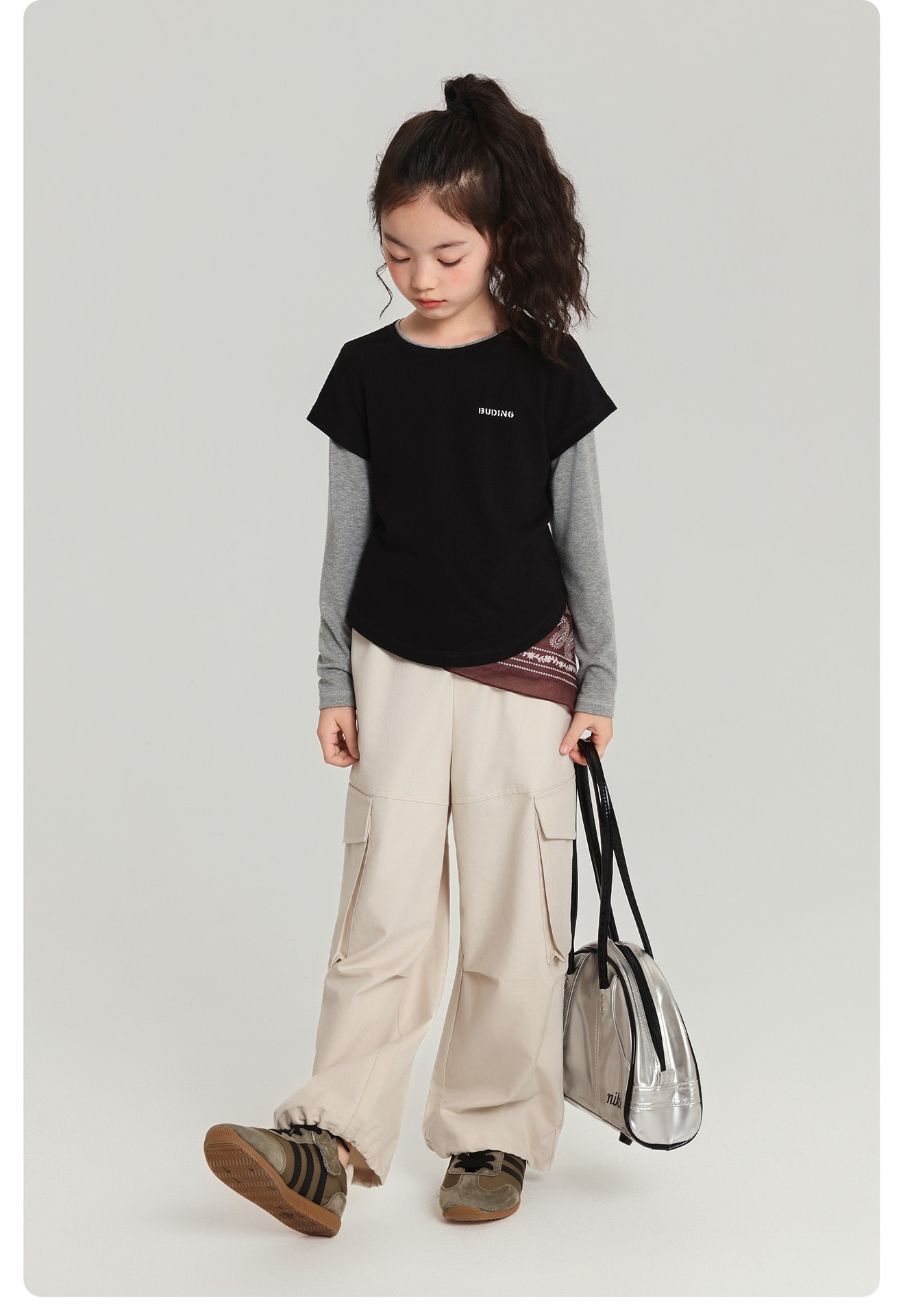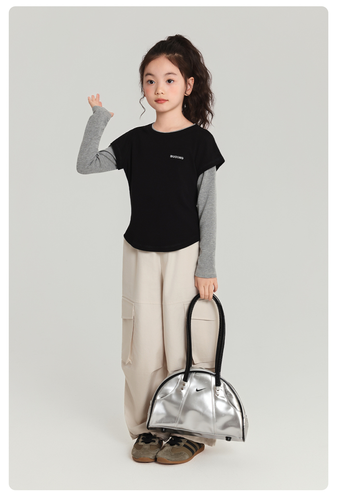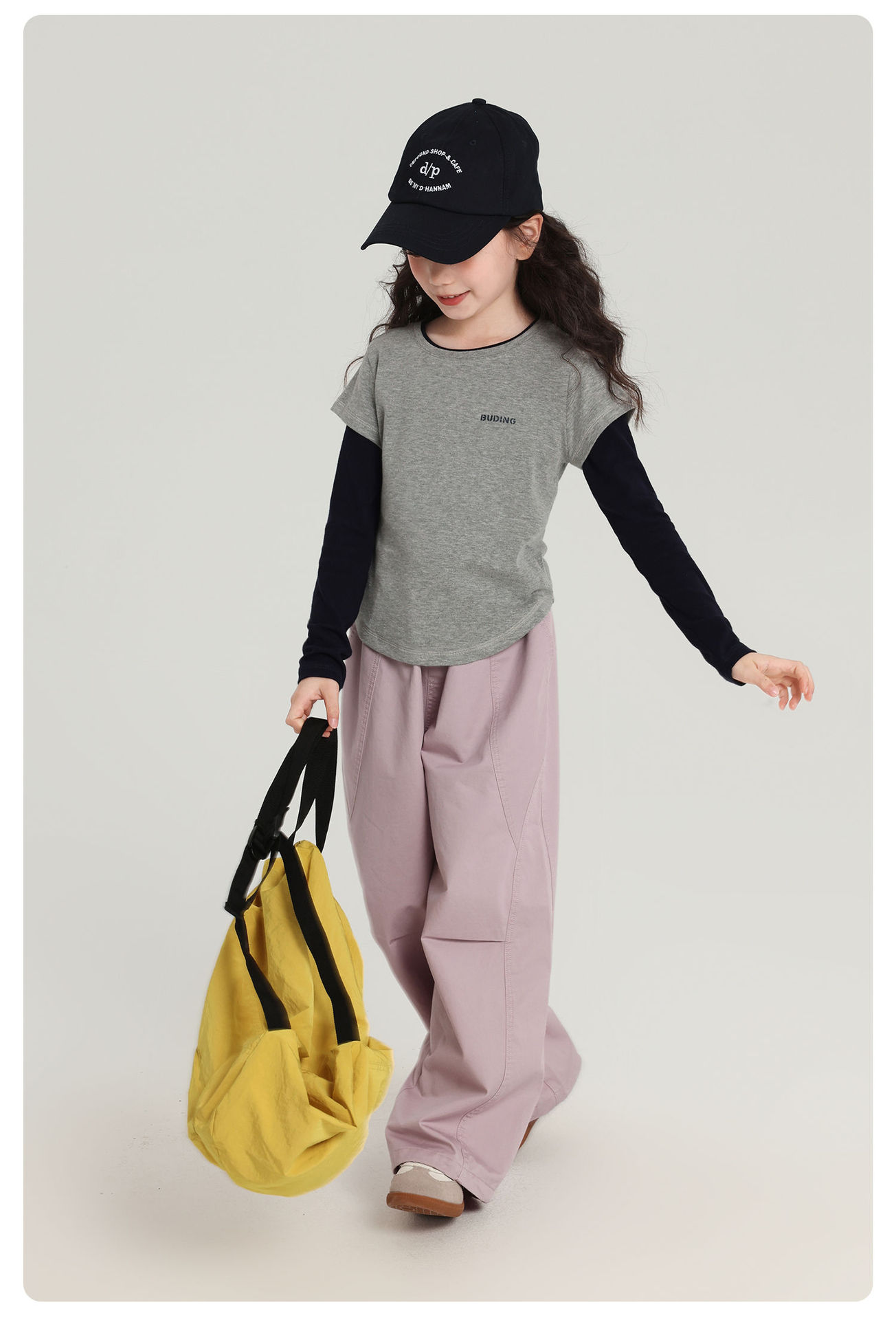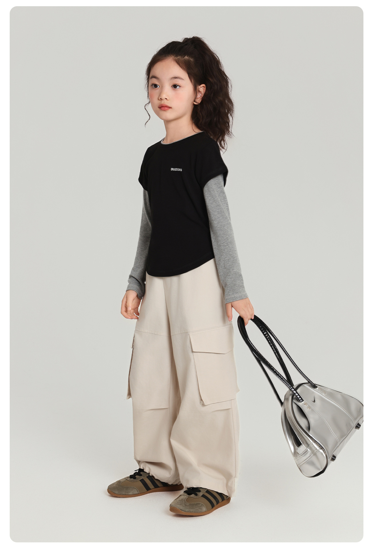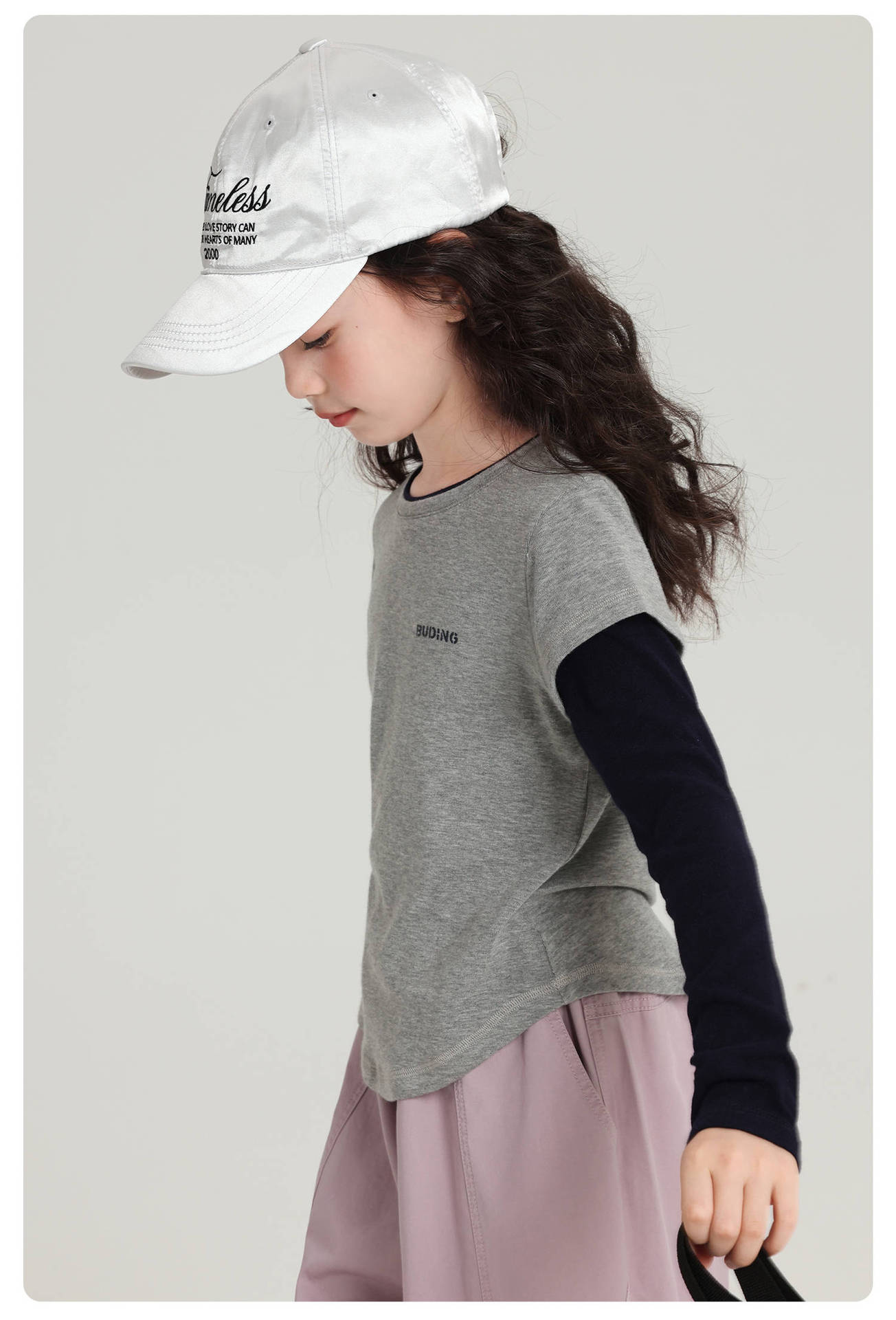 Pudding Haru 아동용상의 소녀 심플 긴팔 2025 가을 신작 아동용 가짜 투피스 캐시미어 바닥 셔츠스토어 가기
