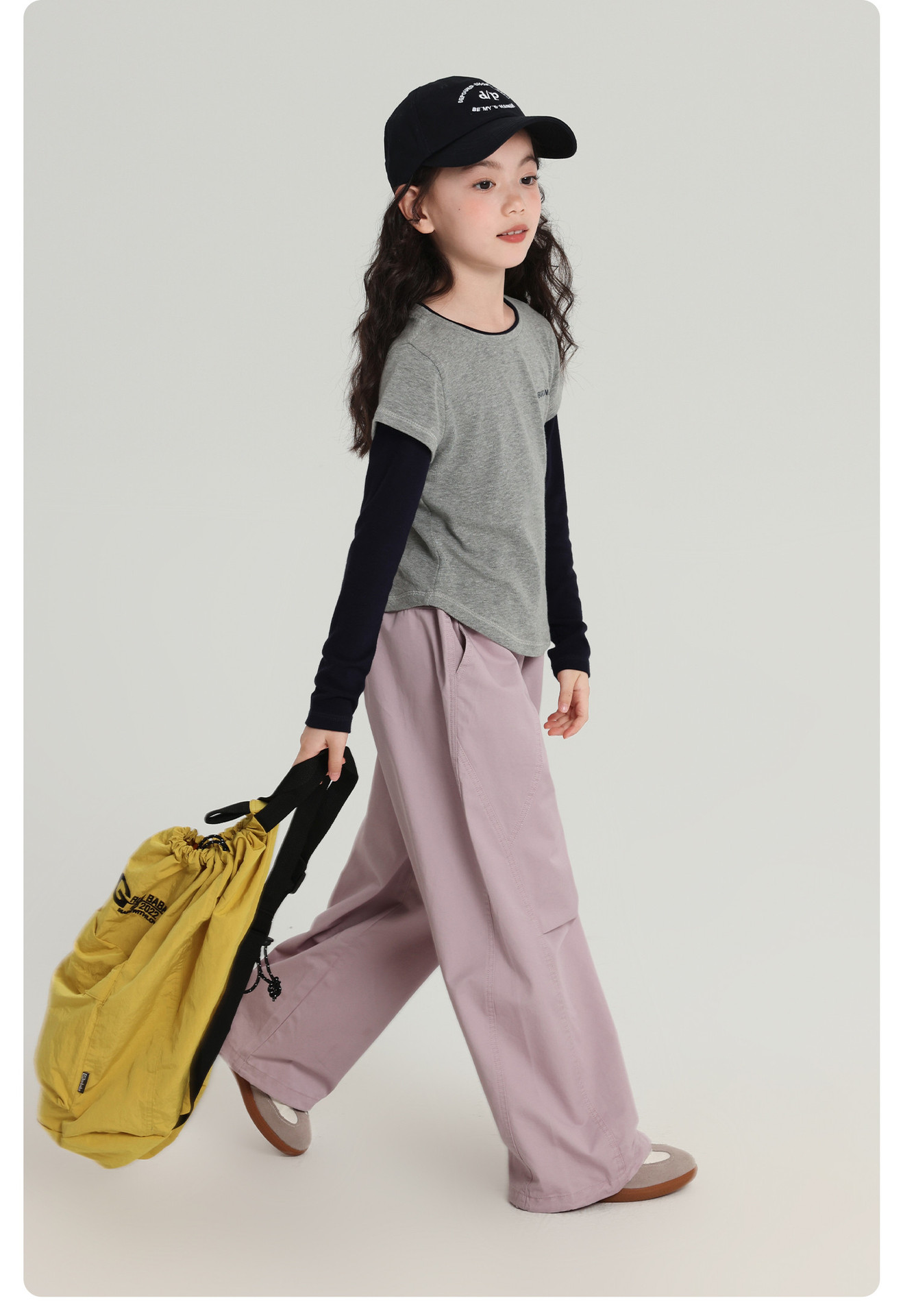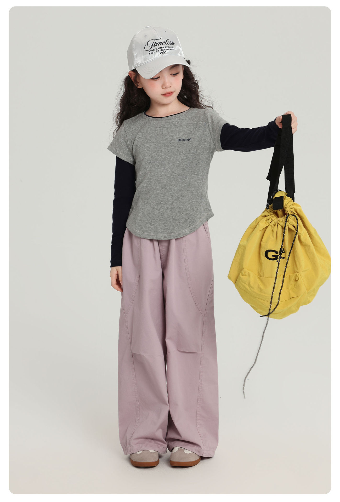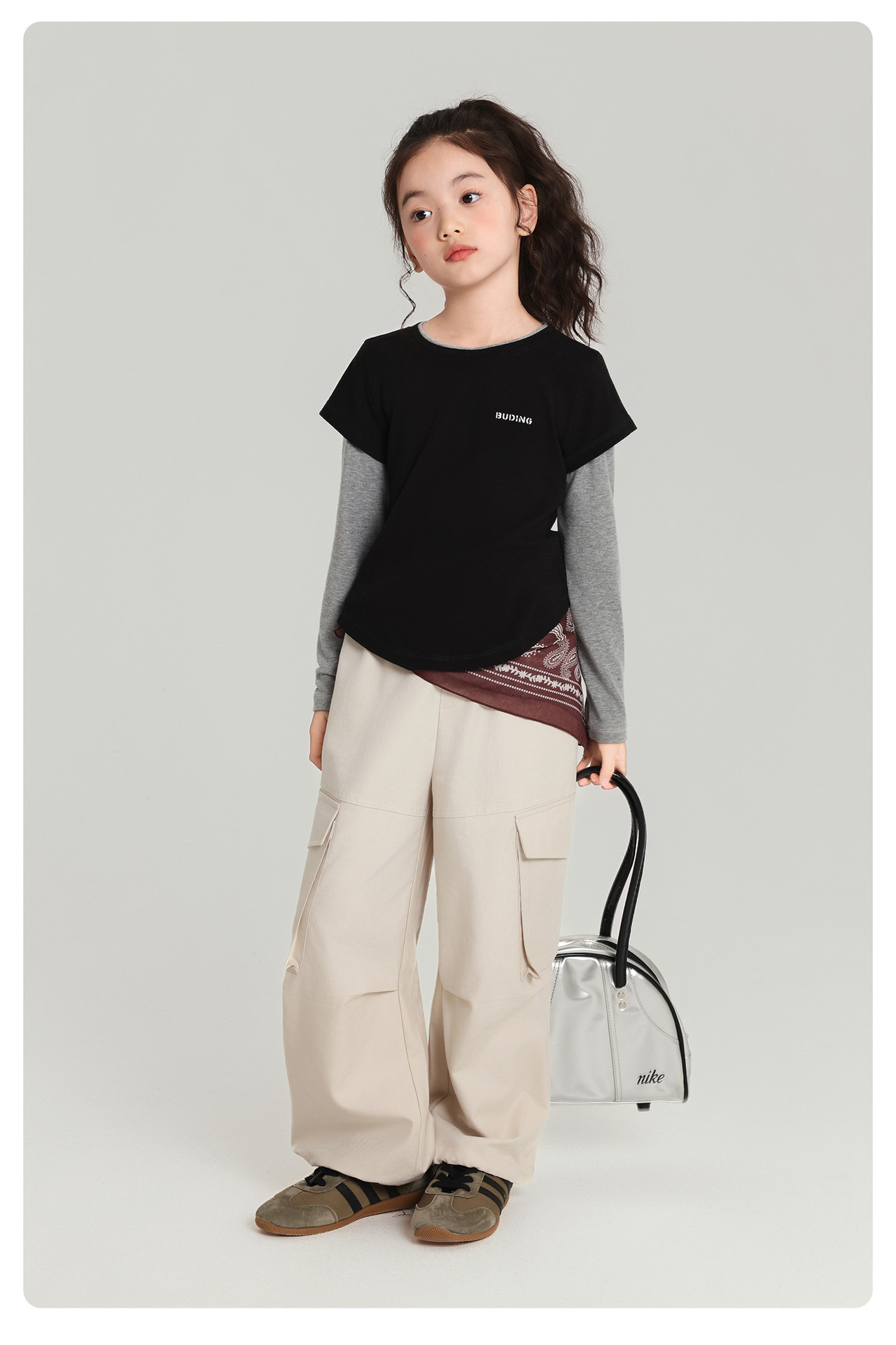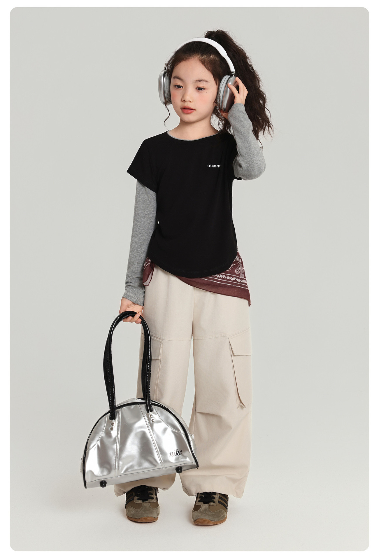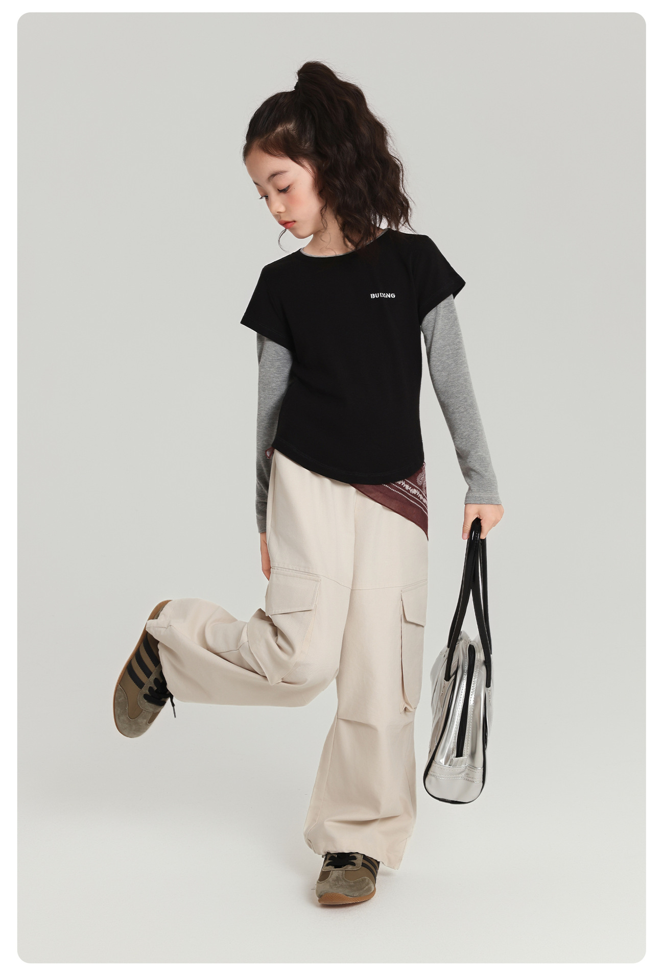 Pudding Haru 아동용상의 소녀 심플 긴팔 2025 가을 신작 아동용 가짜 투피스 캐시미어 바닥 셔츠스토어 가기