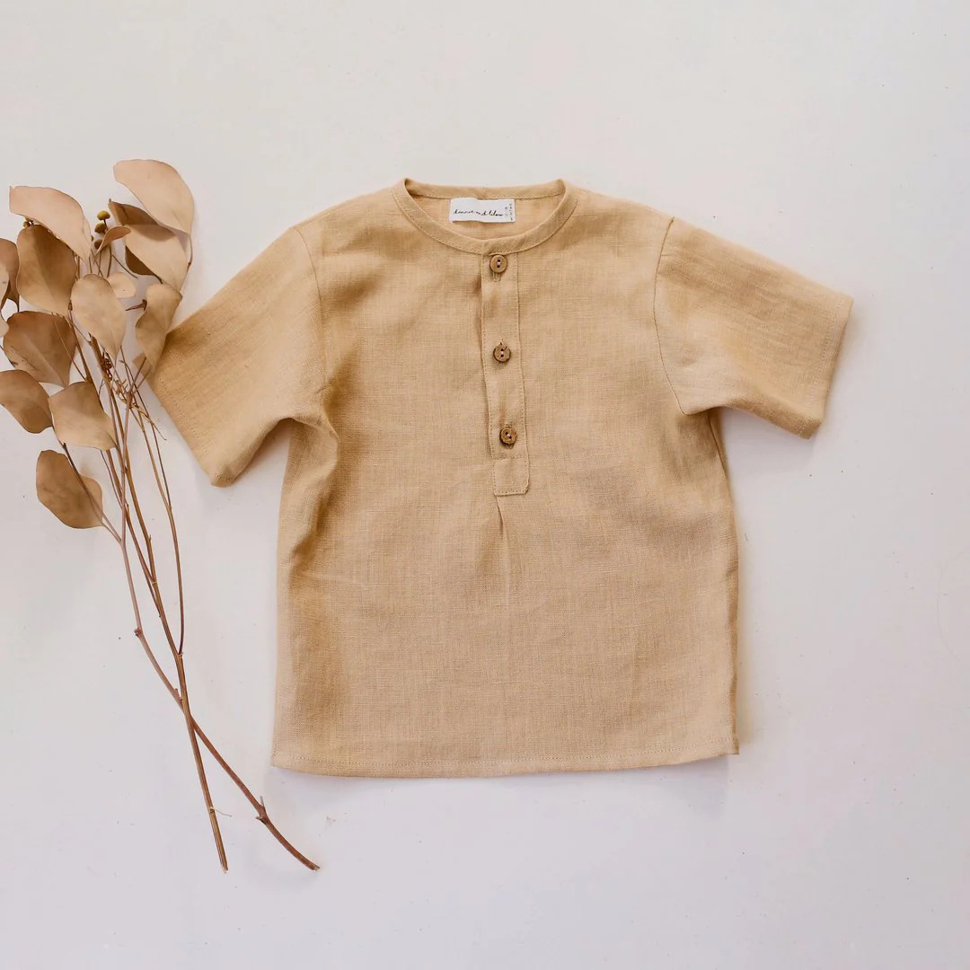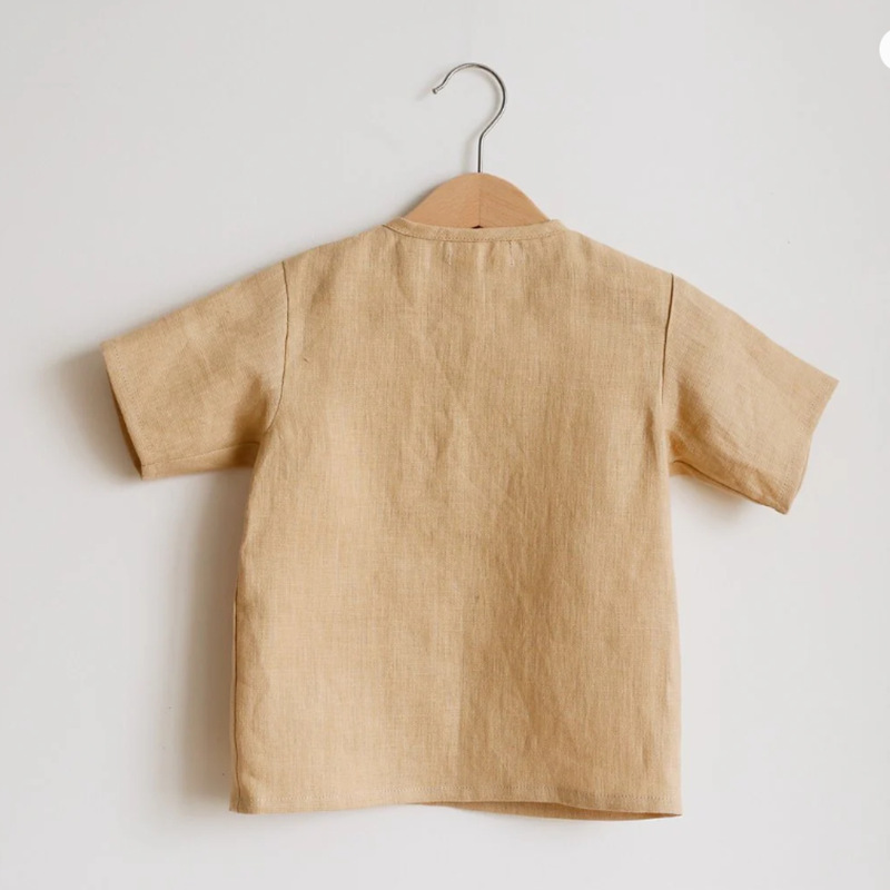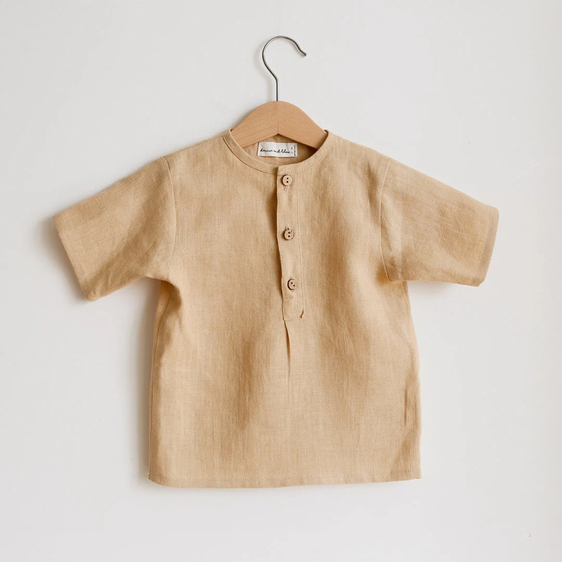 여름 소년 반팔 셔츠 복고풍 버튼 디자인 아기 리넨 코튼 티셔츠 솔리드 컬러 유아 탑스토어 가기