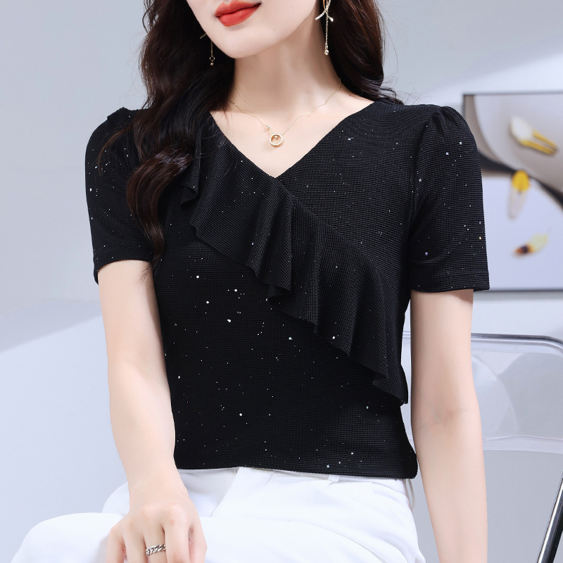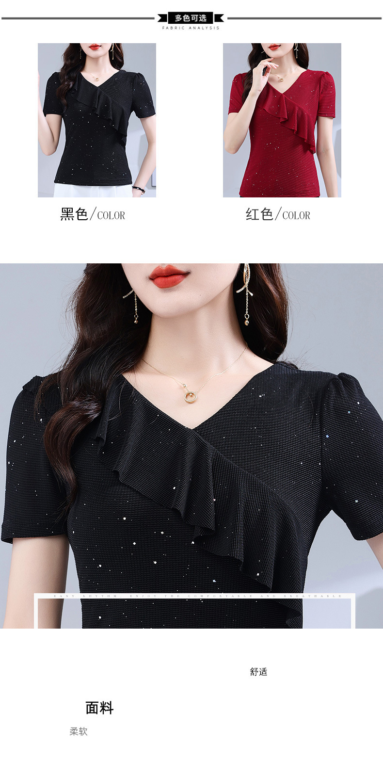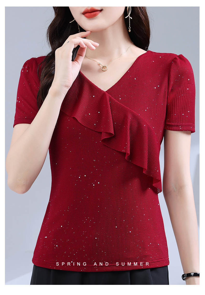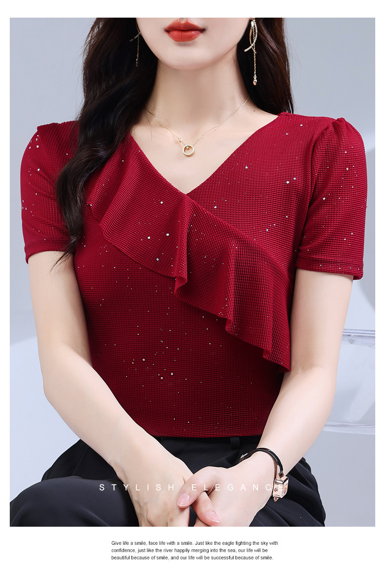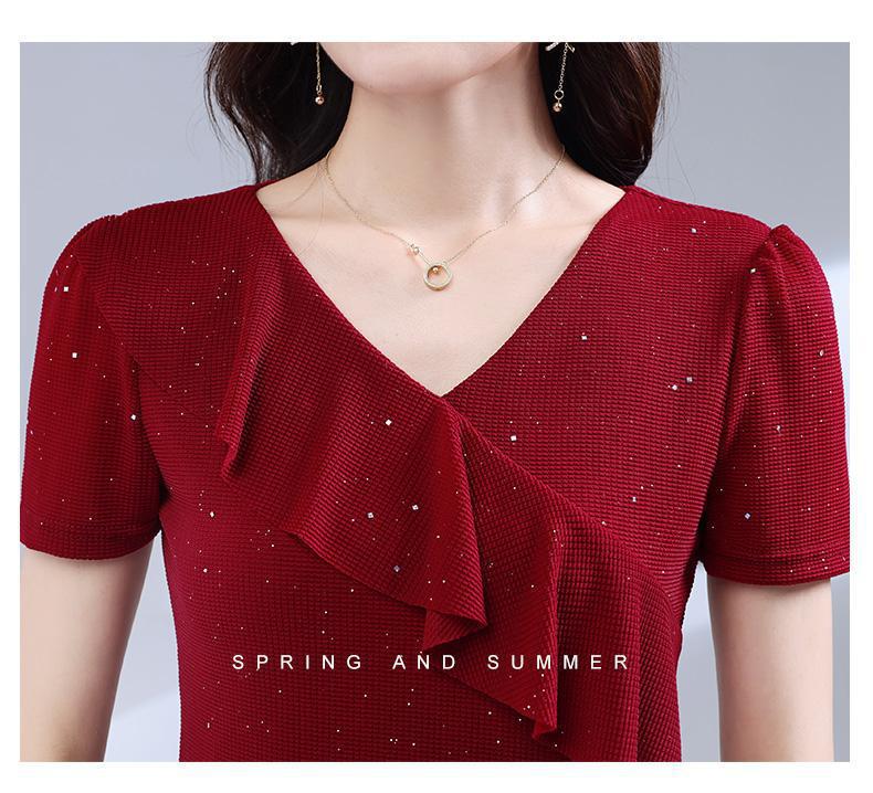 V 넥 러플 반팔 티셔츠 여성용 여름 새 스타일 댄스웨어 스퀘어 댄스 슬리밍 여성용 탑