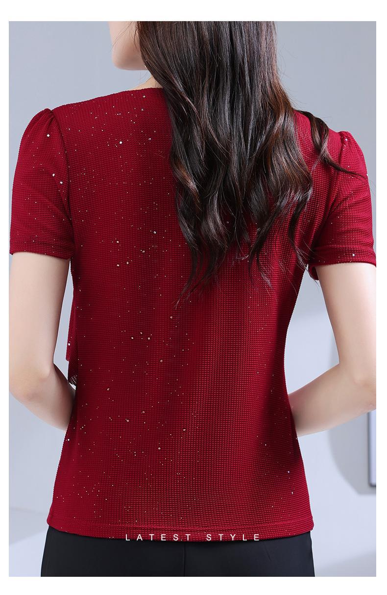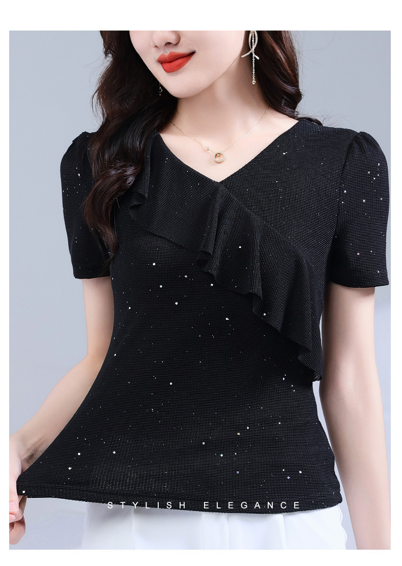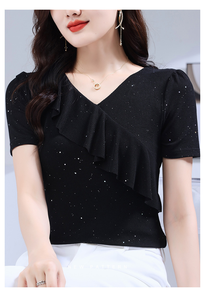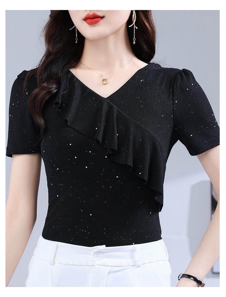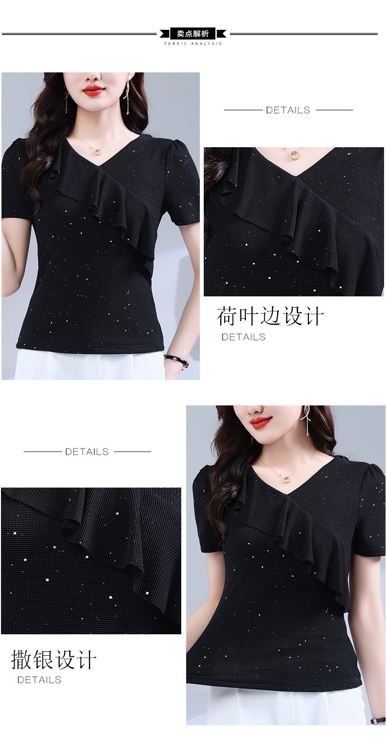 V 넥 러플 반팔 티셔츠 여성용 여름 새 스타일 댄스웨어 스퀘어 댄스 슬리밍 여성용 탑
