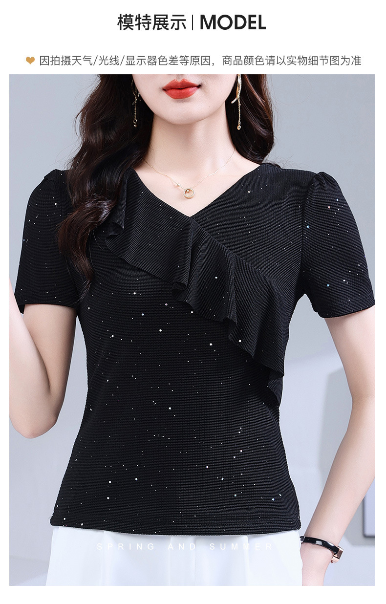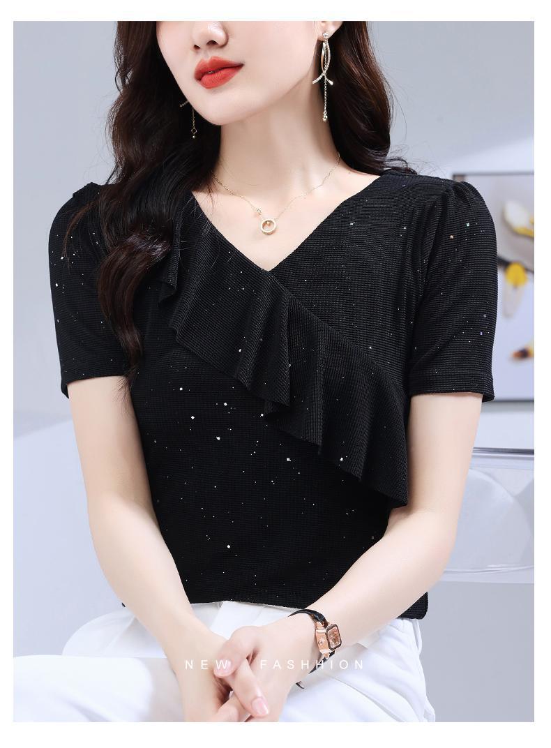 V 넥 러플 반팔 티셔츠 여성용 여름 새 스타일 댄스웨어 스퀘어 댄스 슬리밍 여성용 탑스토어 가기
