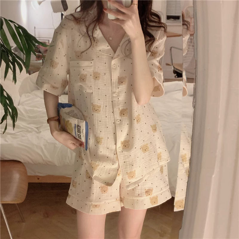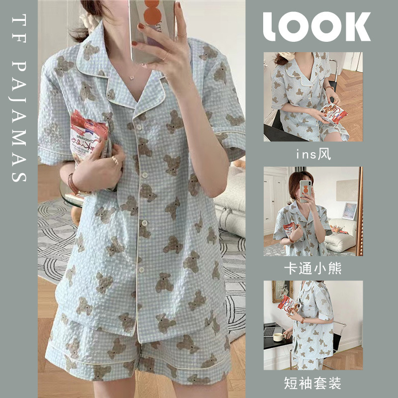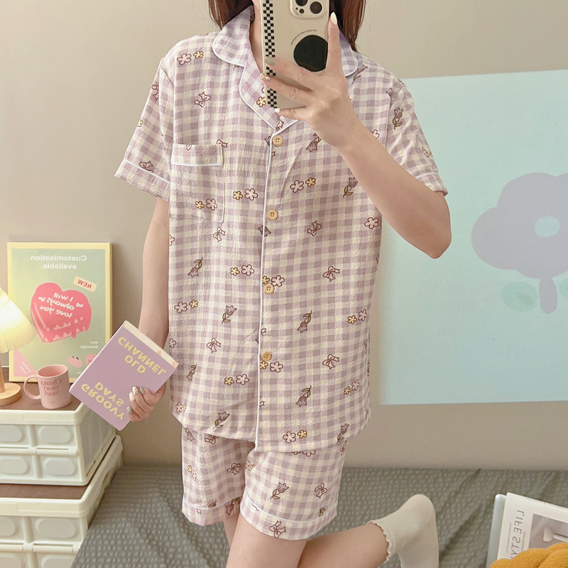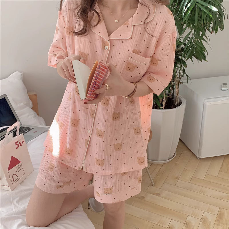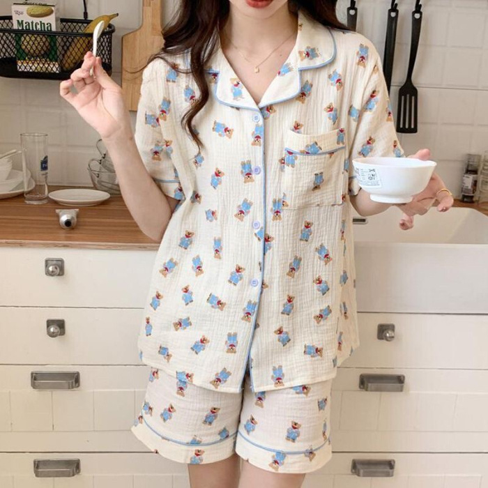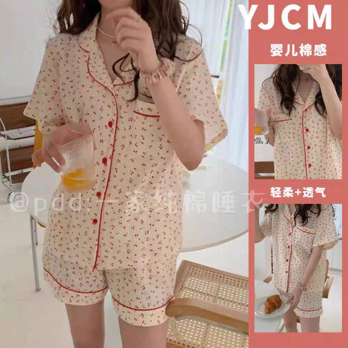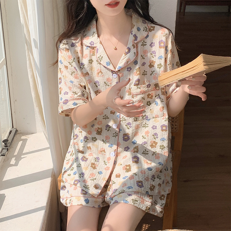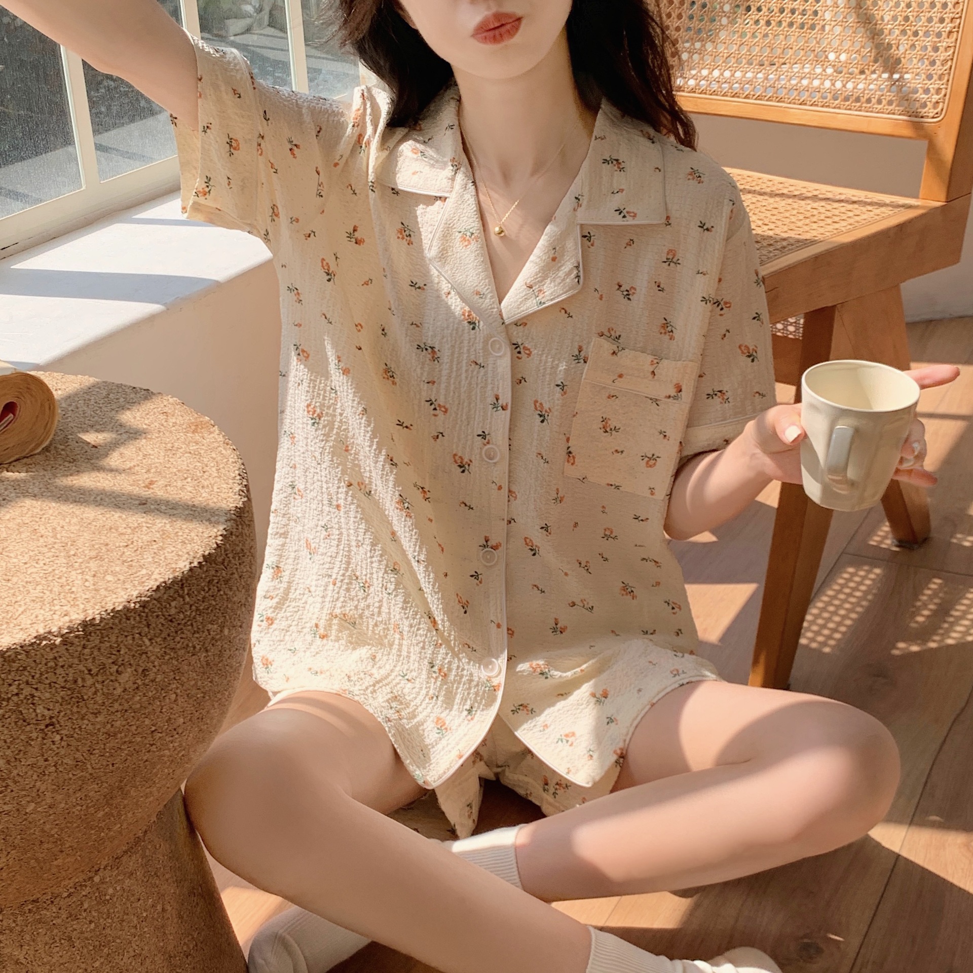 Ins 목가적 인 스타일 꽃 무늬 버블 코튼 잠옷 여성 여름 카디건 옷깃 반팔 반바지 공주 스타일 홈웨어 세트스토어 가기