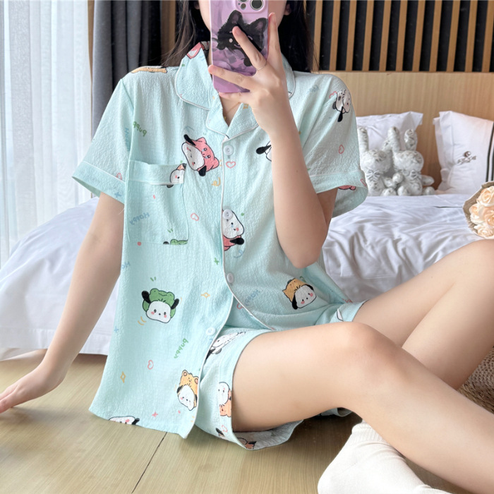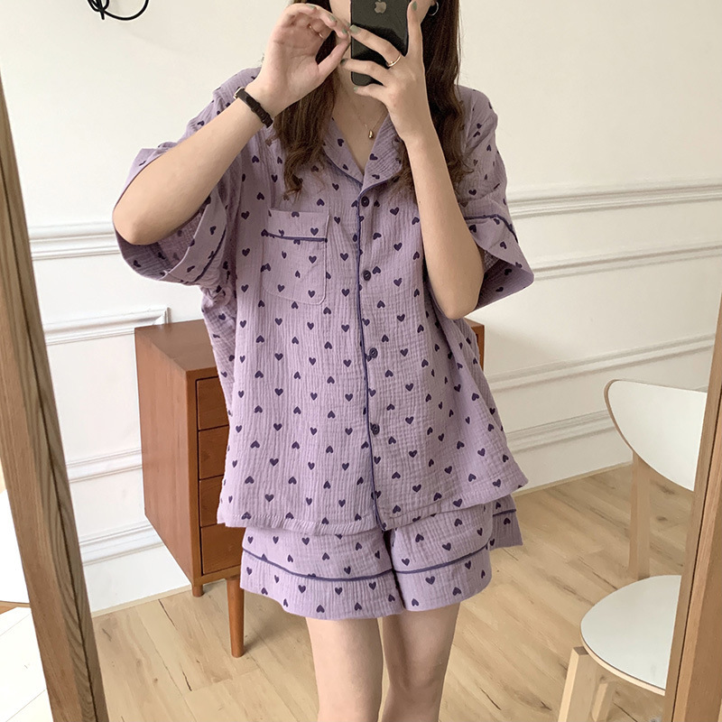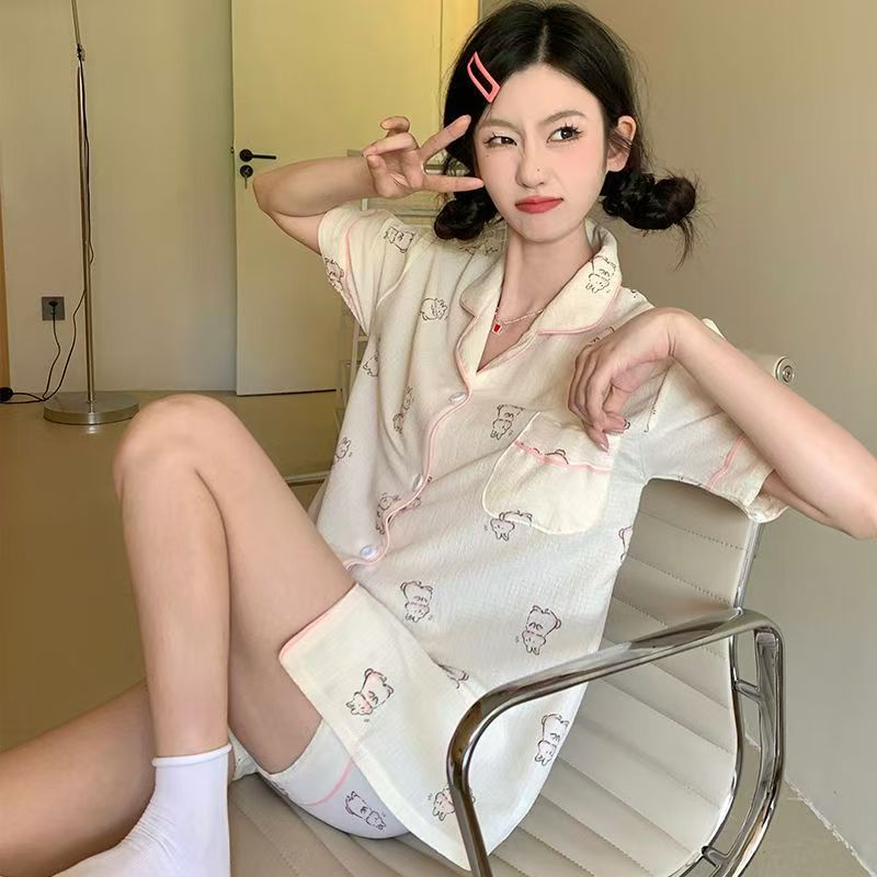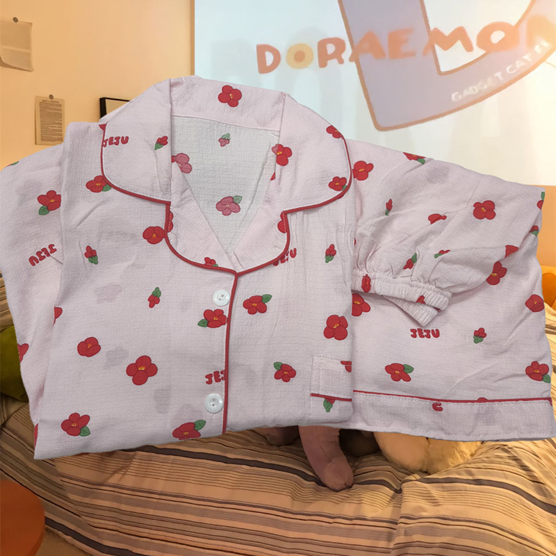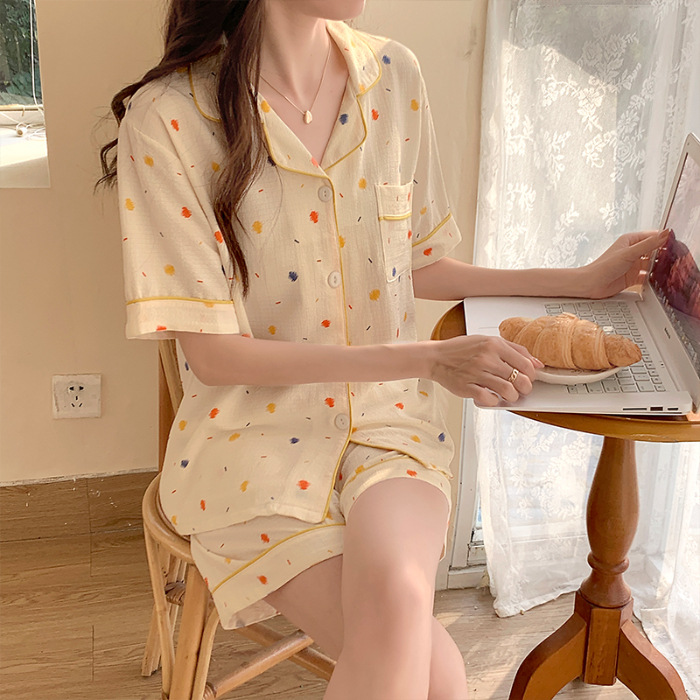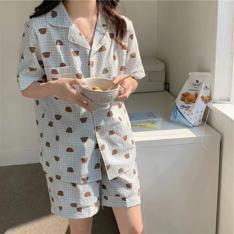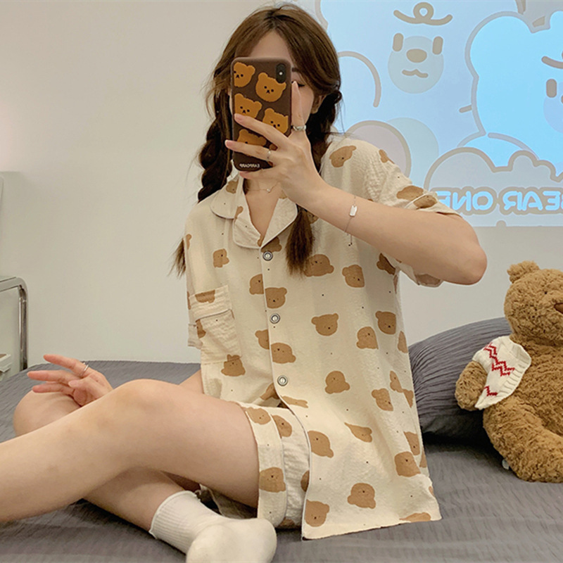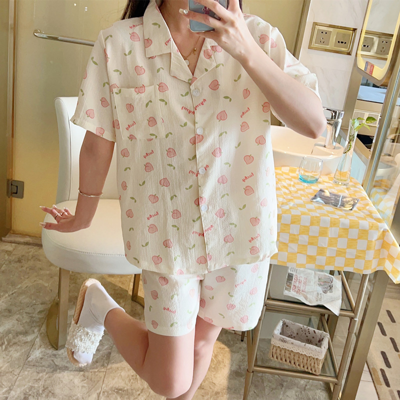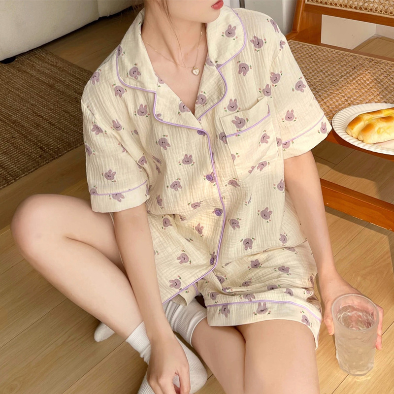 Ins 목가적 인 스타일 꽃 무늬 버블 코튼 잠옷 여성 여름 카디건 옷깃 반팔 반바지 공주 스타일 홈웨어 세트스토어 가기