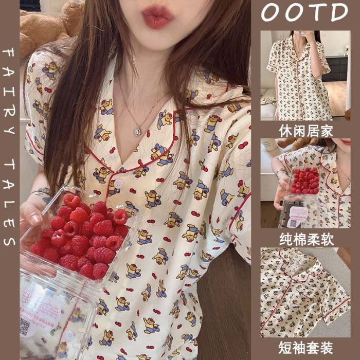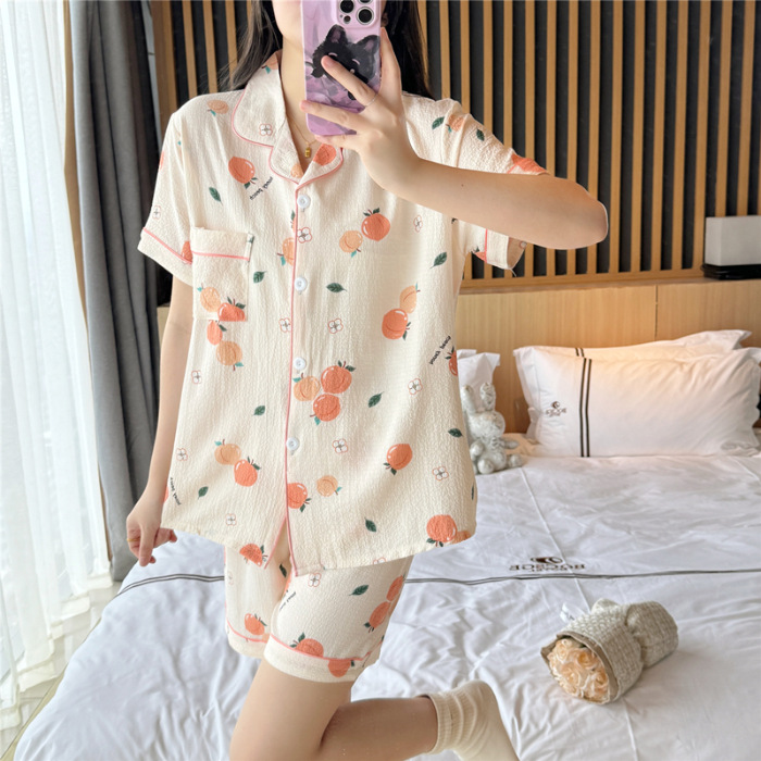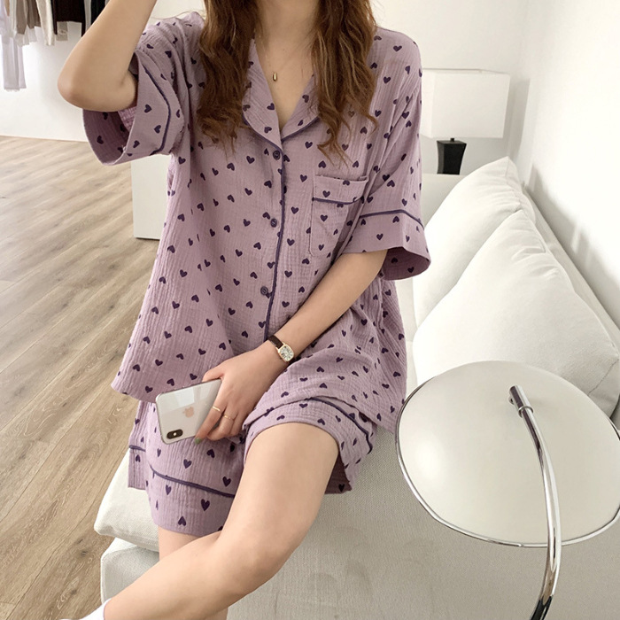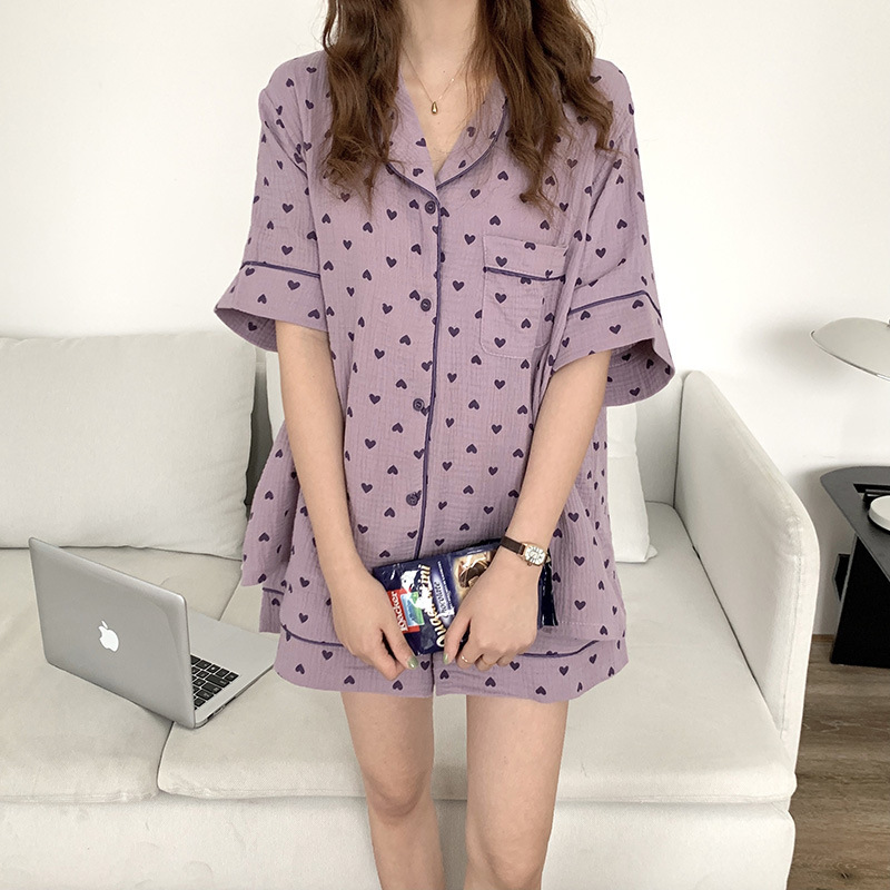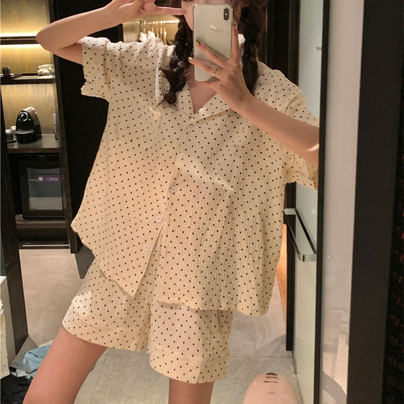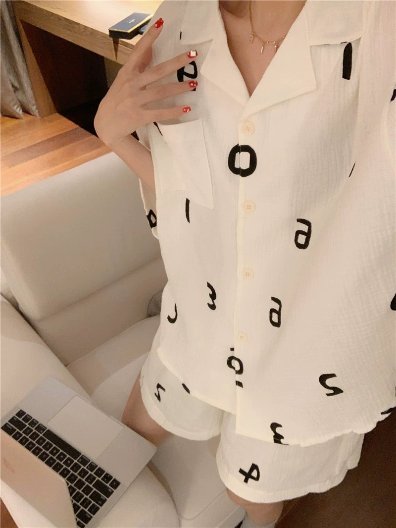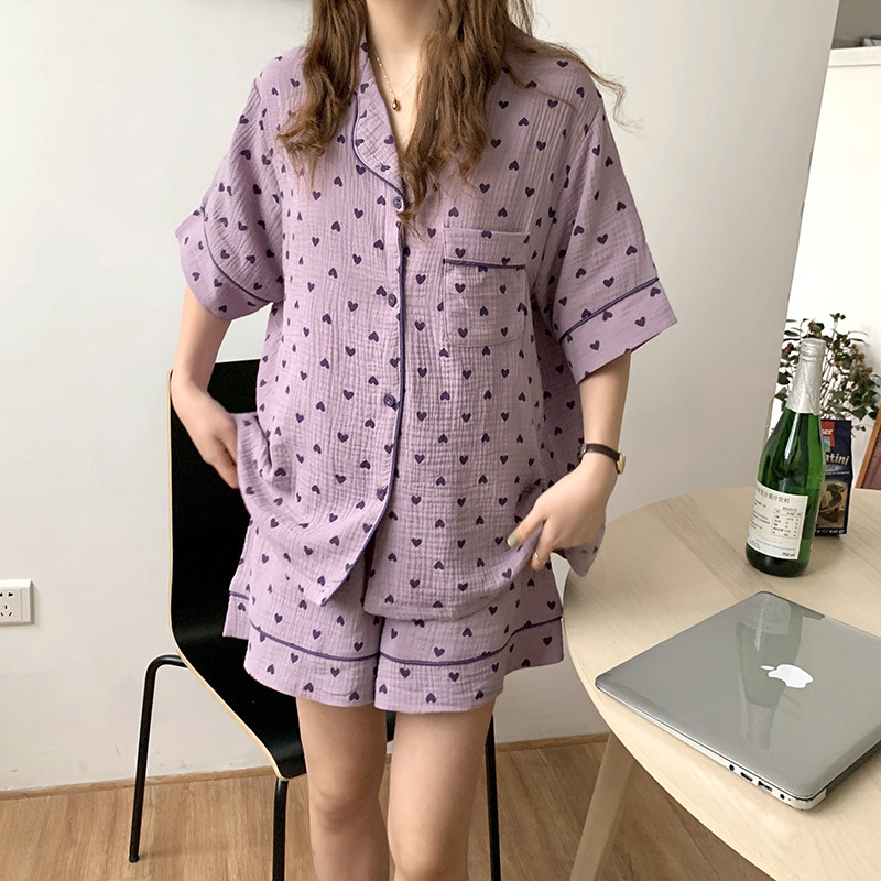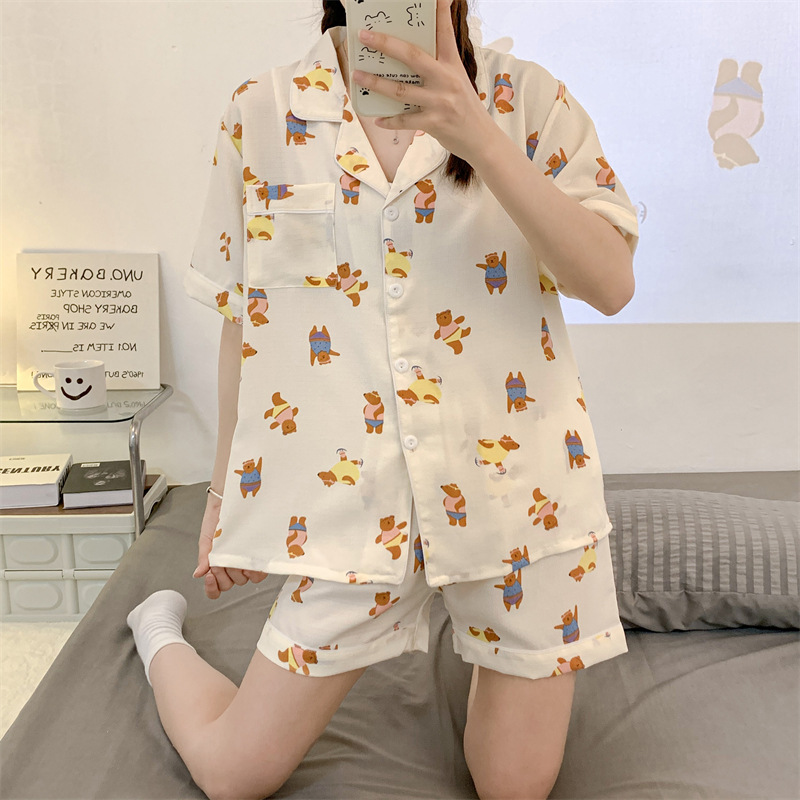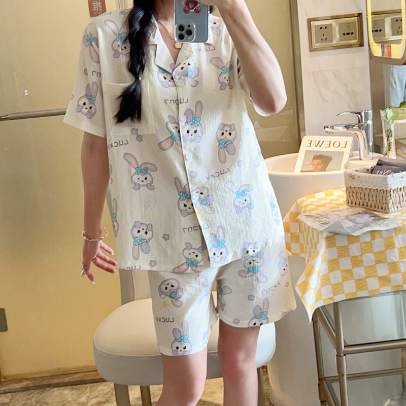 Ins 목가적 인 스타일 꽃 무늬 버블 코튼 잠옷 여성 여름 카디건 옷깃 반팔 반바지 공주 스타일 홈웨어 세트스토어 가기