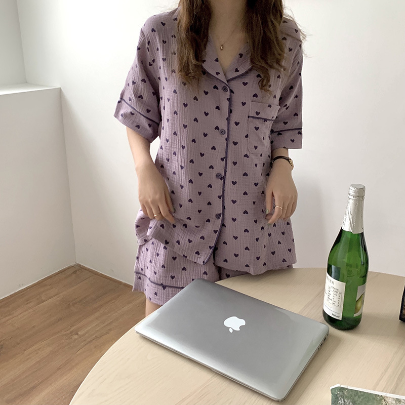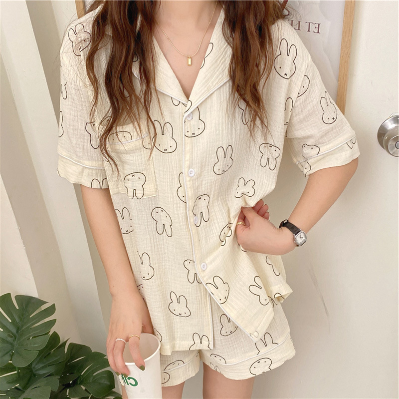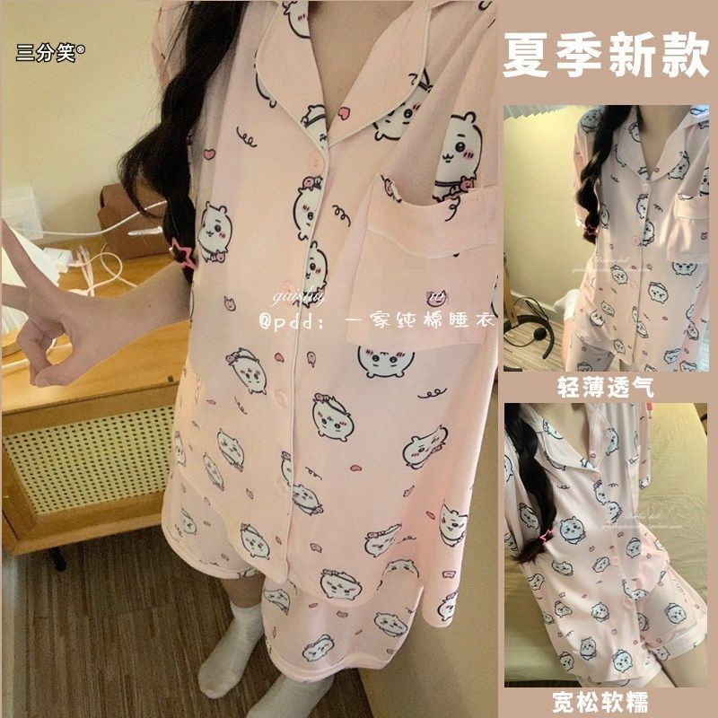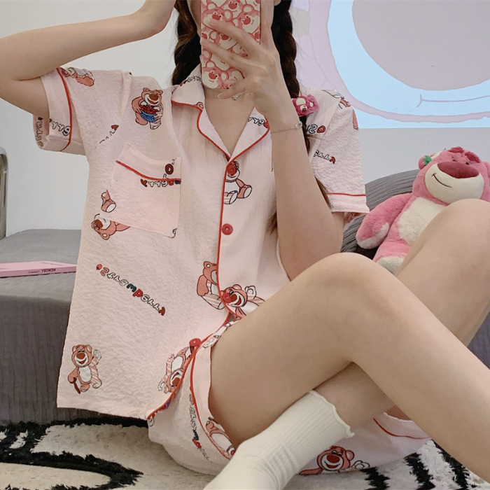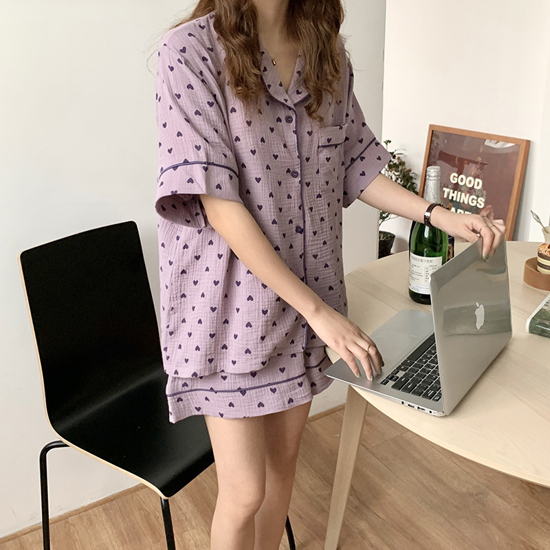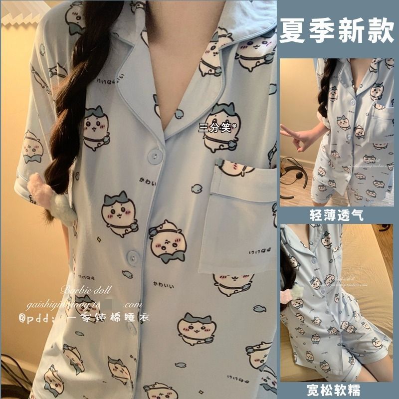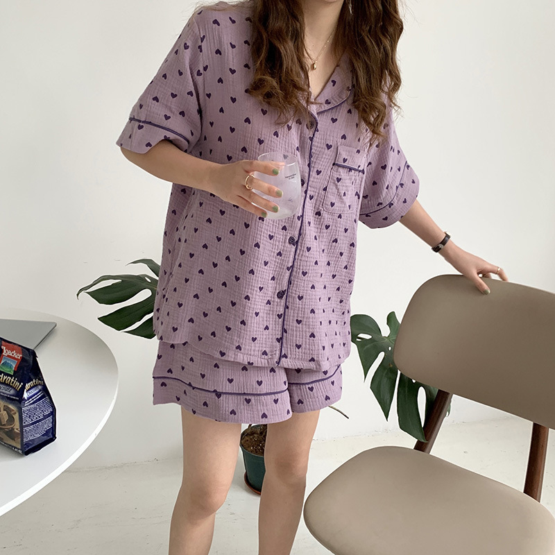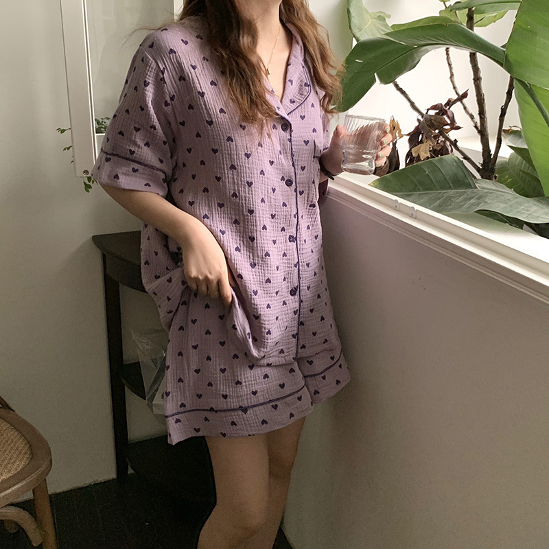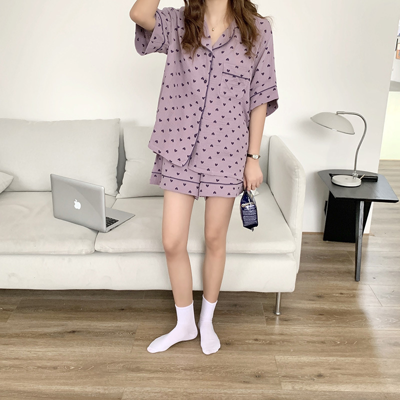 Ins 목가적 인 스타일 꽃 무늬 버블 코튼 잠옷 여성 여름 카디건 옷깃 반팔 반바지 공주 스타일 홈웨어 세트스토어 가기