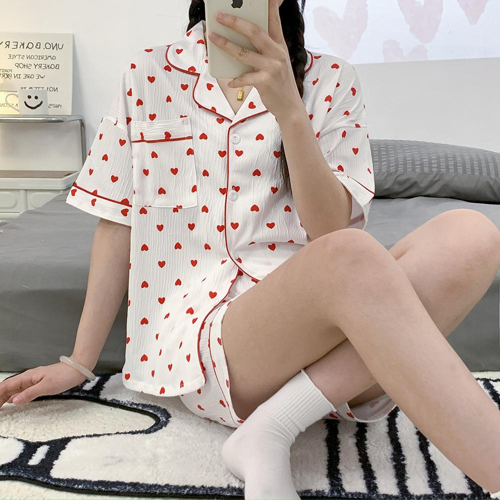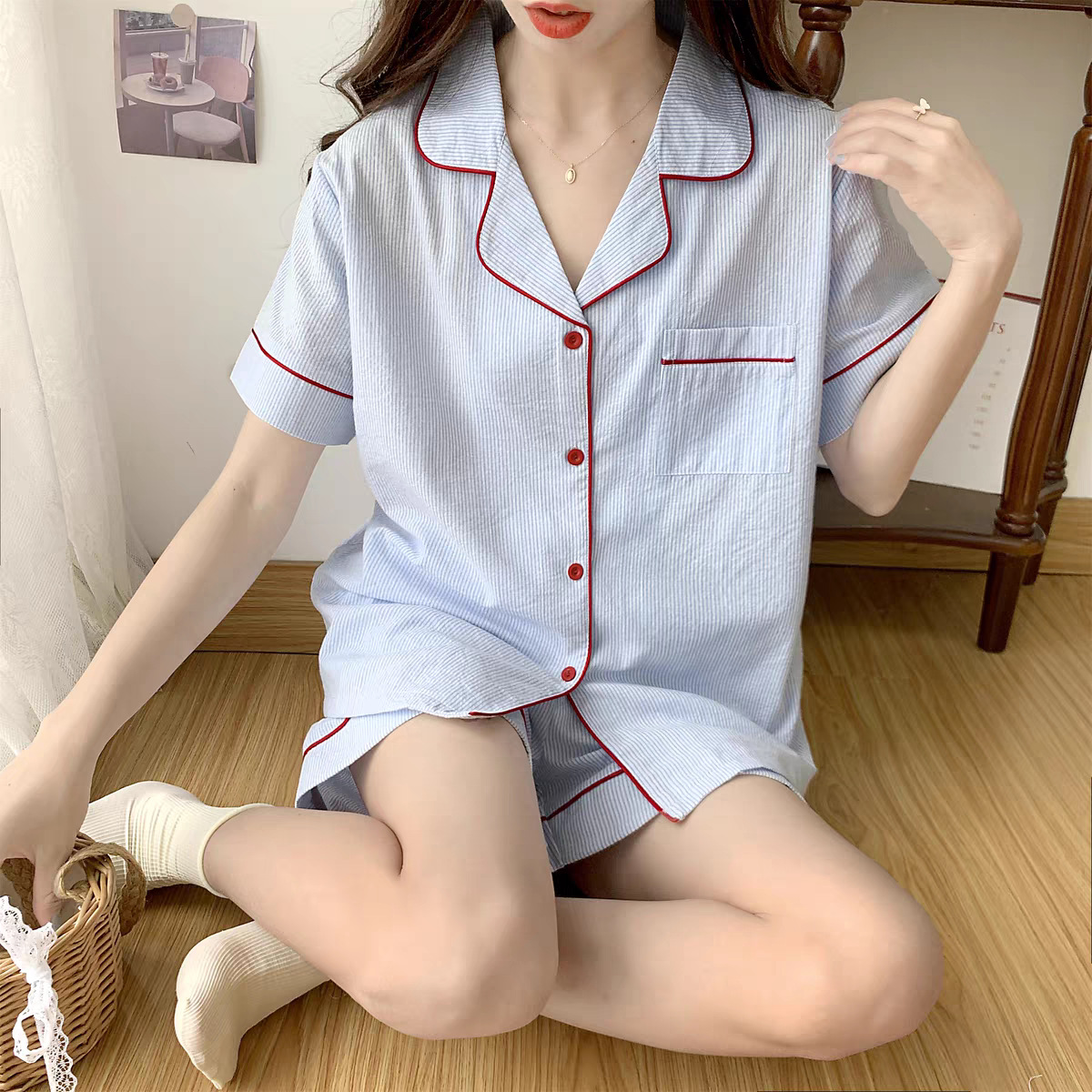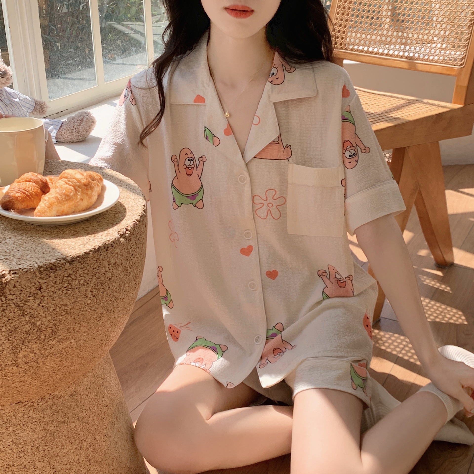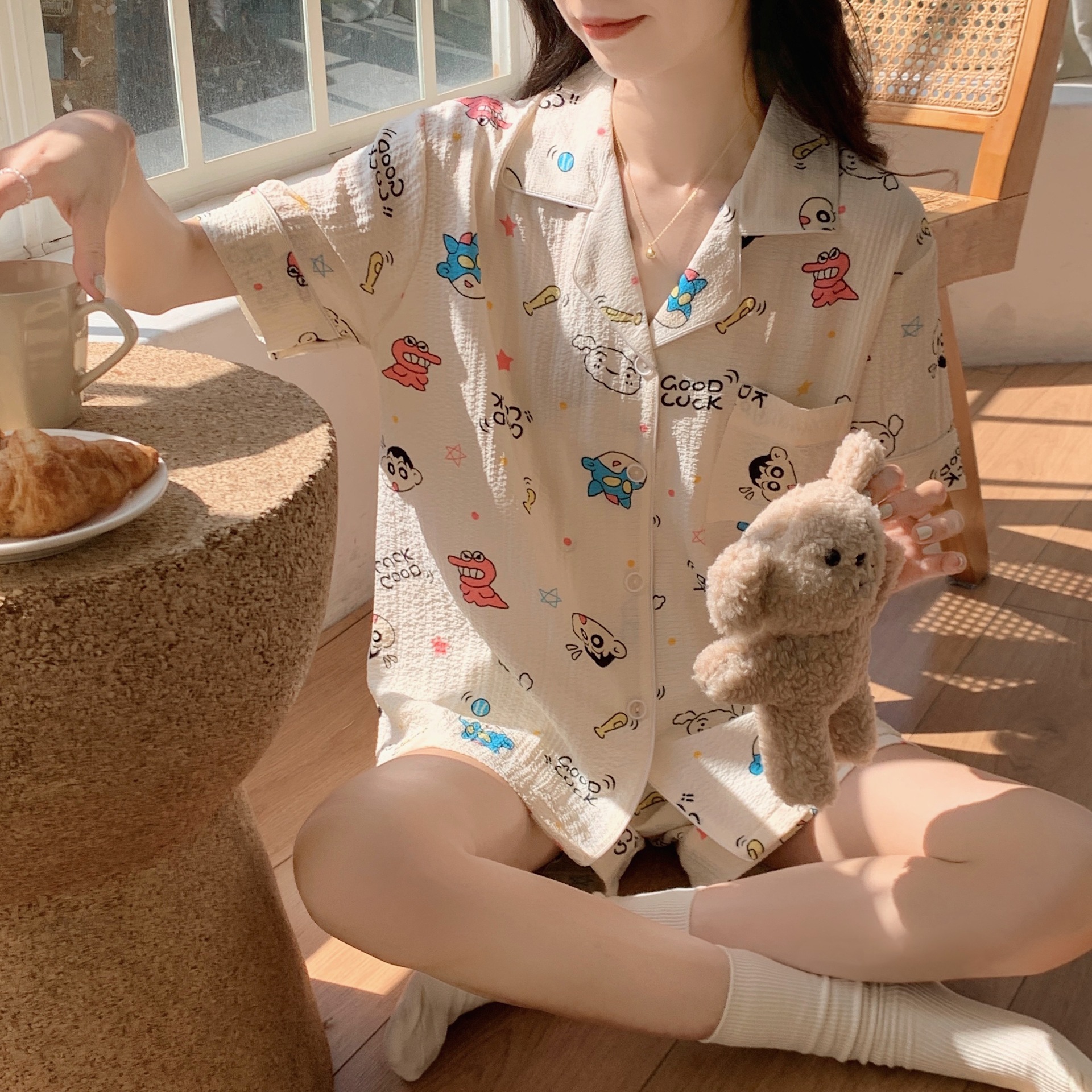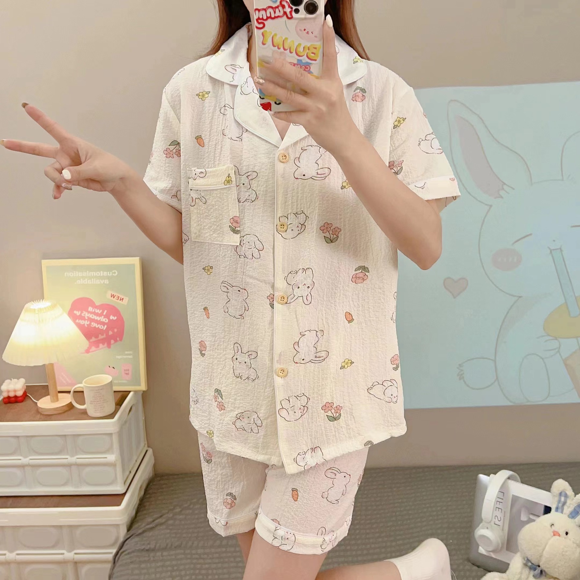 Ins 목가적 인 스타일 꽃 무늬 버블 코튼 잠옷 여성 여름 카디건 옷깃 반팔 반바지 공주 스타일 홈웨어 세트스토어 가기