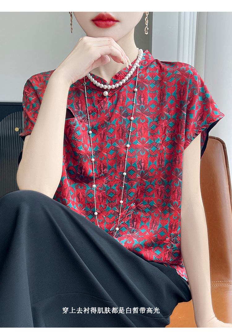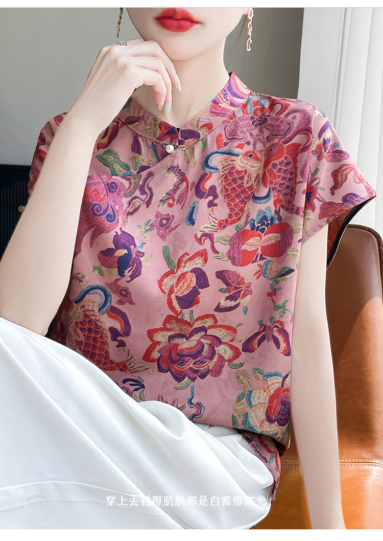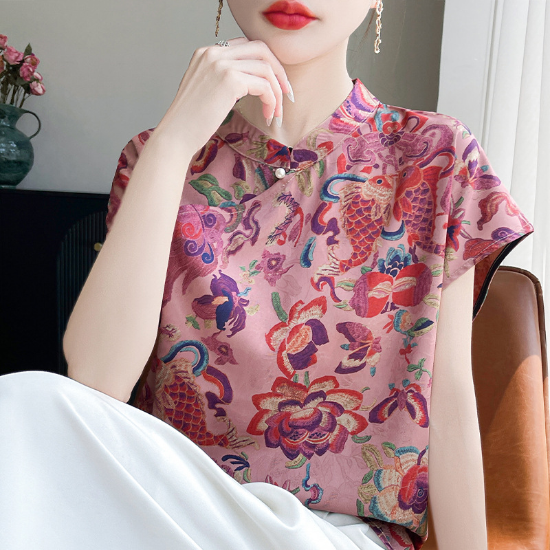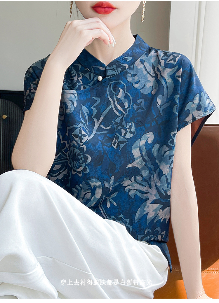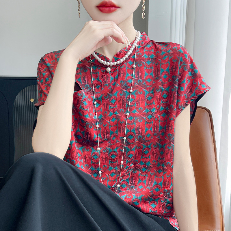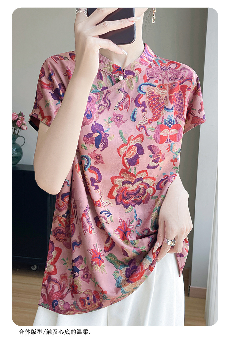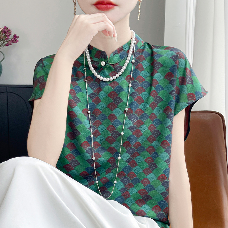 여름 실크 향기로운 구름 원사 인쇄 여성을위한 새로운 중국 스타일 반팔 탑 국가 스타일 개선 된 버튼 치파오 칼라 셔츠 dropshipping스토어 가기