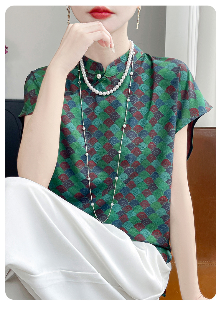 여름 실크 향기로운 구름 원사 인쇄 여성을위한 새로운 중국 스타일 반팔 탑 국가 스타일 개선 된 버튼 치파오 칼라 셔츠 dropshipping