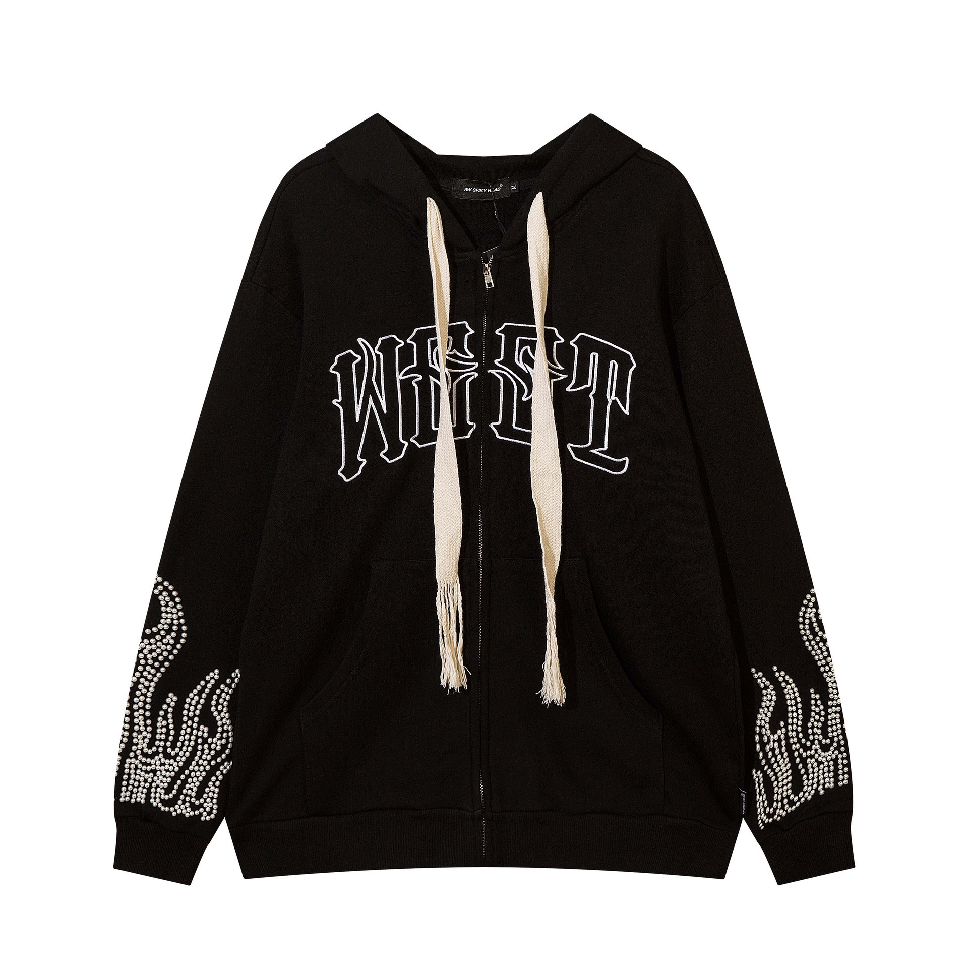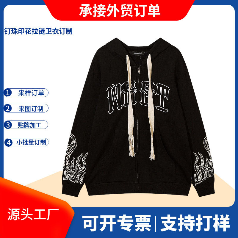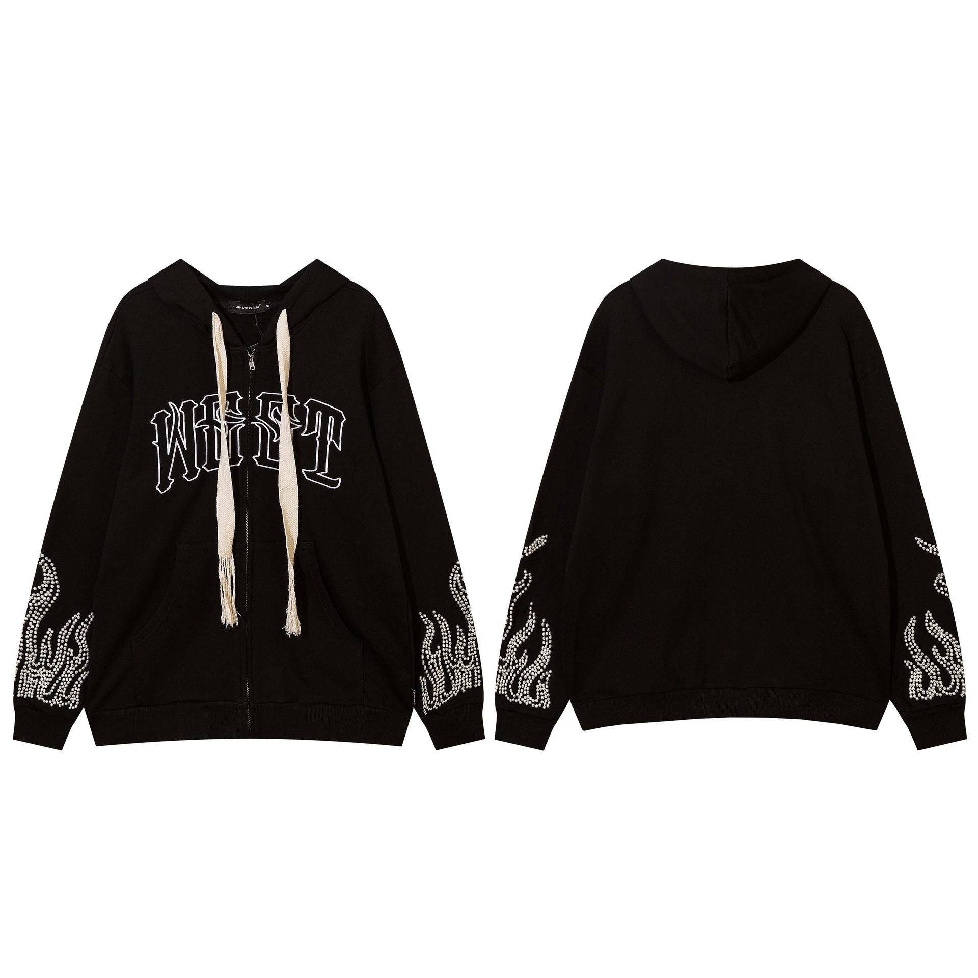 남성용 맞춤형 지퍼 카디건 스웨트셔츠, 하이 스트리트 아메리칸 스타일 비즈 문자 자수 후드 트렌디 루즈 재킷스토어 가기