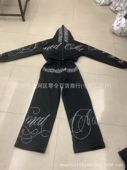 핫픽스 장식이 있는 유럽풍 여름 신상품, 워싱된 긴팔 후드 셔츠, 루즈핏 바지, 일본풍 스웨트셔츠 세트스토어 가기