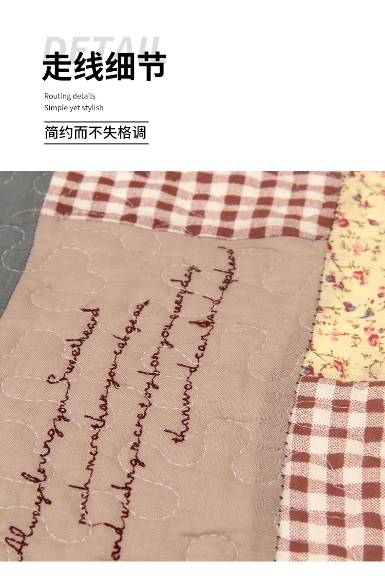 工艺简介:产品出厂前均经过绗缝、砂洗和高温烘干,所以有作旧的风格,色彩上不会很鲜艳。产品在今后几年里不管洗多少次,基本上能保持原样,这是品质的保证。因手工剪切、烘干和预缩影响,尺寸可能会存在1--3CM的误差,不属于质量问题范围。