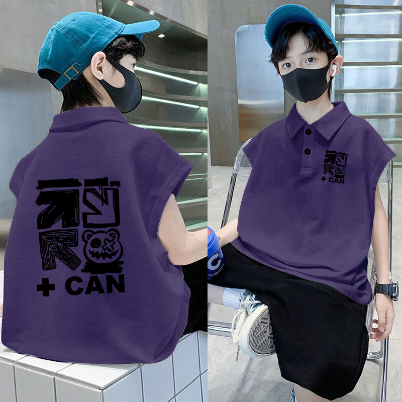 여름 소년 만화 순수 코튼 퍼플 조끼 티셔츠 루즈한 중대형 어린이 6-12 트렌디 라펠 민소매 탑
