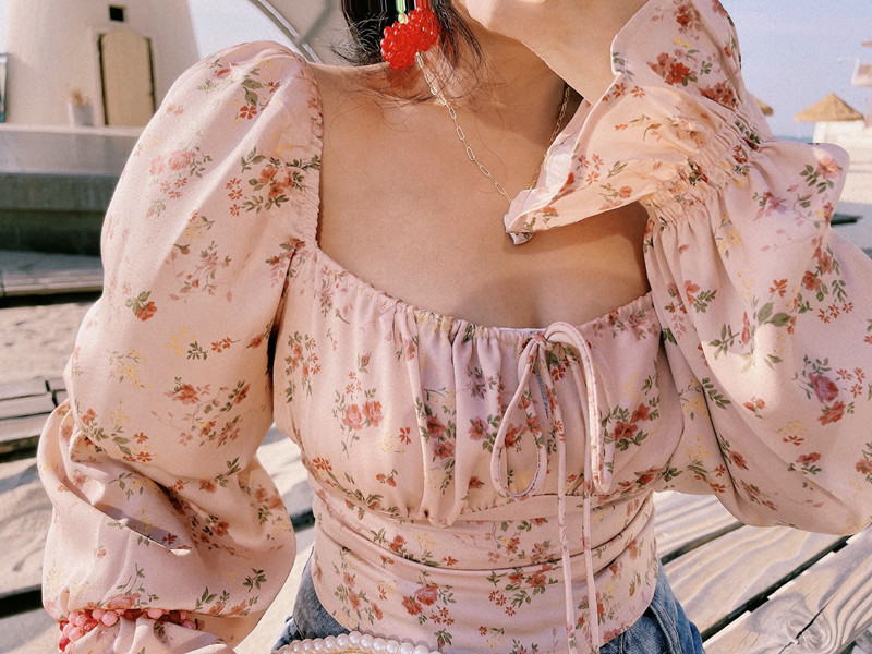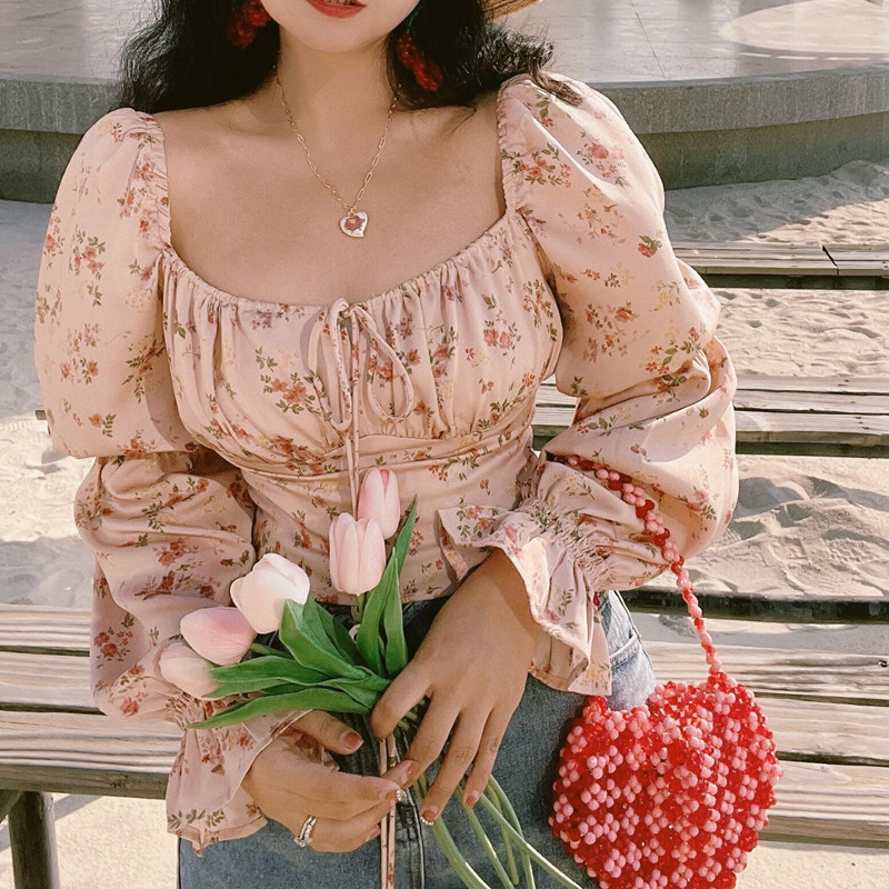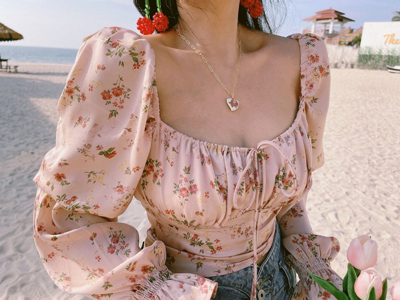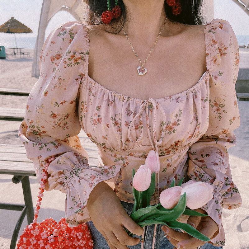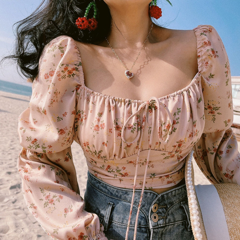 2025년 신상품, 올해 유행하는 핫 아이템, 봄 신상 프렌치 스타일 슬림핏 짧은 꽃무늬 긴팔 셔츠, 달콤한 스타일스토어 가기