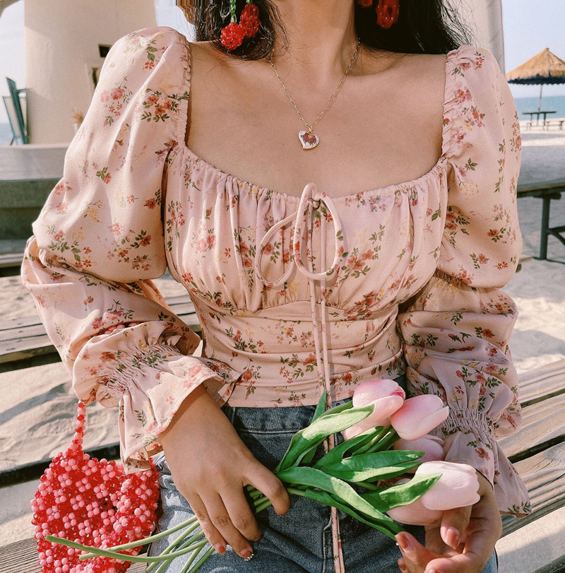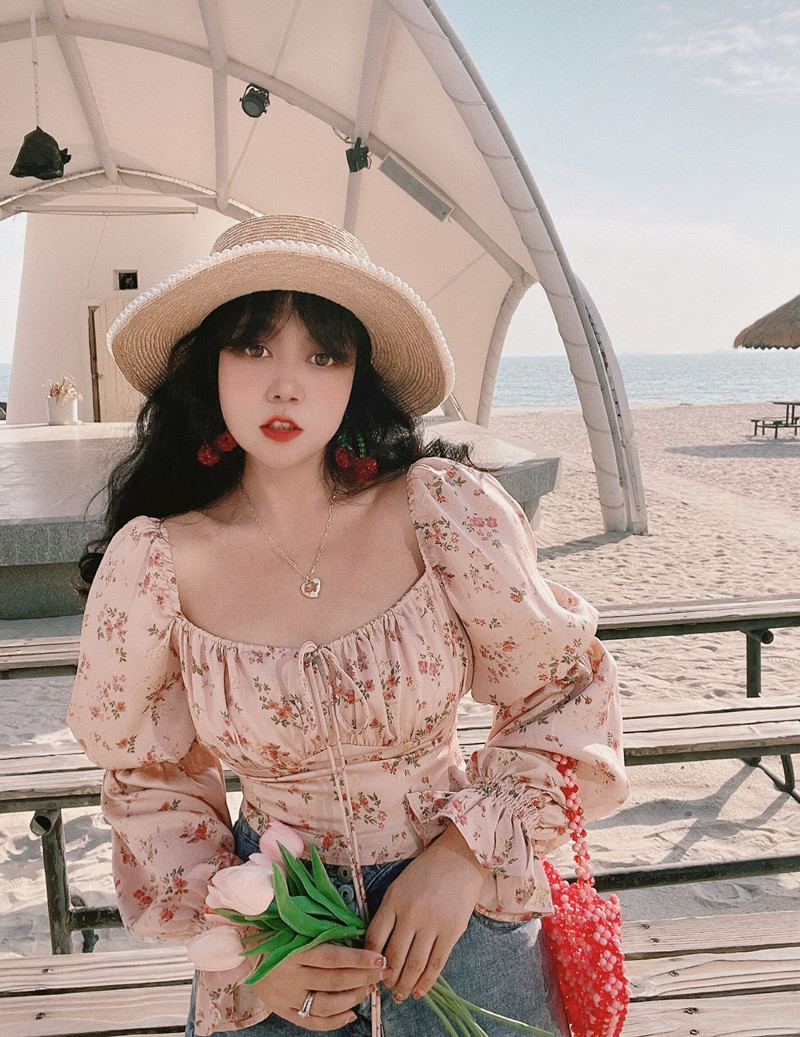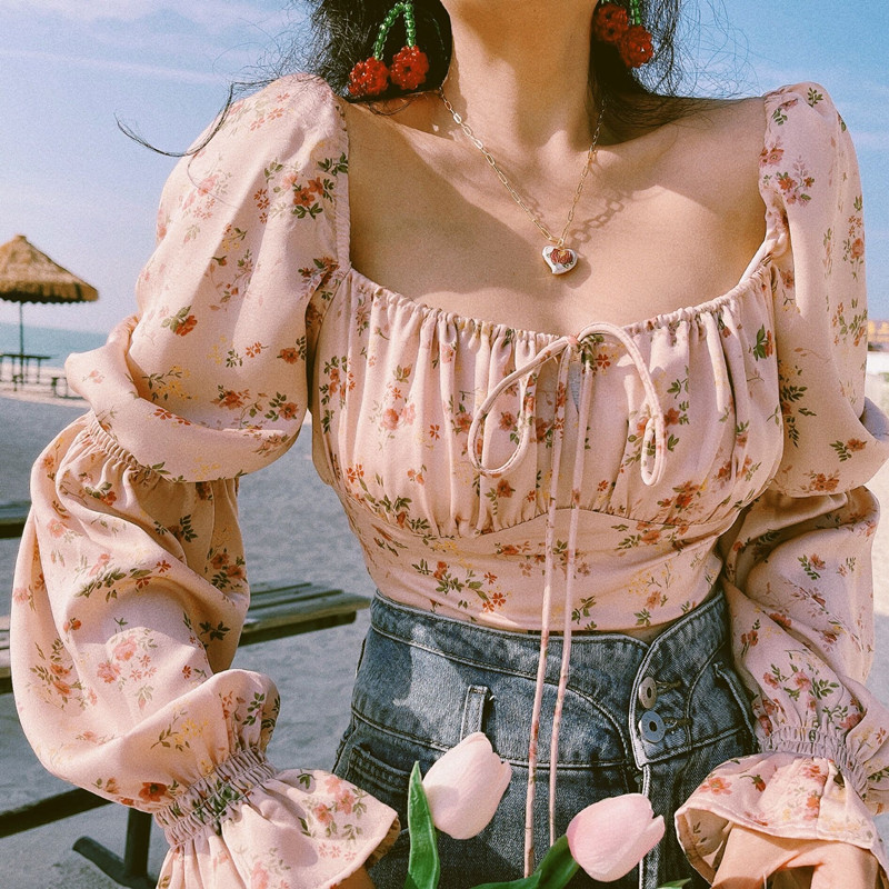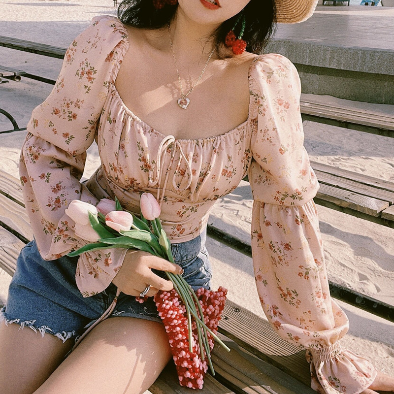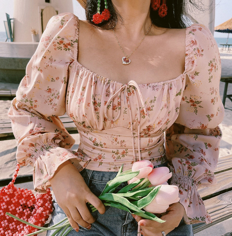 2025년 신상품, 올해 유행하는 핫 아이템, 봄 신상 프렌치 스타일 슬림핏 짧은 꽃무늬 긴팔 셔츠, 달콤한 스타일스토어 가기