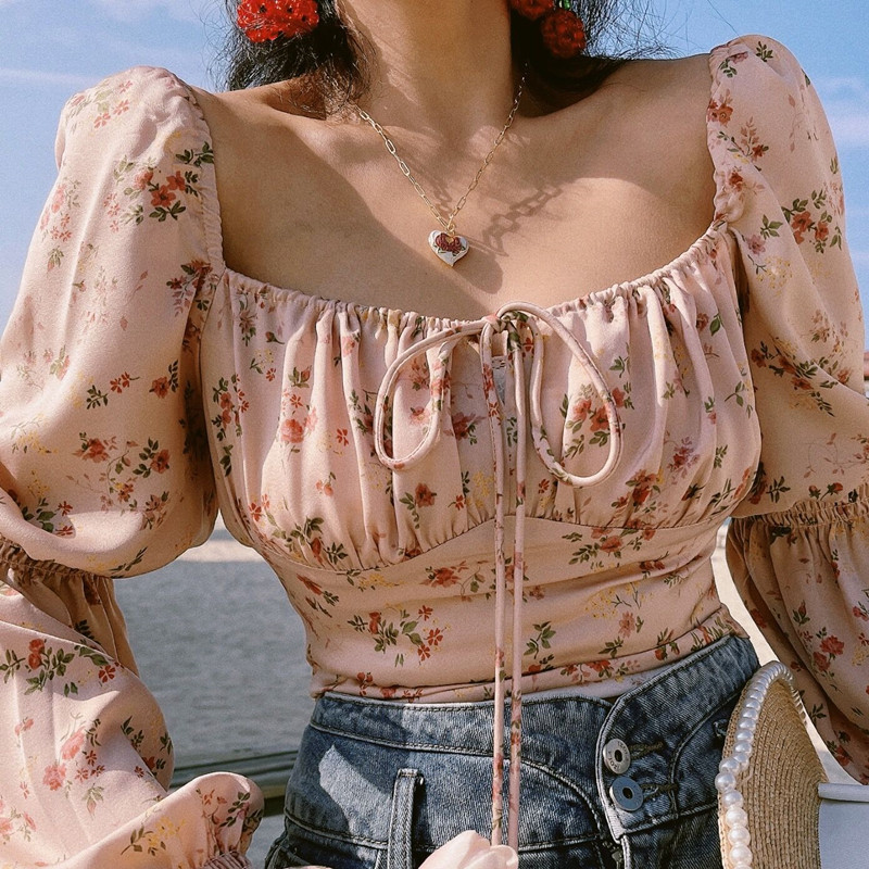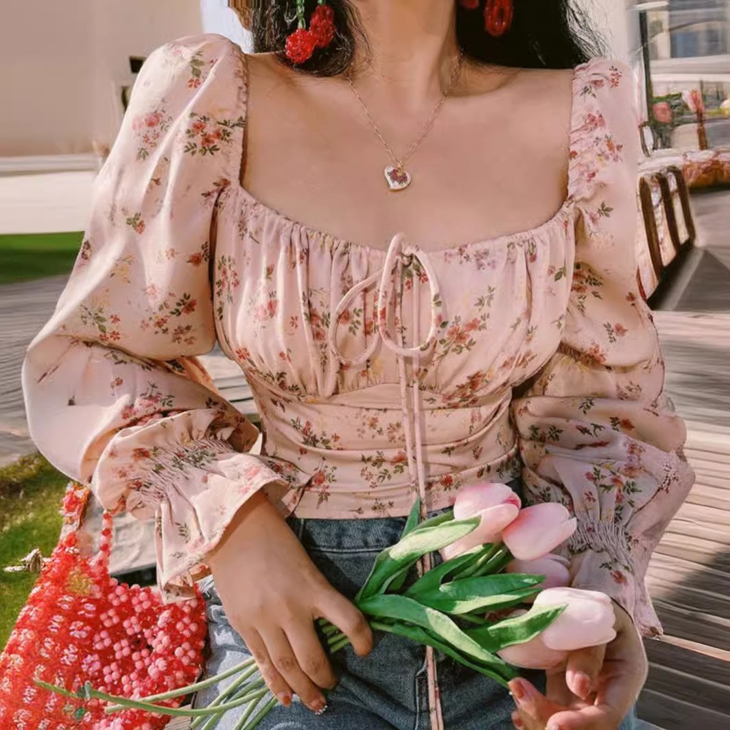 2025년 신상품, 올해 유행하는 핫 아이템, 봄 신상 프렌치 스타일 슬림핏 짧은 꽃무늬 긴팔 셔츠, 달콤한 스타일
