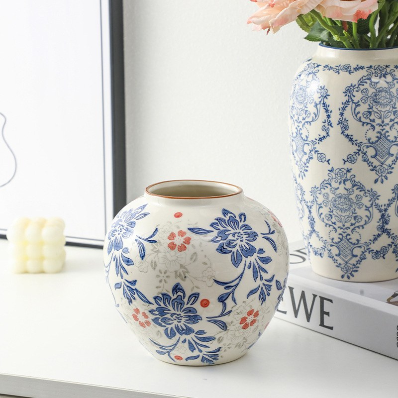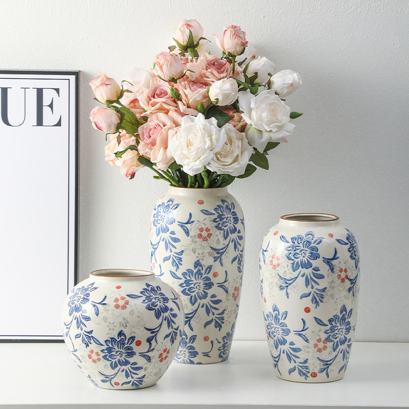 고급 복고풍 새로운 중국 스타일 파란색과 흰색 도자기 꽃병 3 피스 세트 레스토랑 꽃꽂이 홈 장식 장식품
