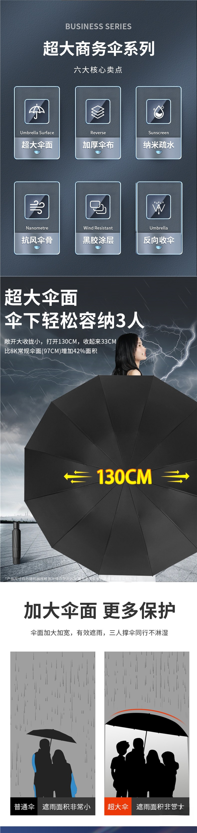 • 비즈니스 블랙️ 강화 12 리브 [특대형 3-4인 우산 + 비가 오나 눈이 오나] 직경 130CM 우산 아래