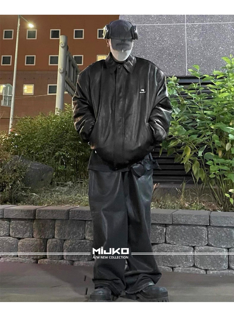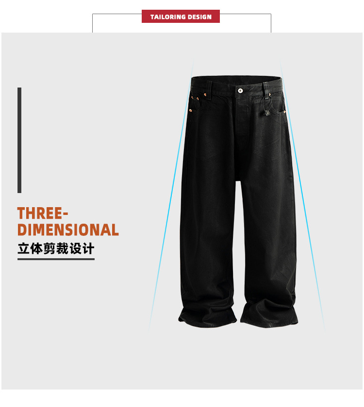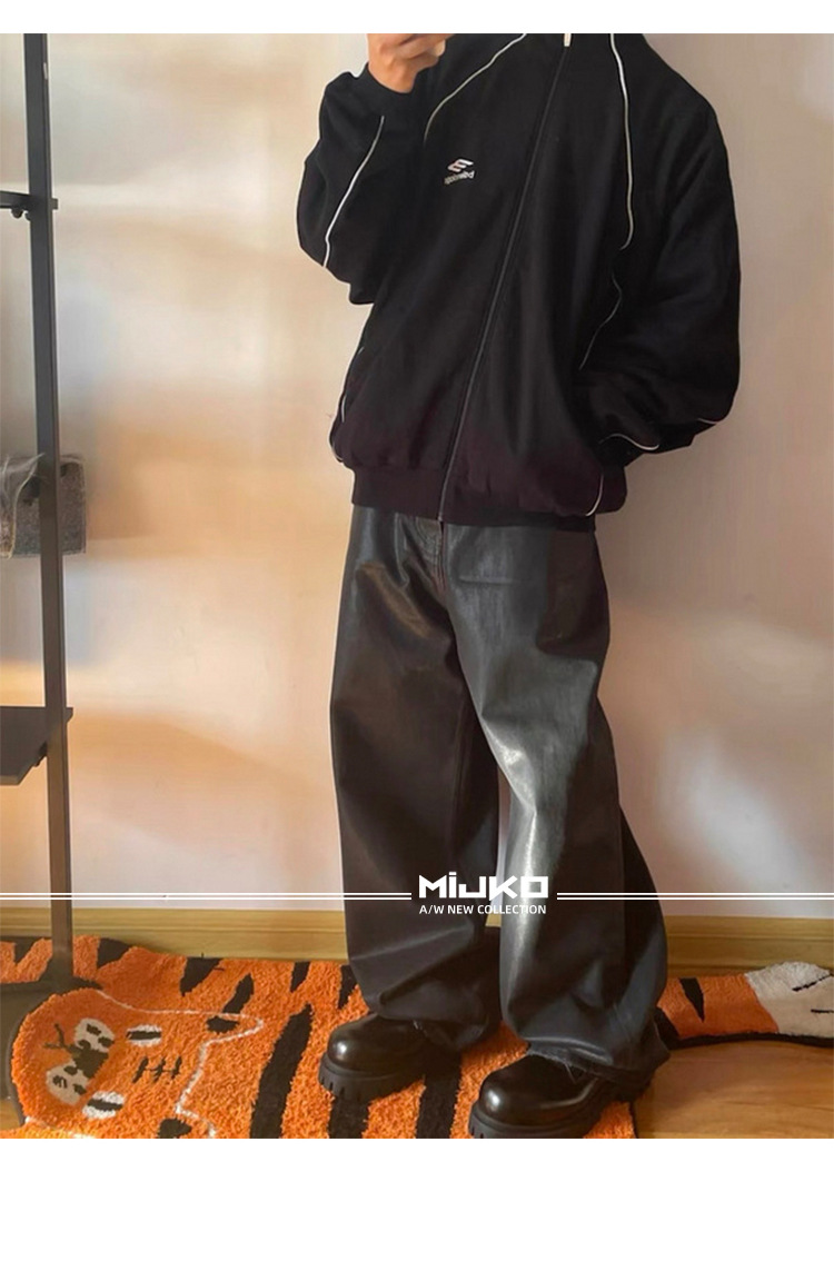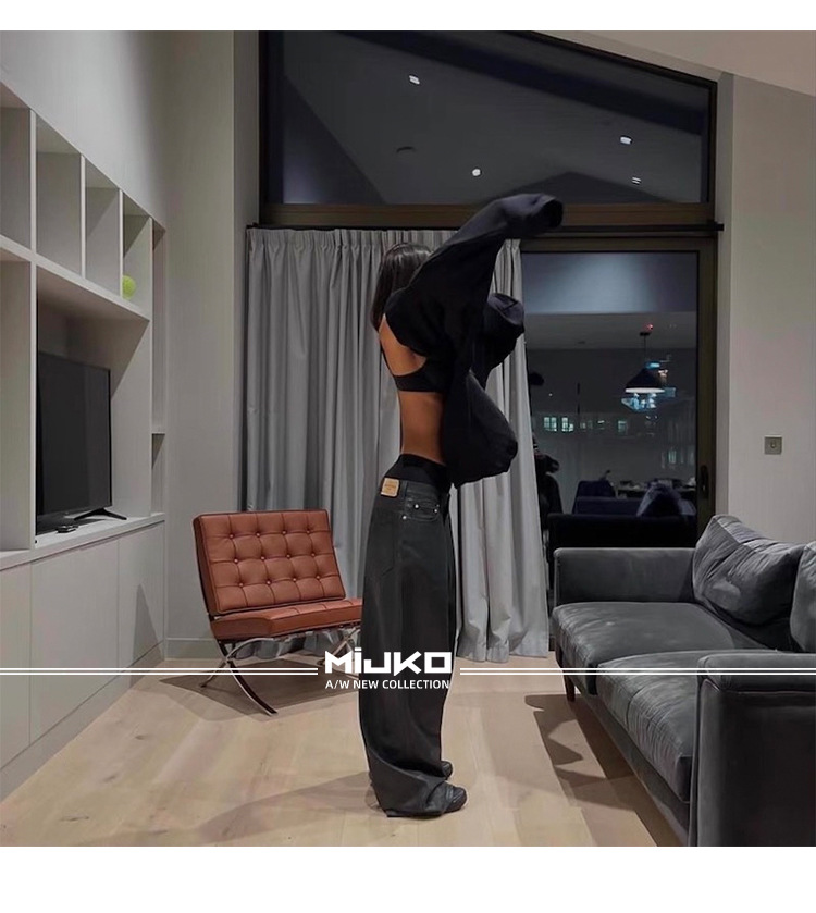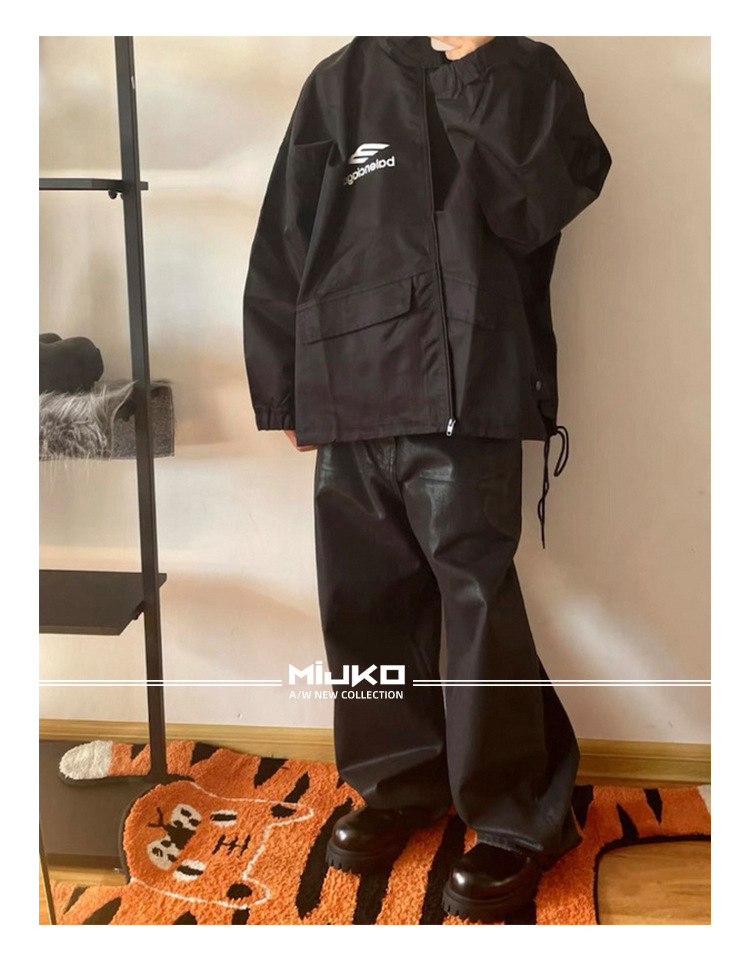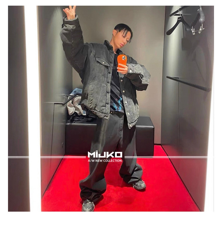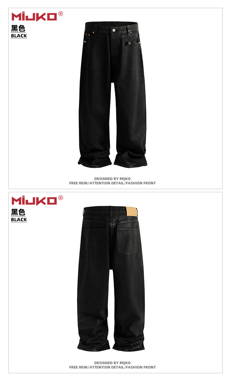 MIJKO 남성 및 여성 블랙 왁스 코팅 실루엣 청바지 남성 및 여성 같은 스타일 스트레이트 아메리칸 유니섹스 바지 트렌디