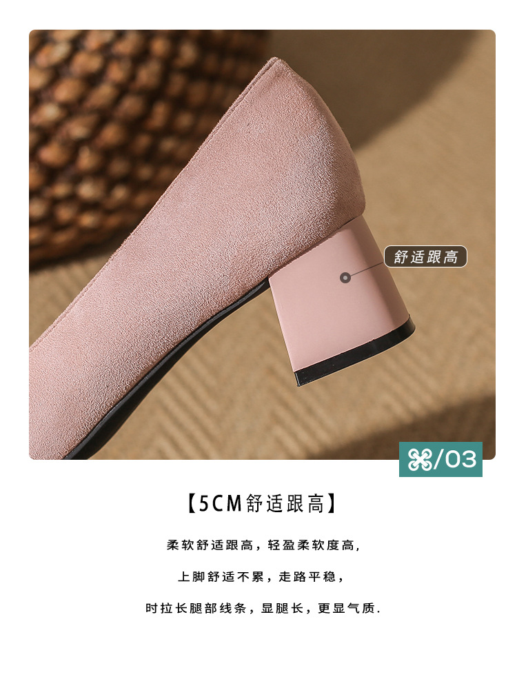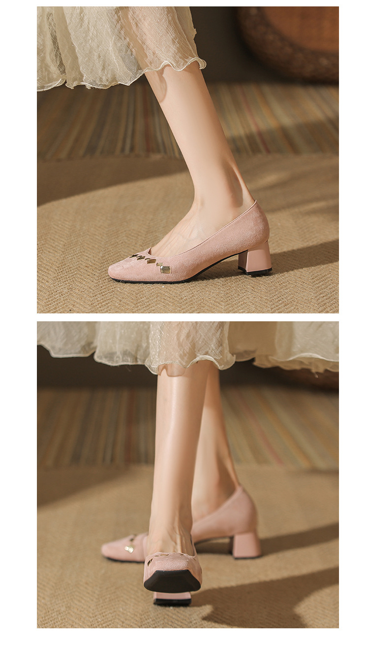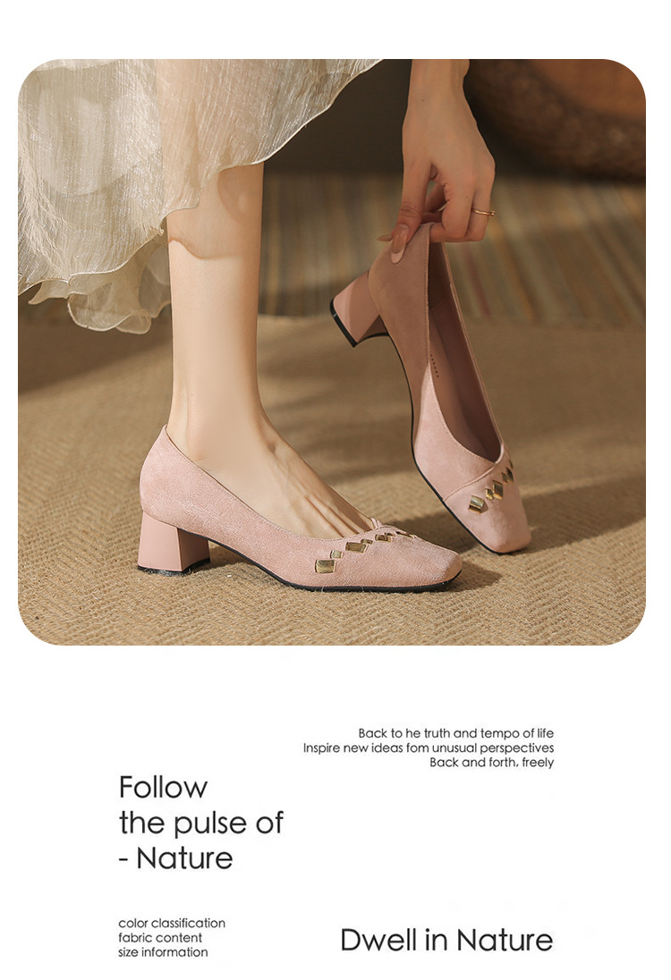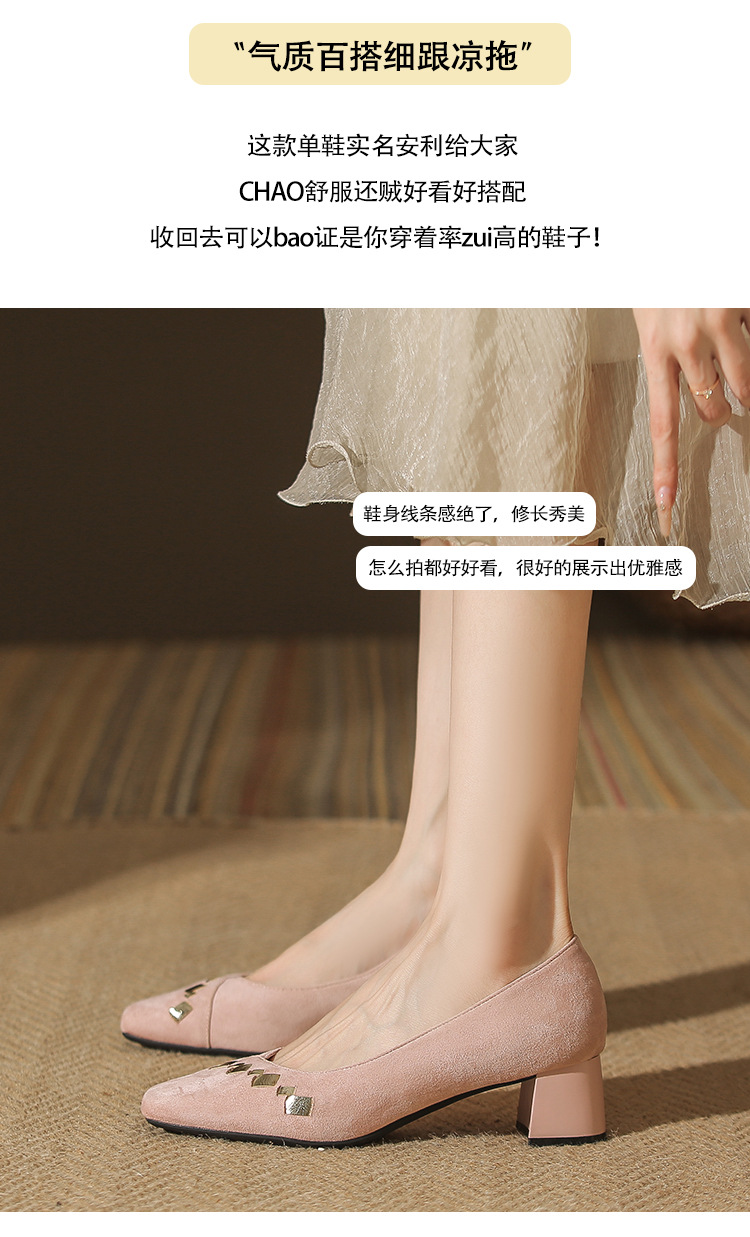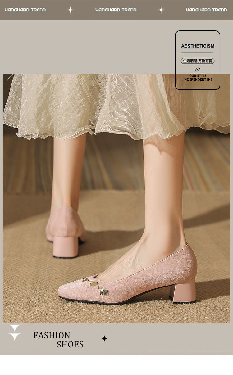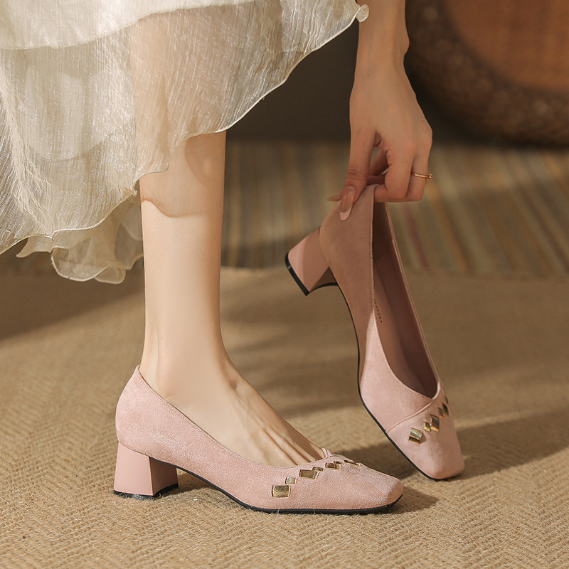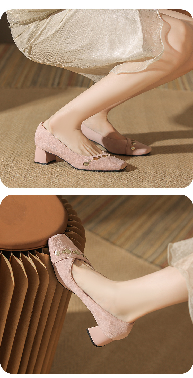 402 봄 여름 신상 여성용 펌프스 슈즈, 두꺼운 굽, 배색, 스웨이드, 편안한 스퀘어 토, 여성용 사계절 슈즈, 미드힐스토어 가기