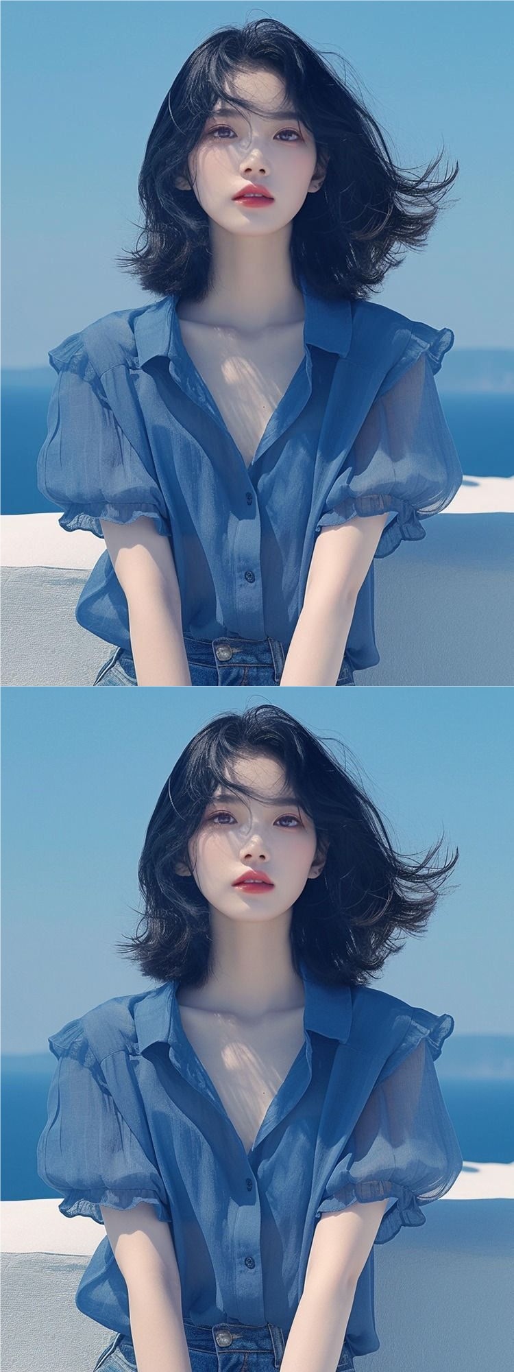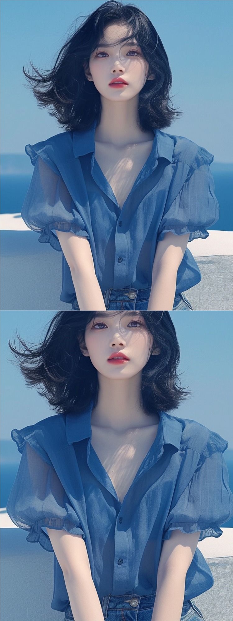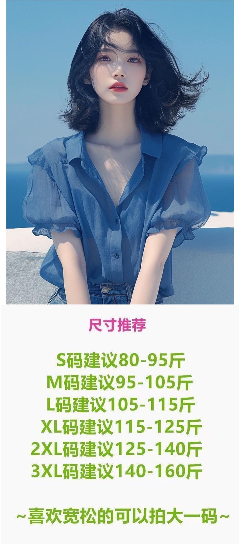 여름 여성을 위한 프렌치 스타일 블루 퍼프 슬리브 쉬폰 셔츠, 새로운 스타일의 살을 커버하고 날씬해 보이는 탑, 나이를 줄여주는 얇은 셔츠스토어 가기
