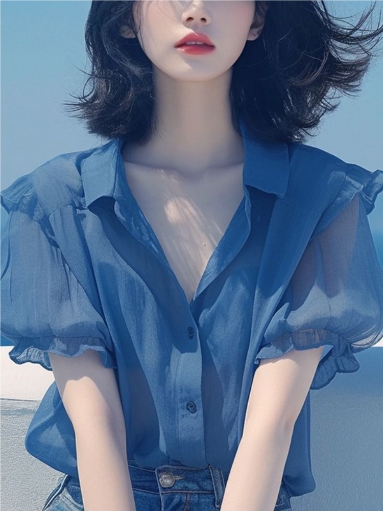 여름 여성을 위한 프렌치 스타일 블루 퍼프 슬리브 쉬폰 셔츠, 새로운 스타일의 살을 커버하고 날씬해 보이는 탑, 나이를 줄여주는 얇은 셔츠