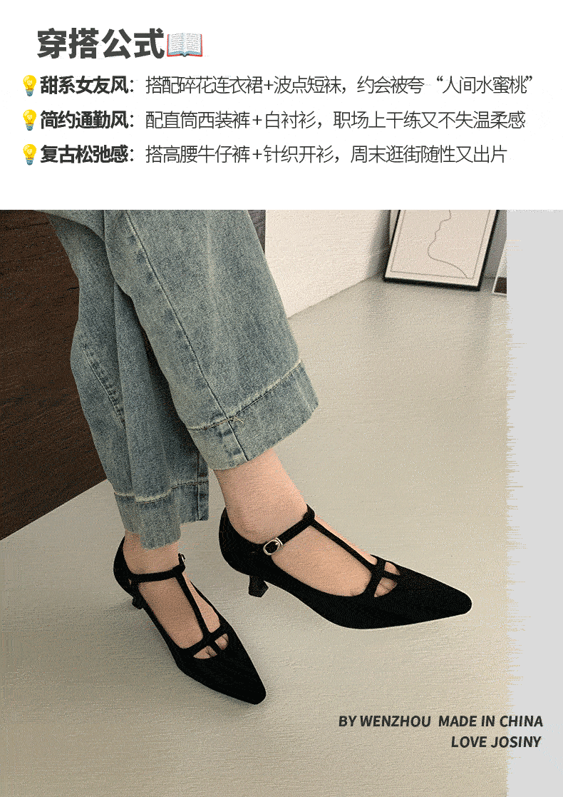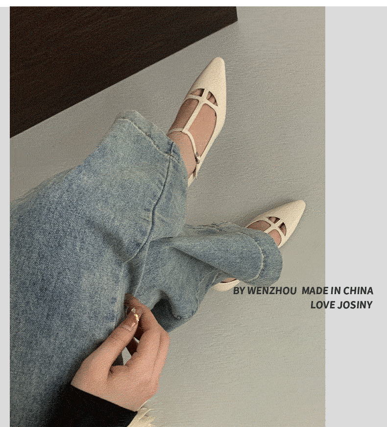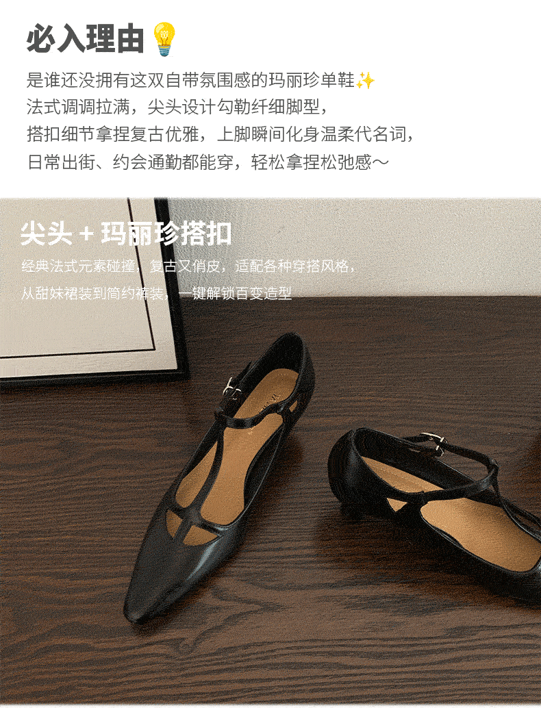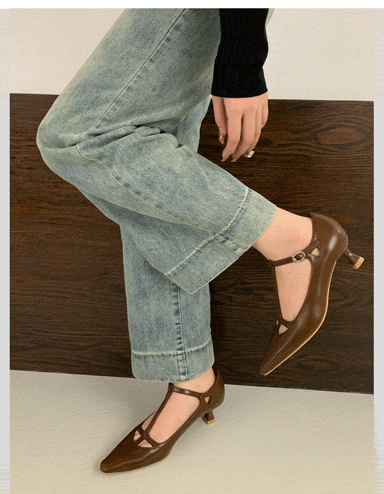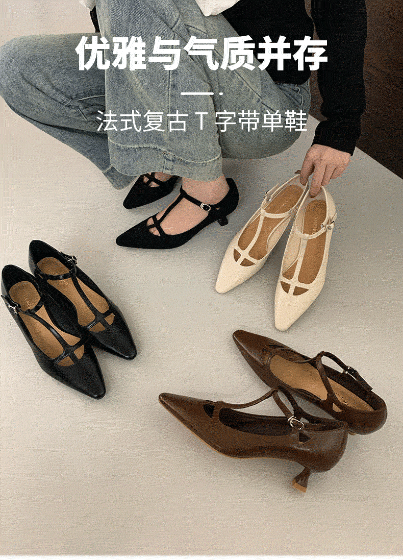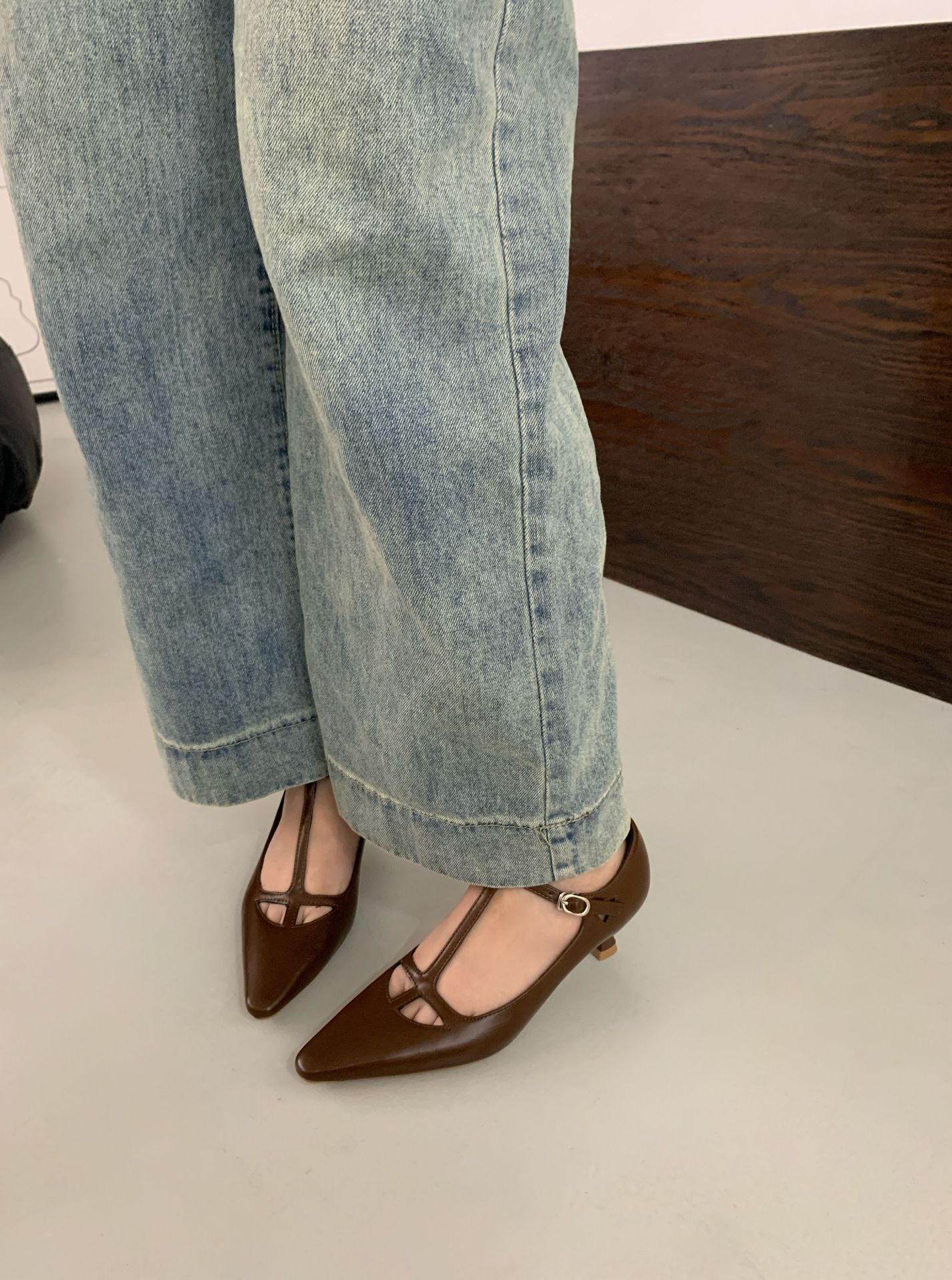오리지널 신상품, 레트로 스타일의 세련된 디자인, 끈이 달린 얕은 굽의 펌프스, 뾰족한 앞코, 얇은 굽, 버클 장식의 메리제인 슈즈스토어 가기