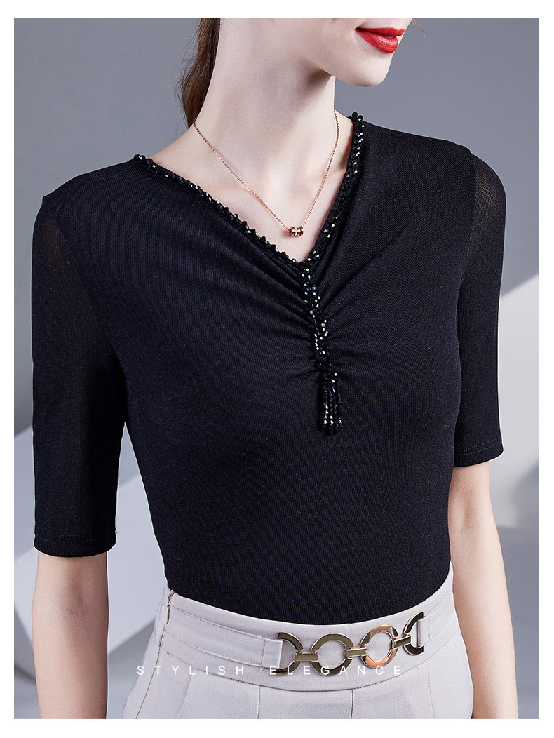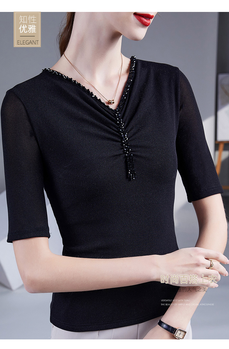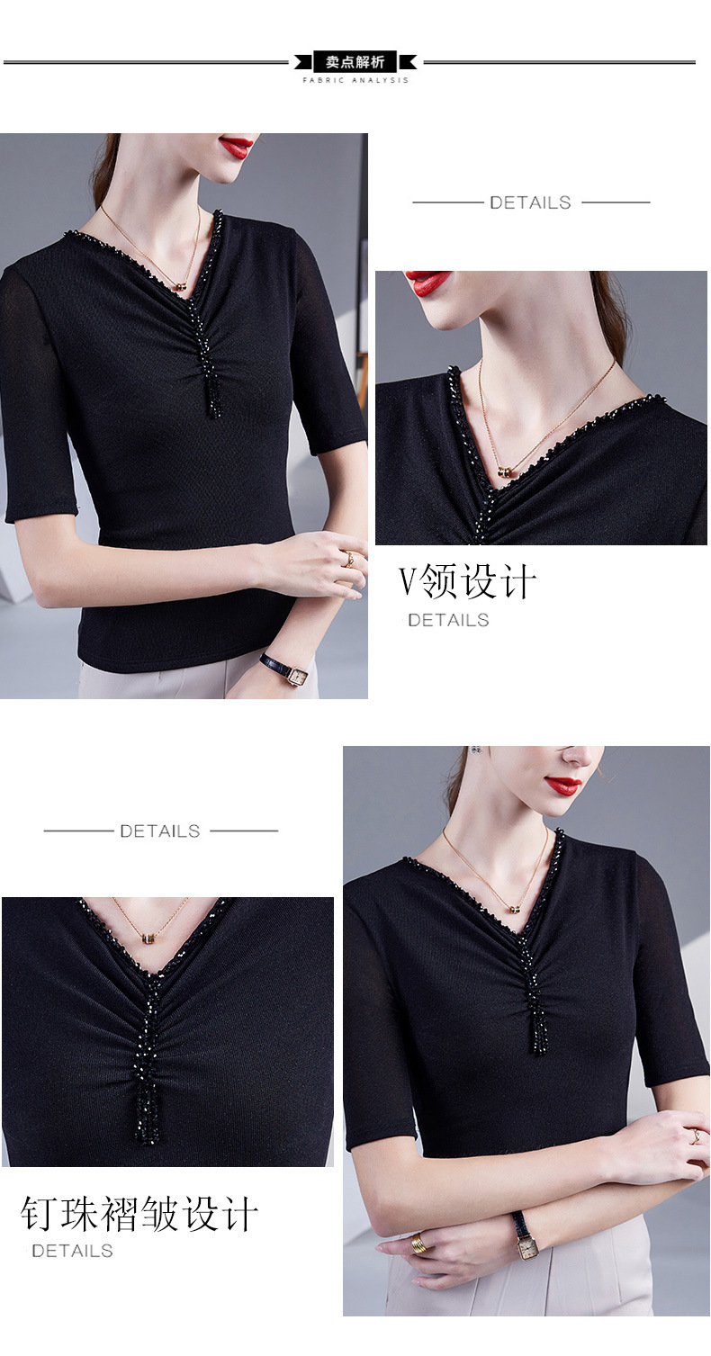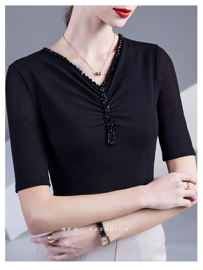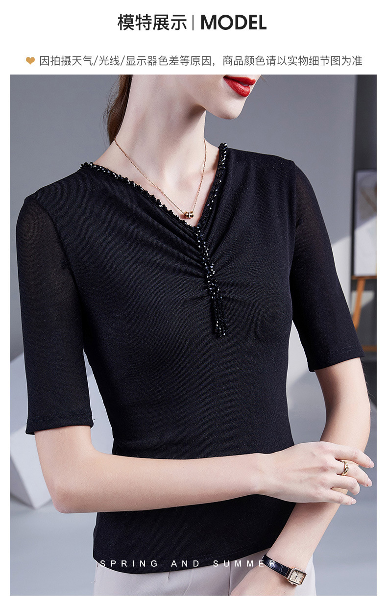 봄 여름 신상 미드슬리브 셔츠, 브이넥 비즈 메쉬 티셔츠, 여성용 5부소매 이너 레이어드 셔츠, 슬리밍 탑, 트렌디스토어 가기