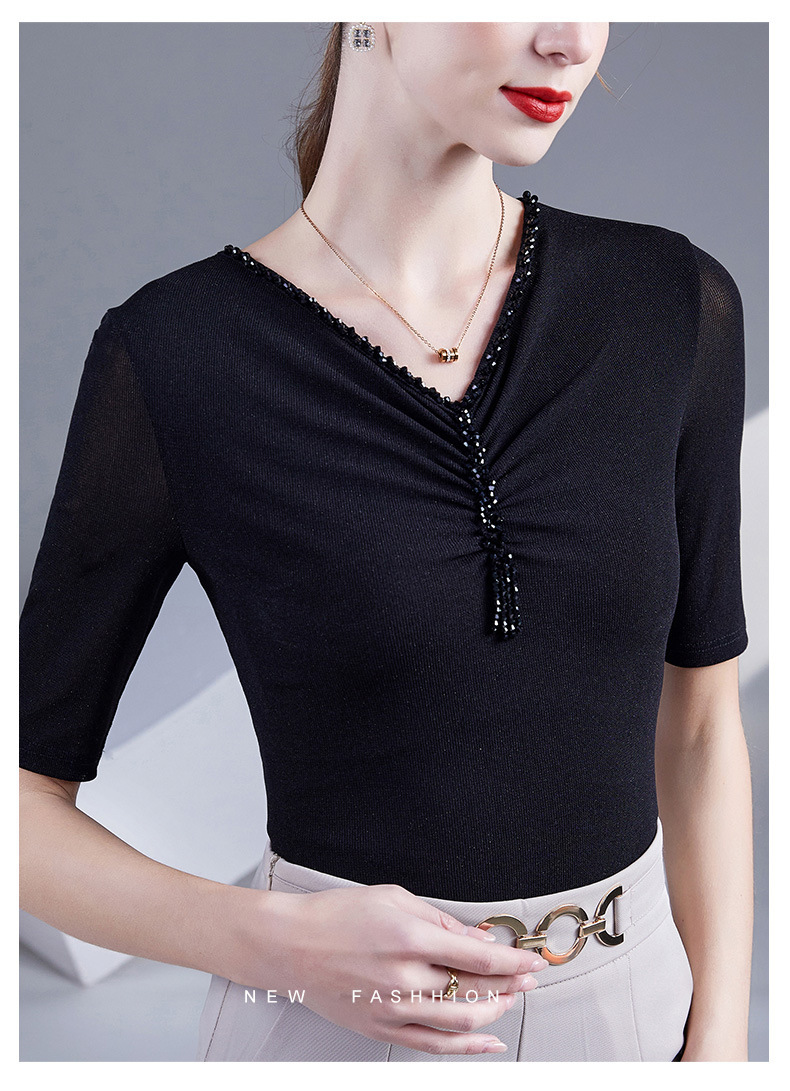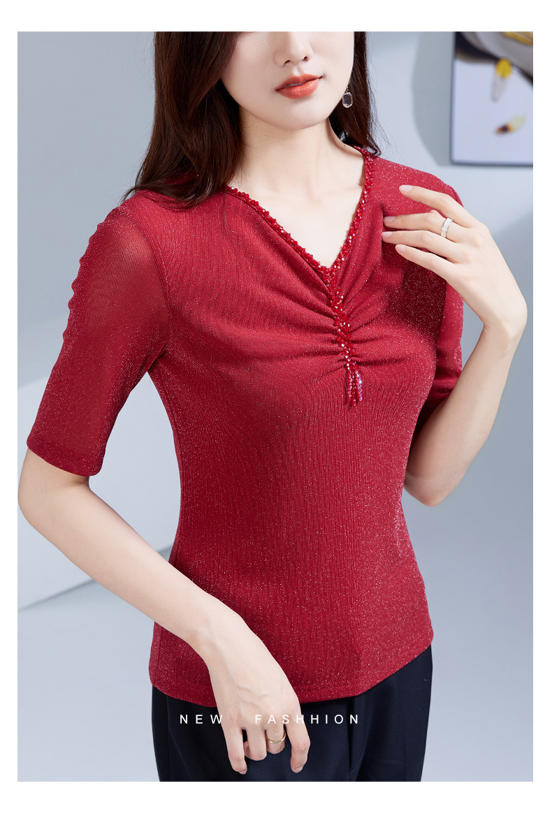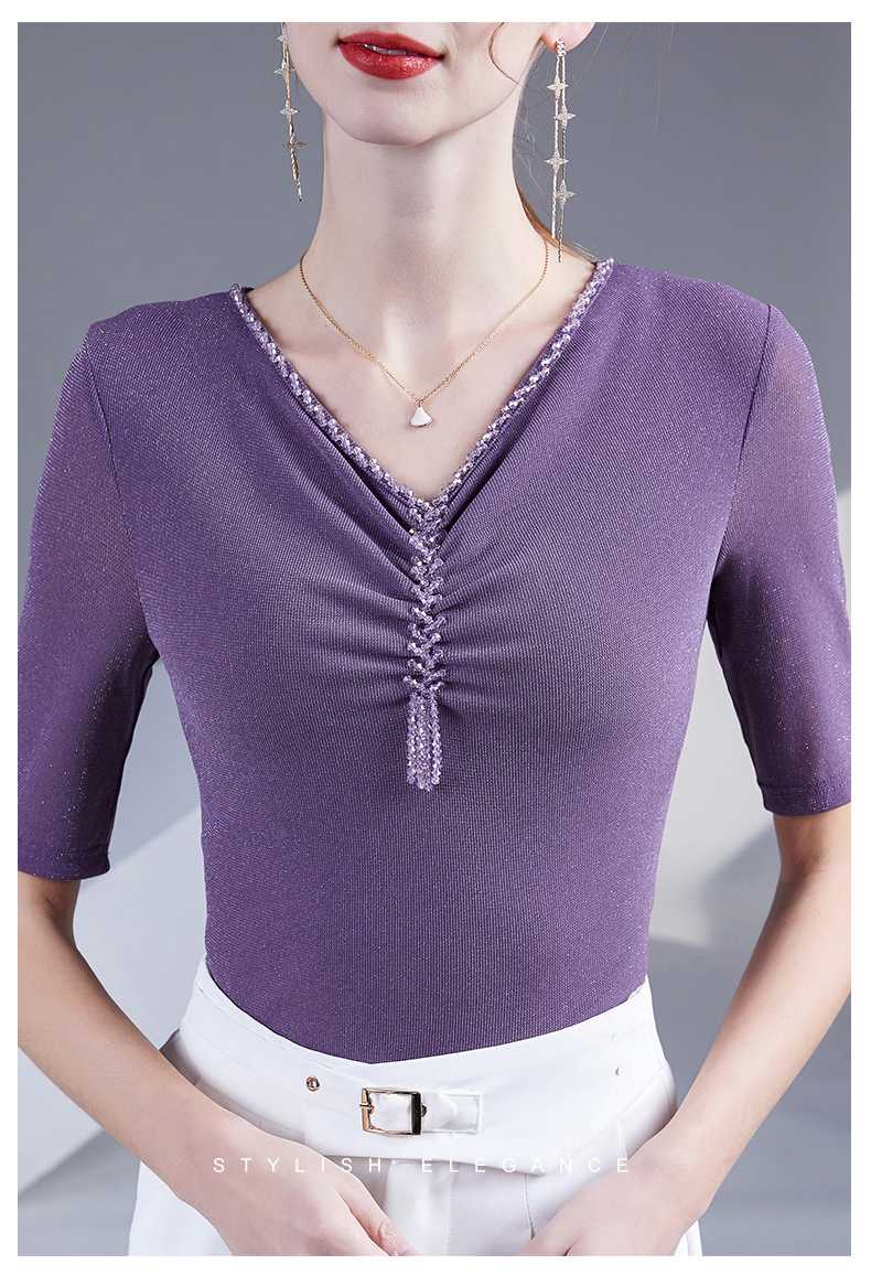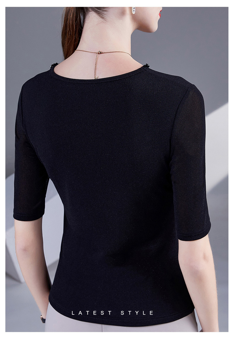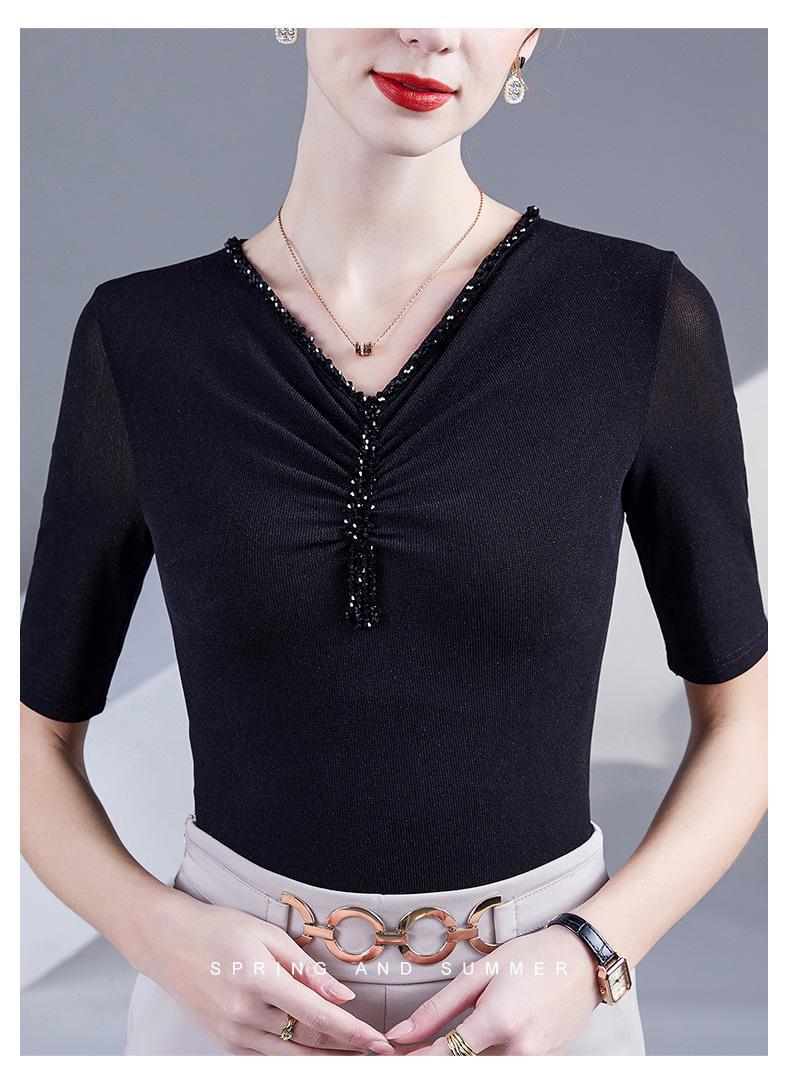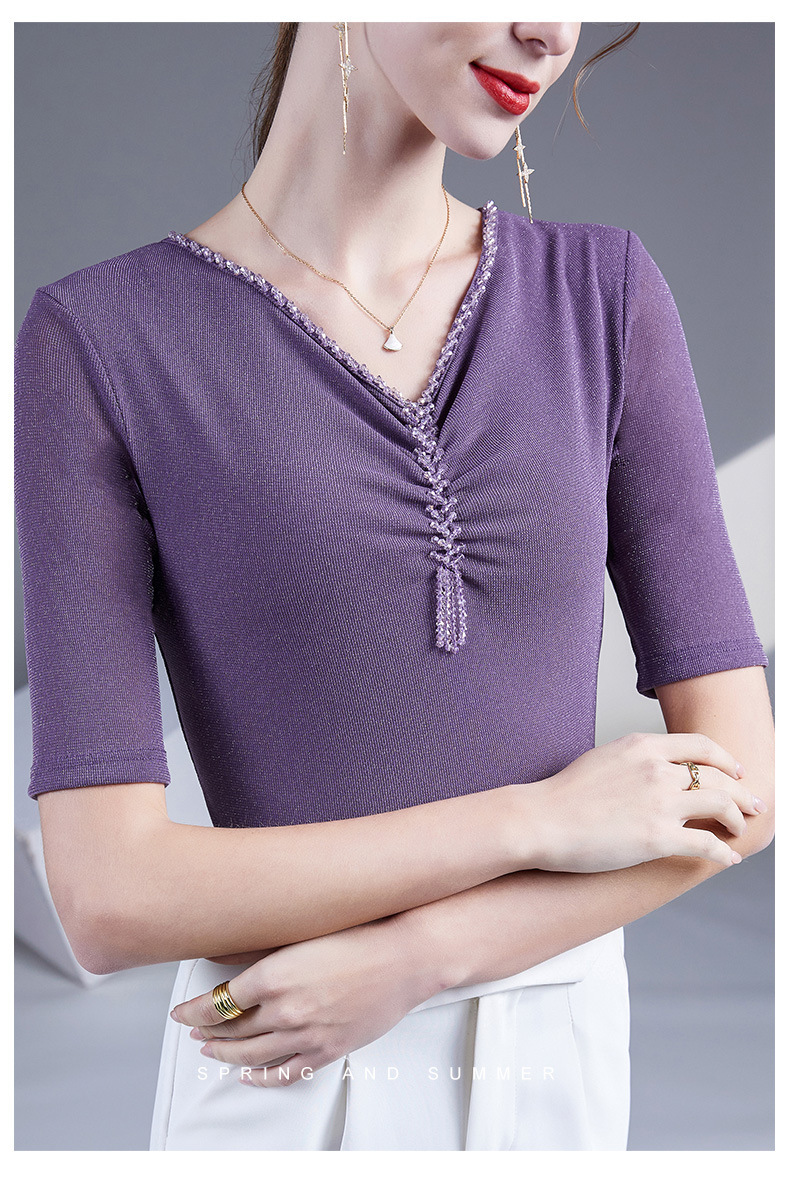 봄 여름 신상 미드슬리브 셔츠, 브이넥 비즈 메쉬 티셔츠, 여성용 5부소매 이너 레이어드 셔츠, 슬리밍 탑, 트렌디스토어 가기