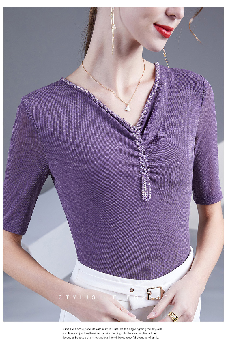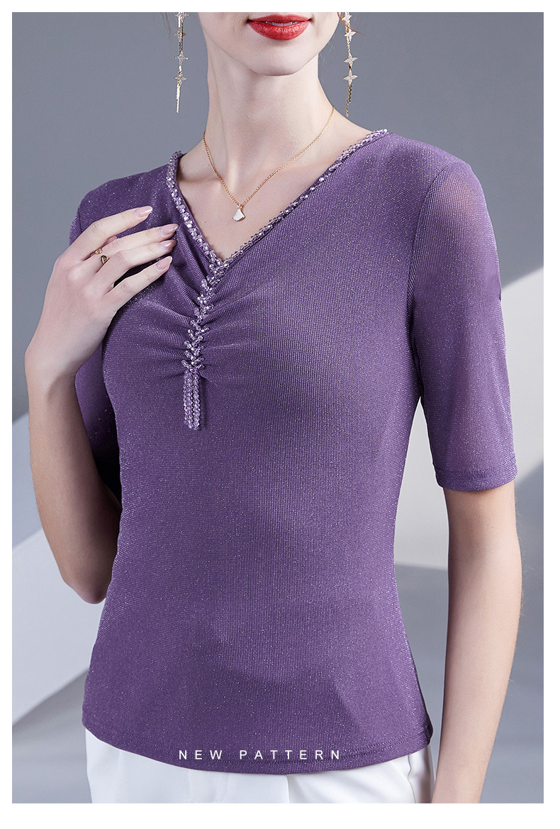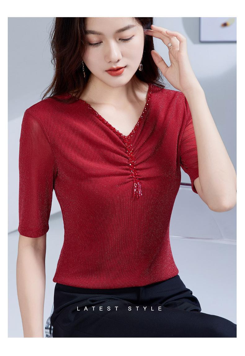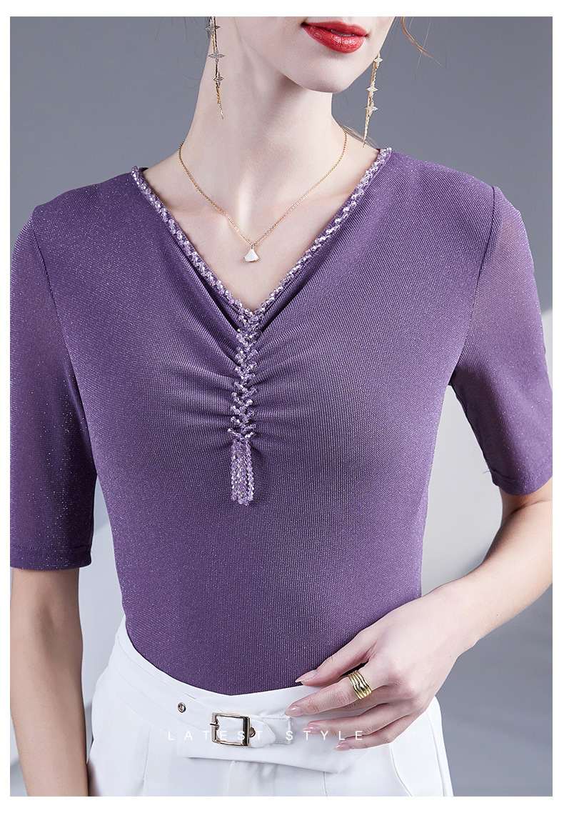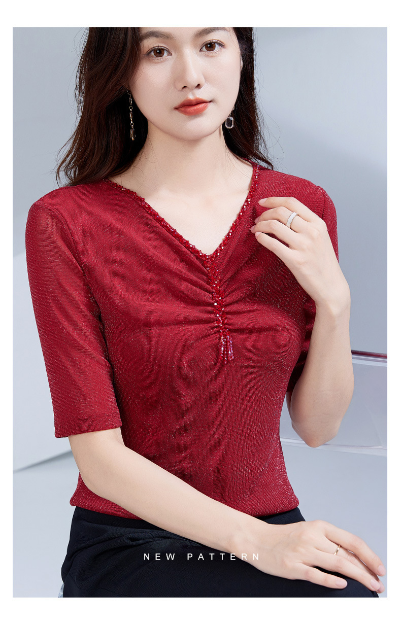 봄 여름 신상 미드슬리브 셔츠, 브이넥 비즈 메쉬 티셔츠, 여성용 5부소매 이너 레이어드 셔츠, 슬리밍 탑, 트렌디스토어 가기