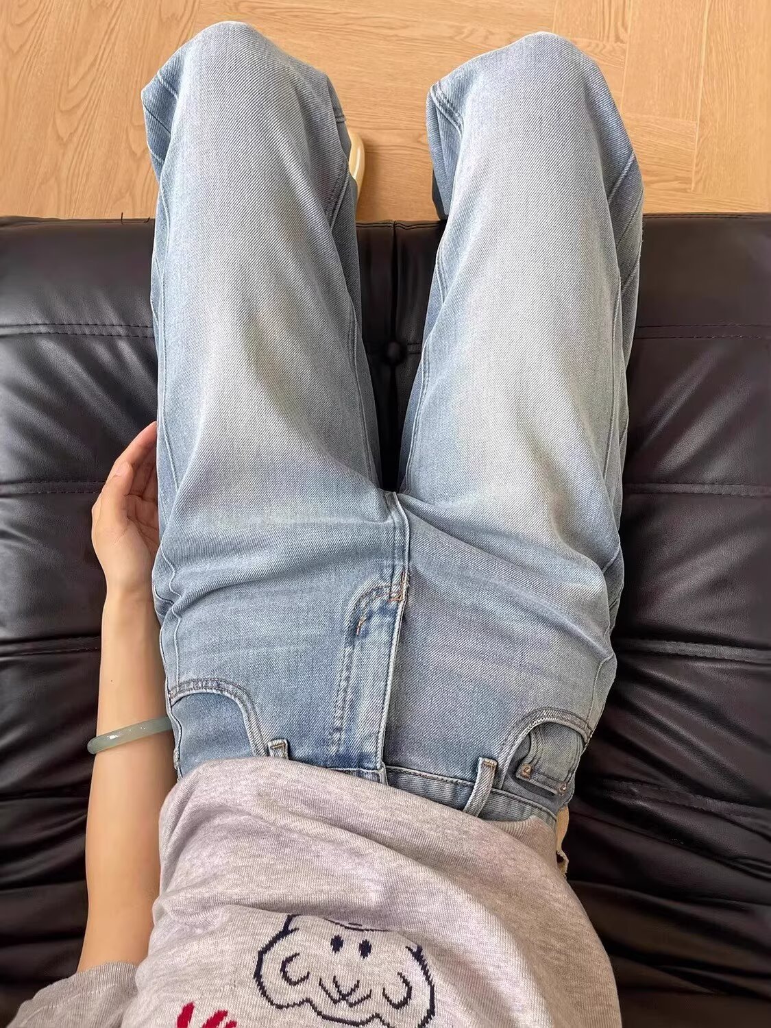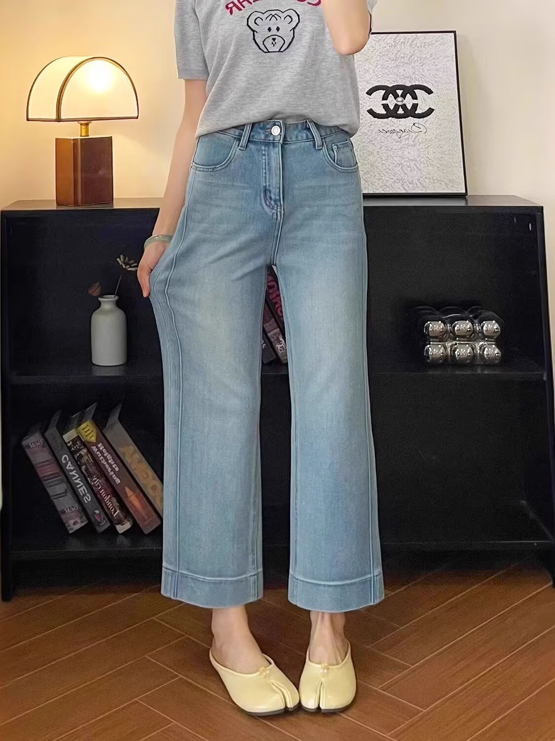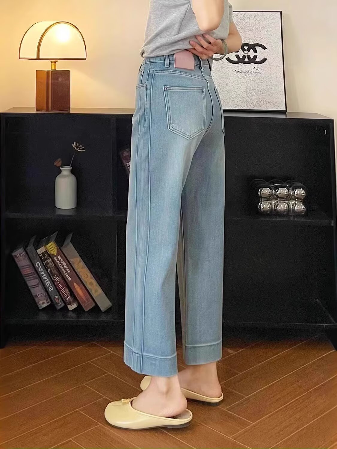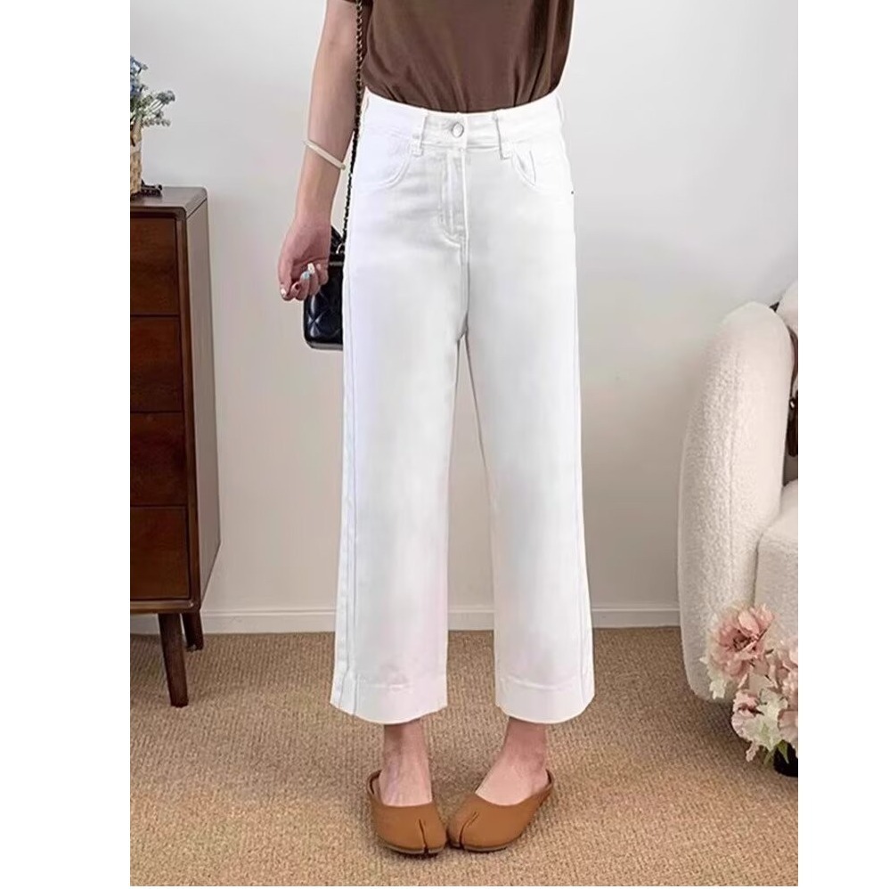 여름 여성용 유럽 라이트 블루 하이 웨이스트 스트레이트 청바지 루즈 슬리밍 스트레치 슬리밍 9 점 캐주얼 와이드 레그 팬츠스토어 가기
