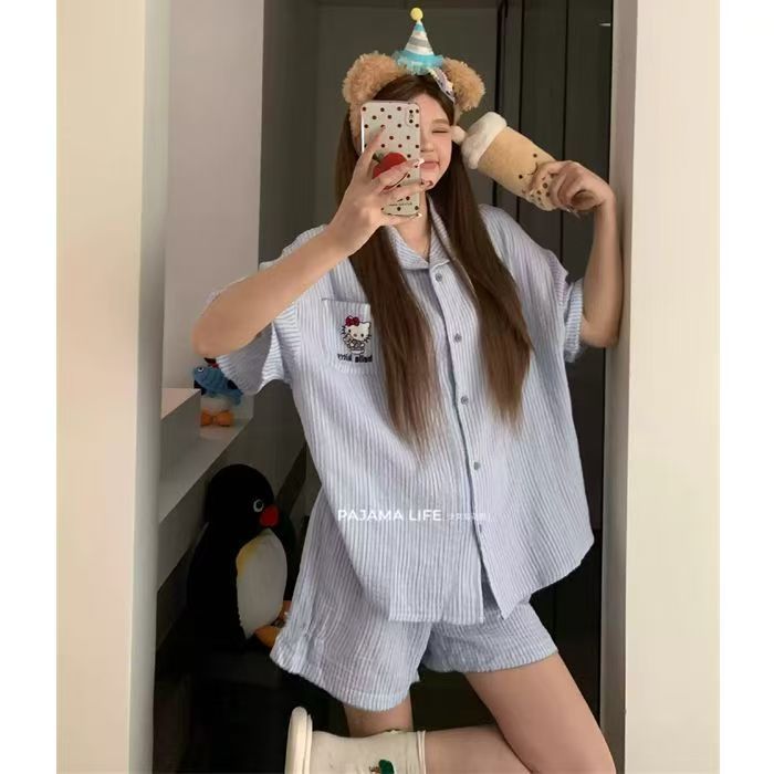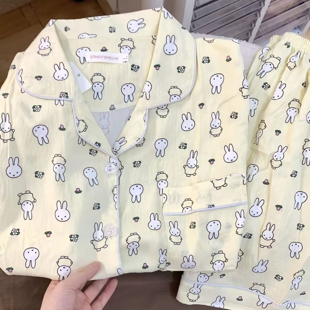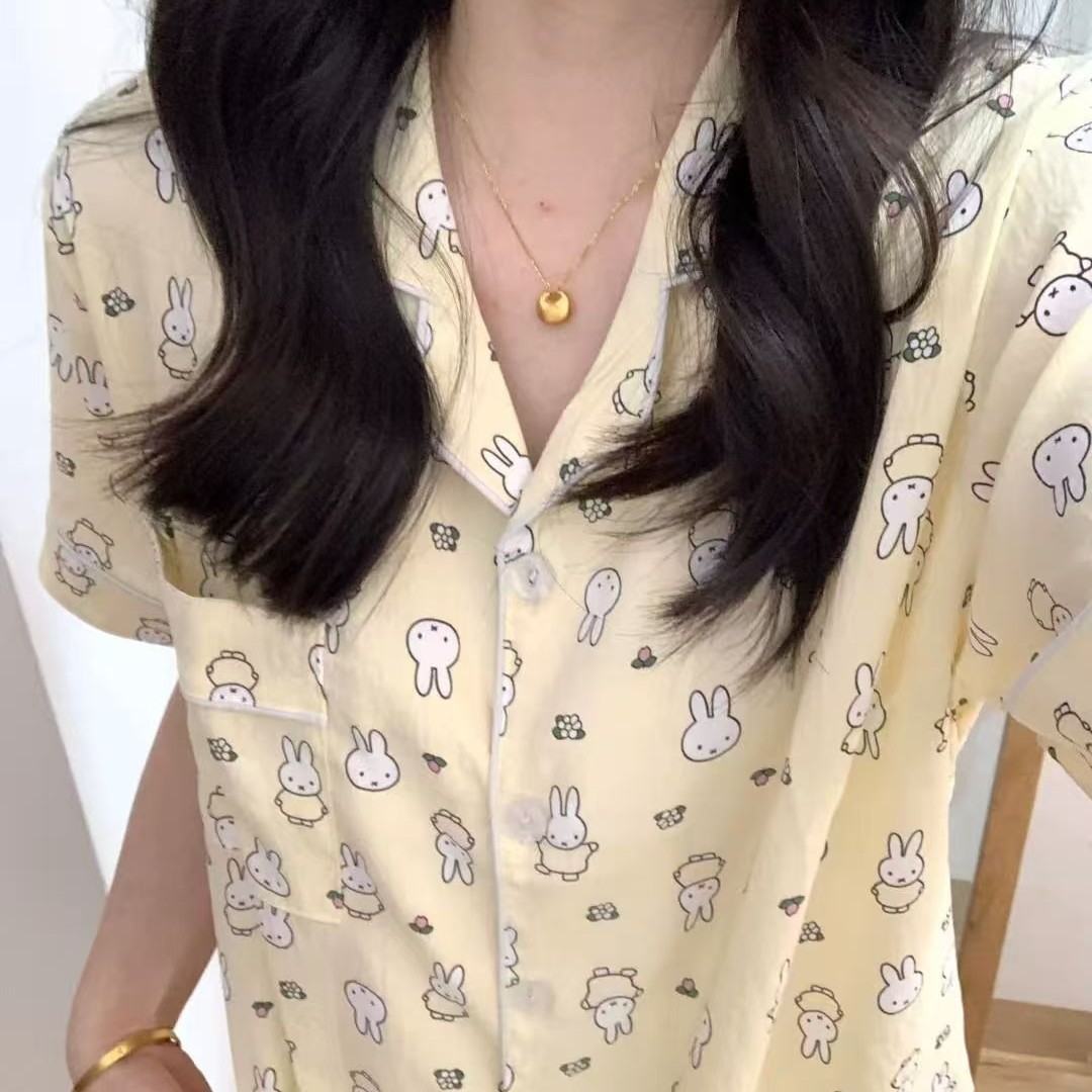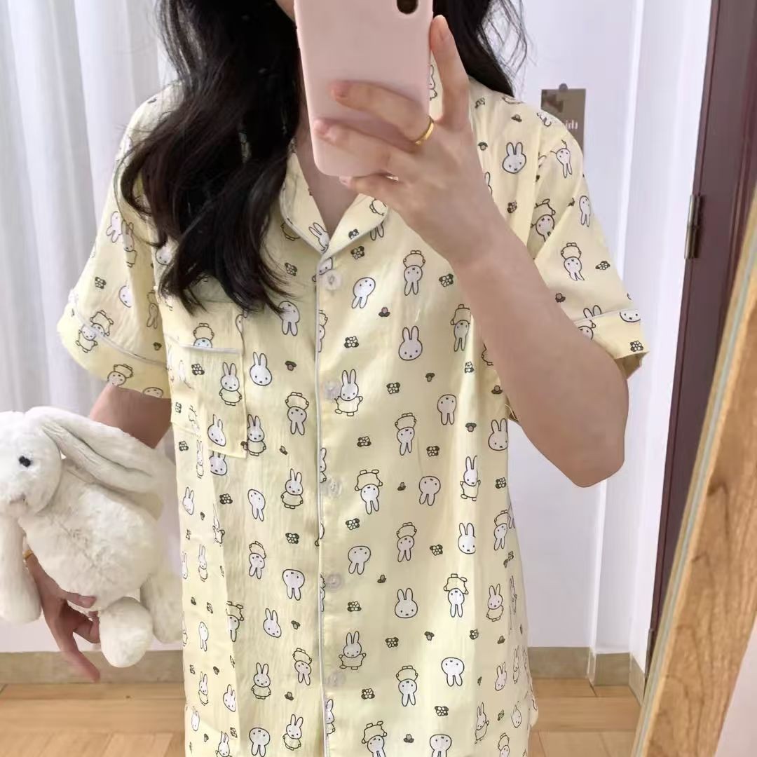 여름 반팔 반바지가 포함된 여성을 위한 매우 귀여운 커스터드 토끼 잠옷, 학생 기숙사용 달콤한 양복, 집 밖에서 입을 수 있는 옷스토어 가기