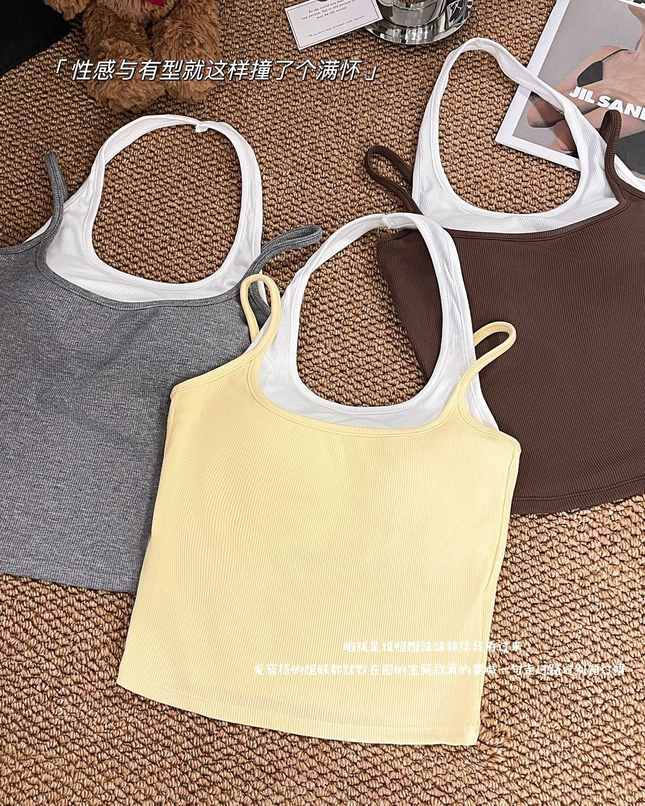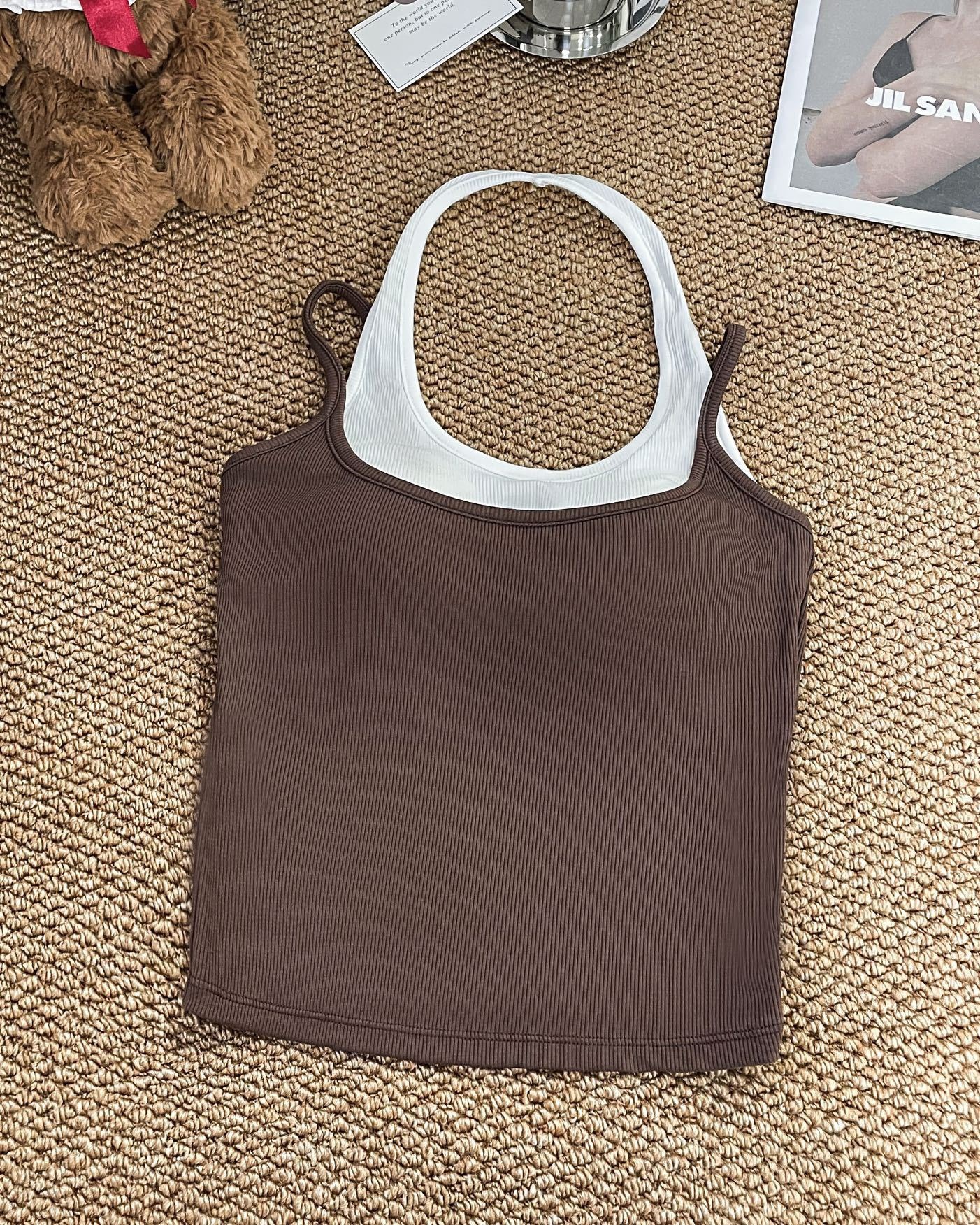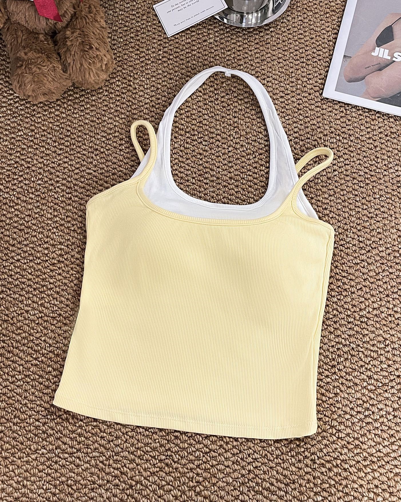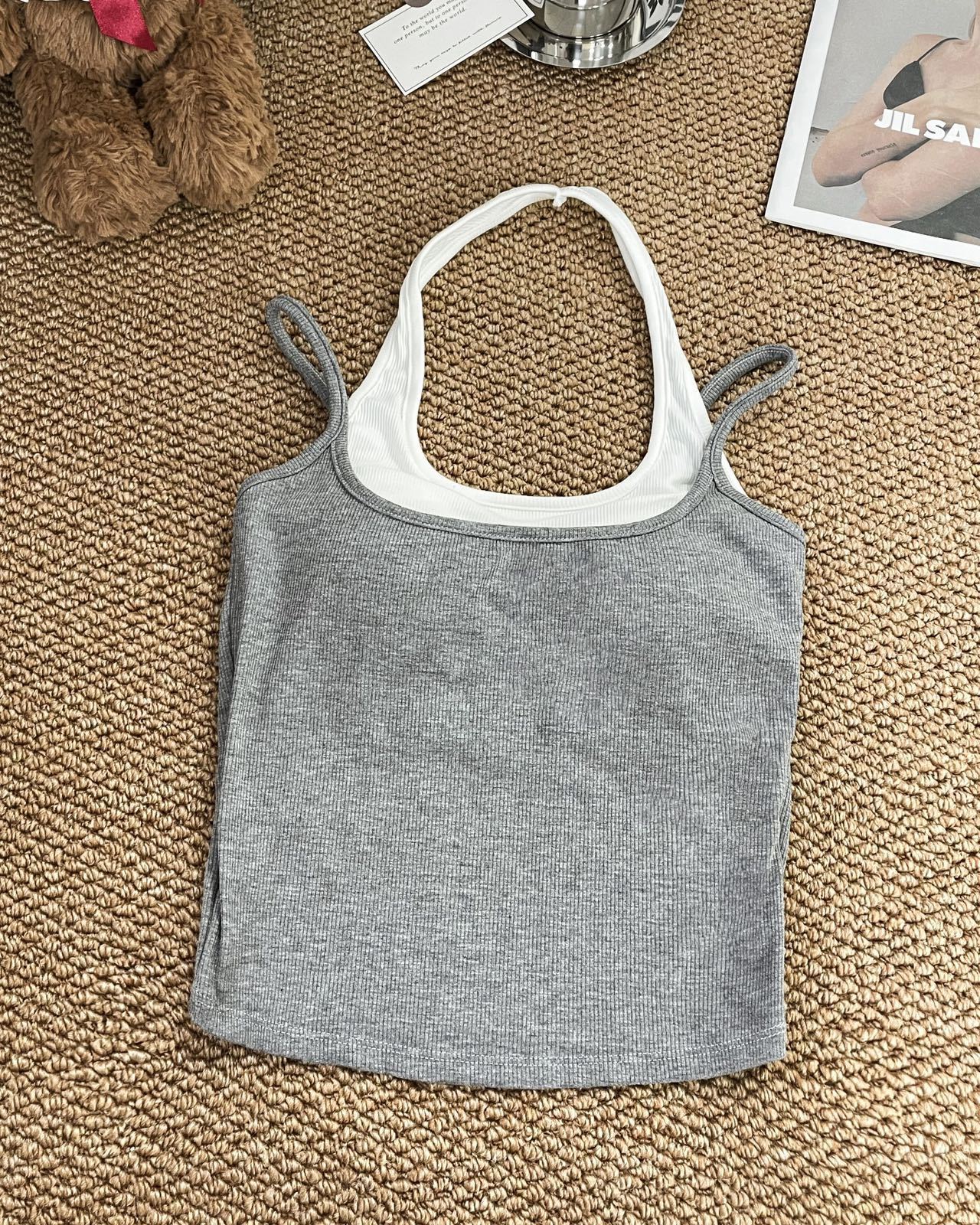 R991입니다. # 도파민 타이 스타일 홀터넥 페이크 투피스 캐미솔 신상 올인원 아름다운 등 숏탑 가슴 패드 포함스토어 가기