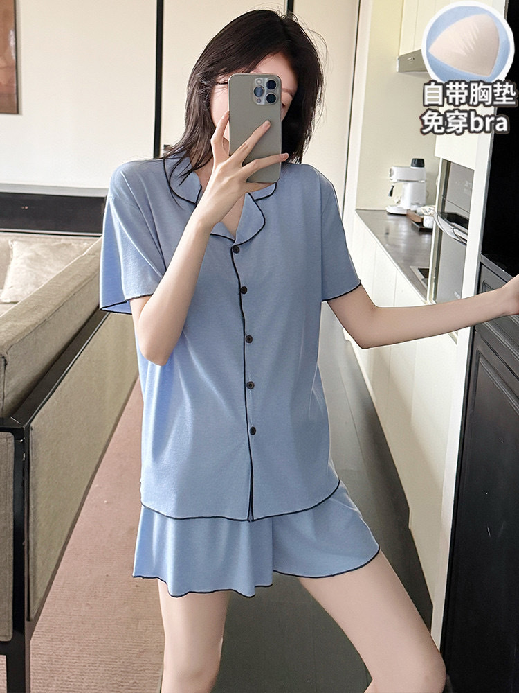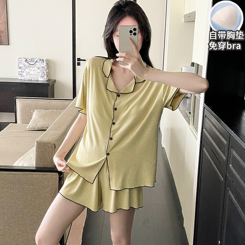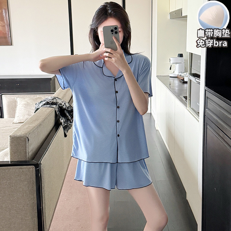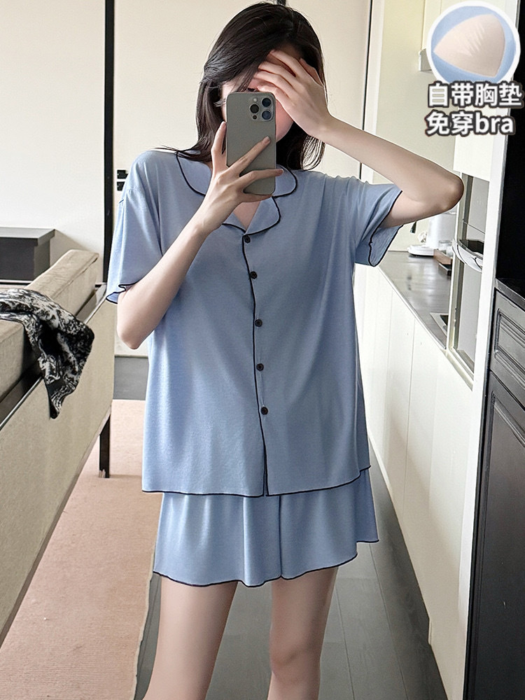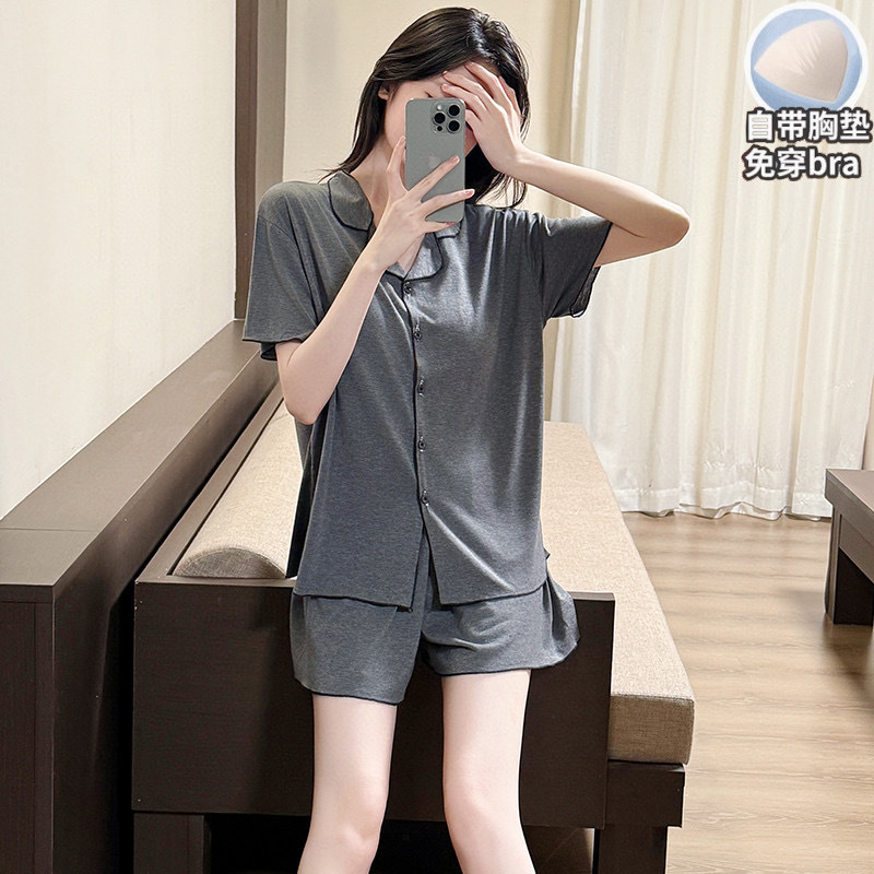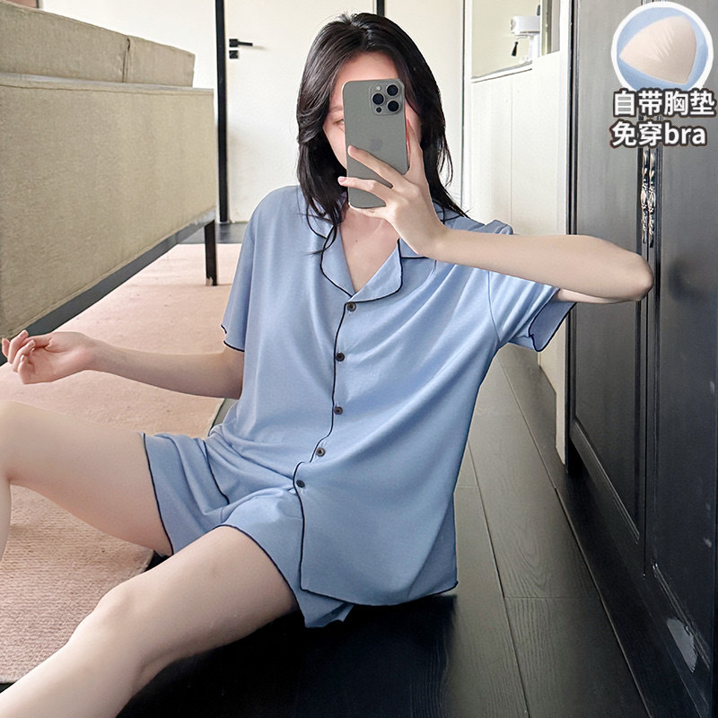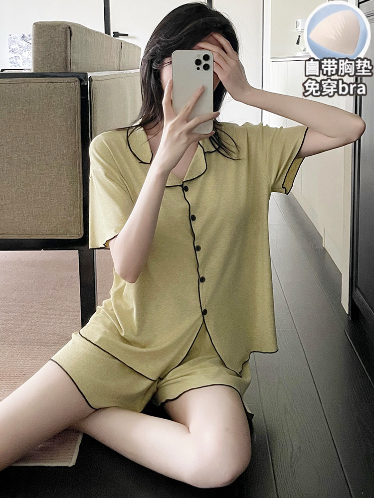 여름 여성을 위한 한국식 심플 모달 잠옷, 가슴 패드가 있는 얇은 가디건, 귀를 뽑은 반팔 반바지 캐주얼 슈트스토어 가기