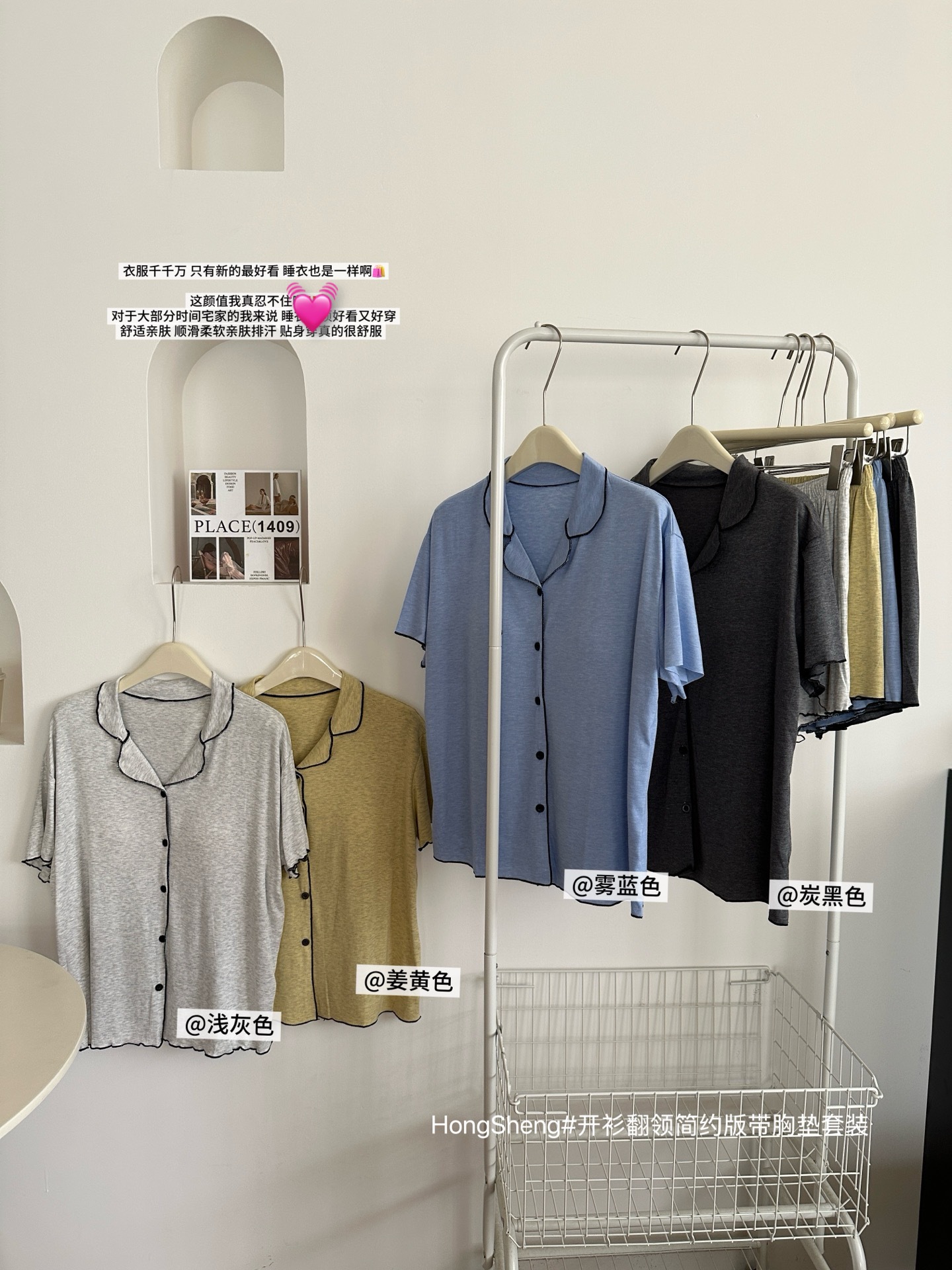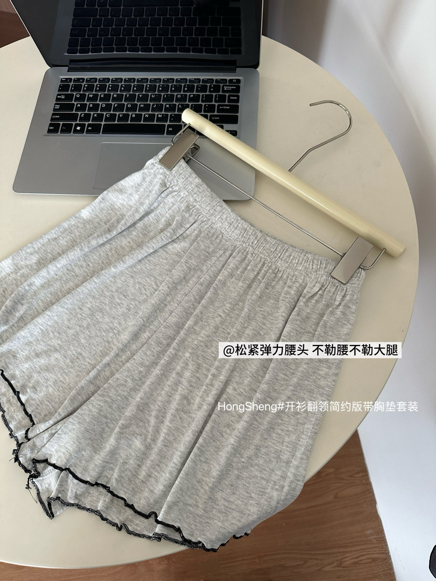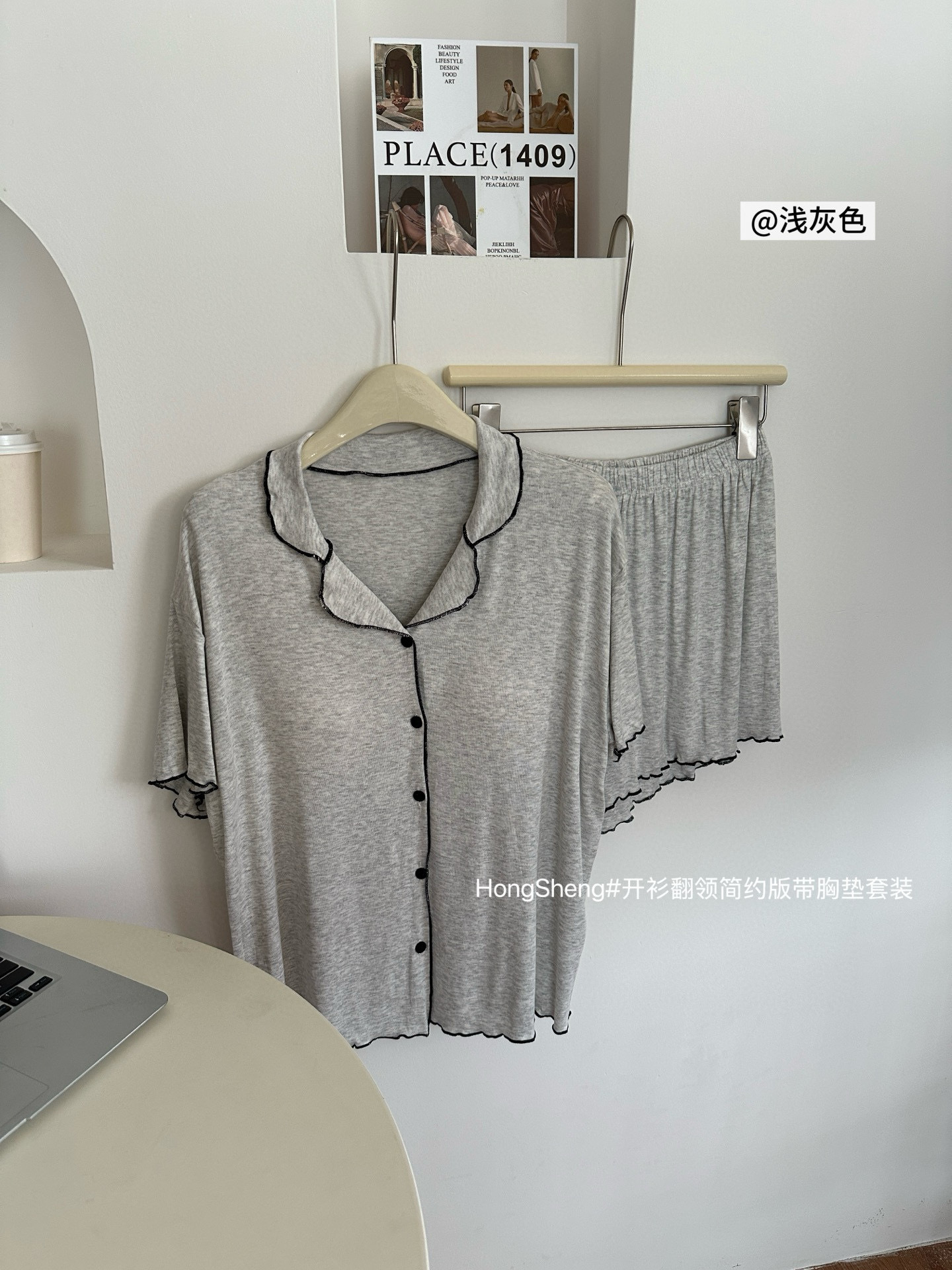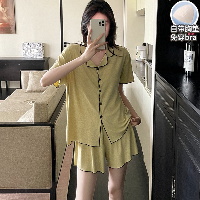 여름 여성을 위한 한국식 심플 모달 잠옷, 가슴 패드가 있는 얇은 가디건, 귀를 뽑은 반팔 반바지 캐주얼 슈트스토어 가기