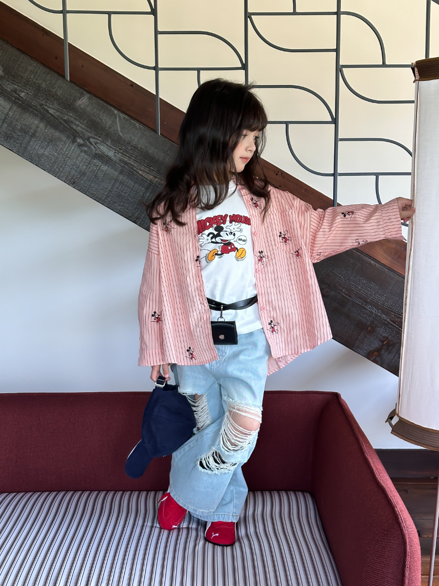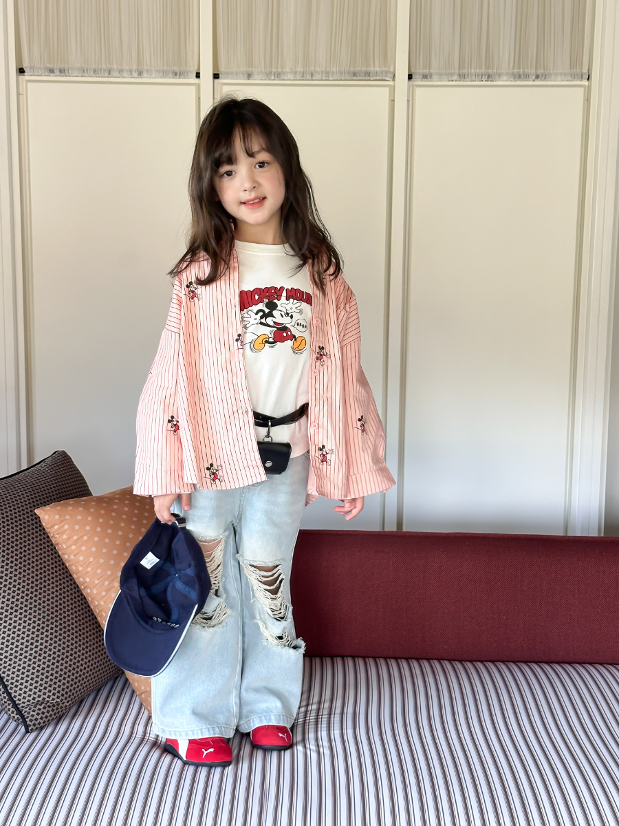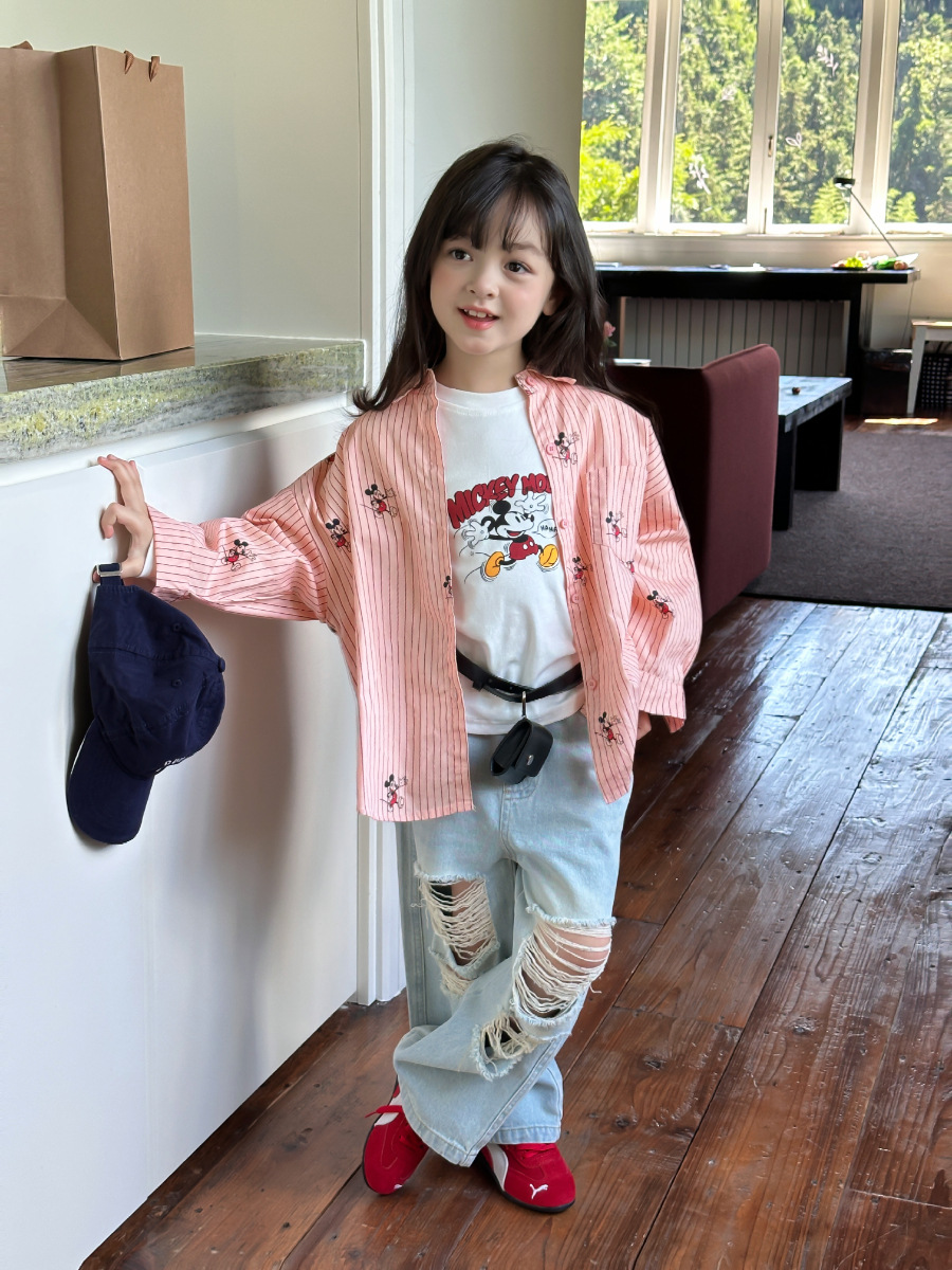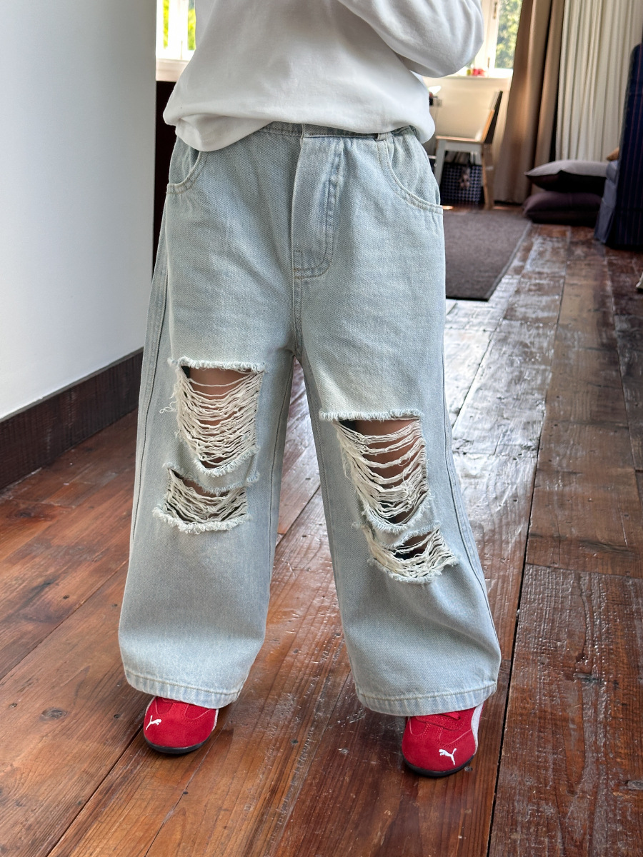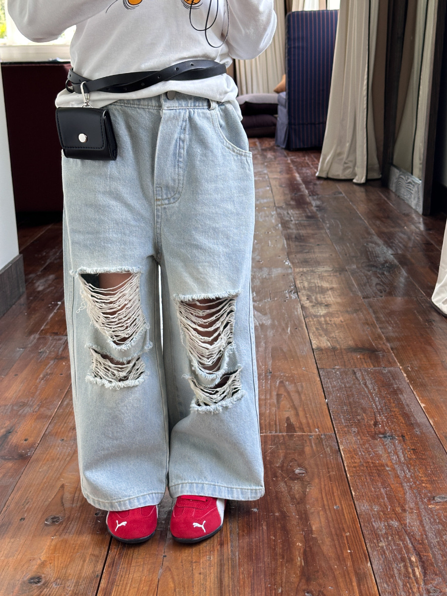 봄가을 아동복 한국 스타일 데미지 진 여아 중소형 아동용 신상 바지 데님 와이드 팬츠스토어 가기