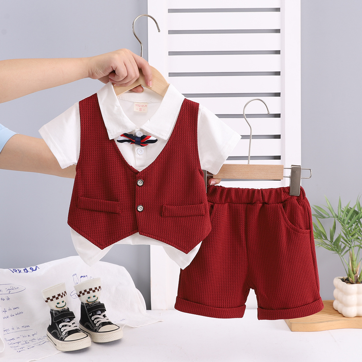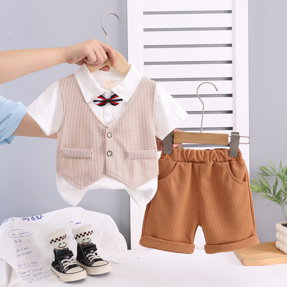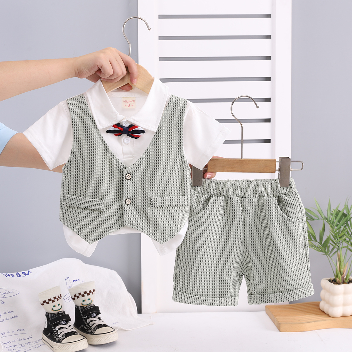대외 무역 도매 소년 여름 정장 신사 정장 어린이 가짜 조끼 반팔 투피스 세트 아기 캐주얼 드레스 유행스토어 가기