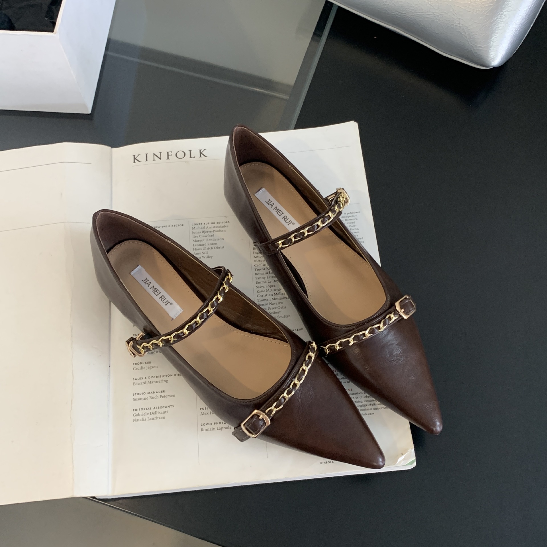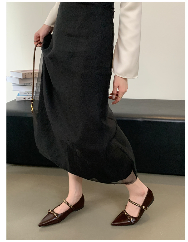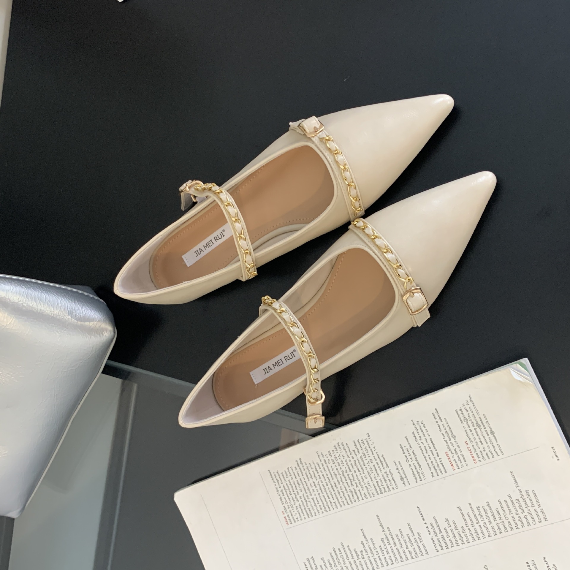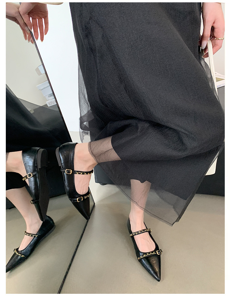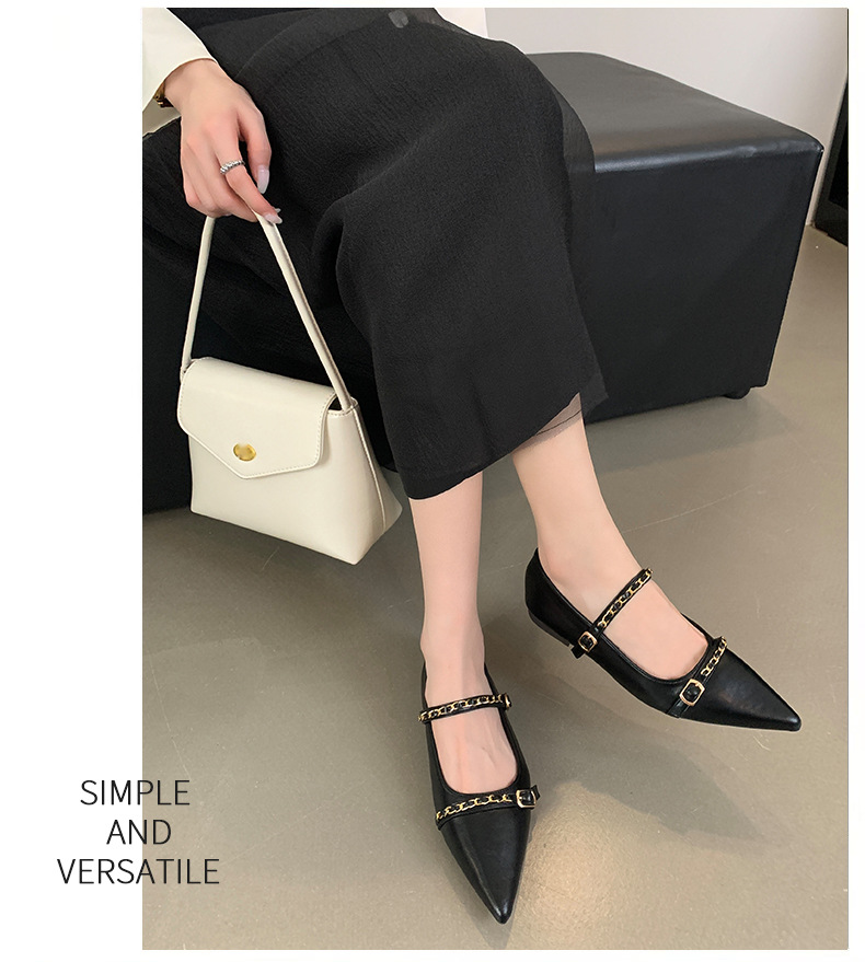 여성을위한 프랑스 플랫 포인티드 슈즈 2025 봄 여성을위한 새로운 금속 체인 다용도 메리 제인 슈즈