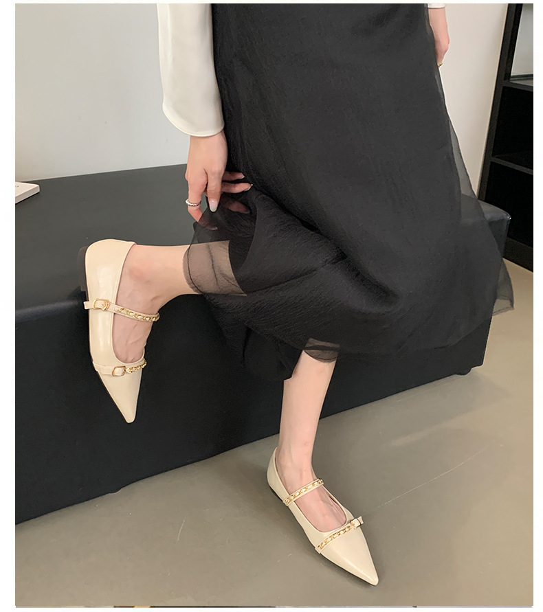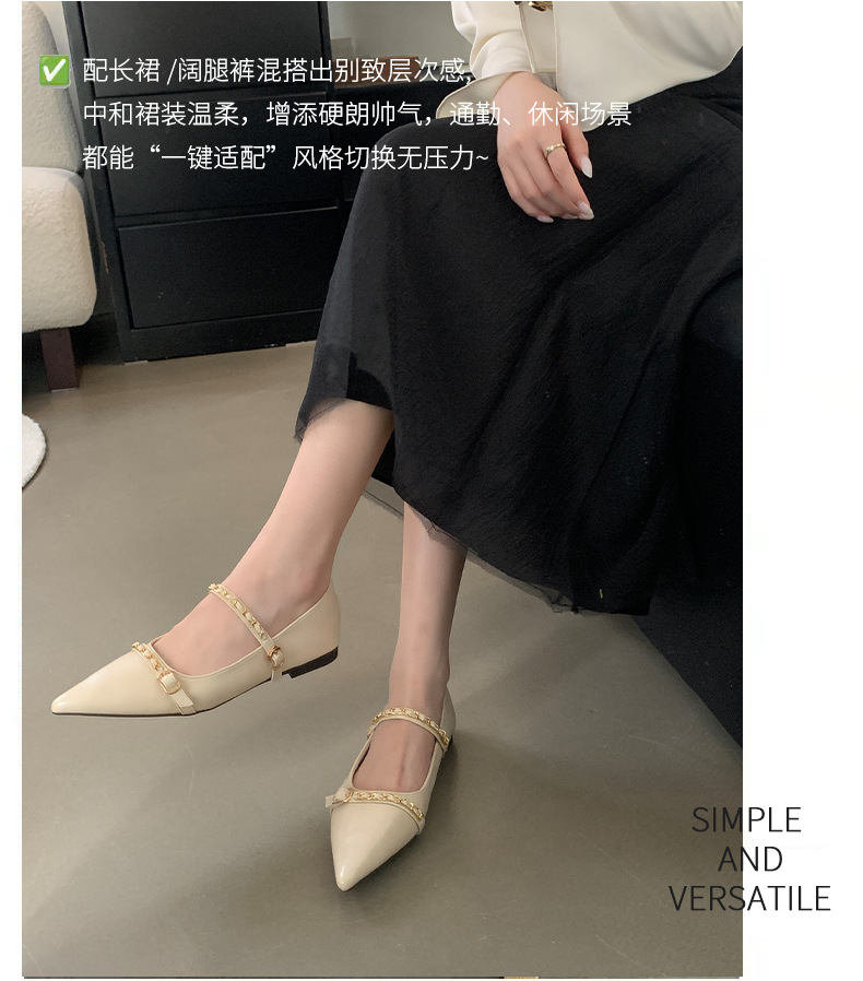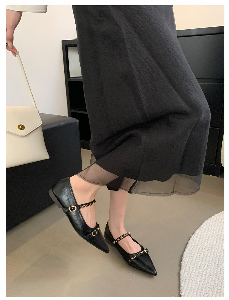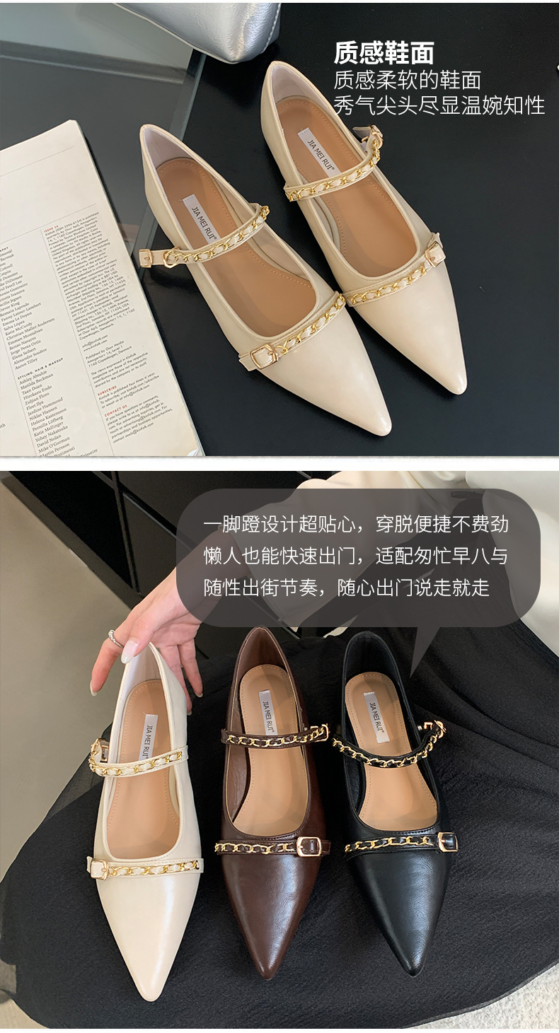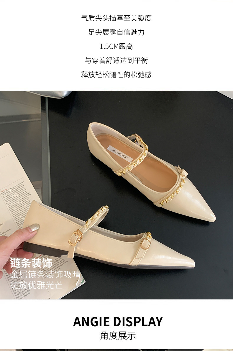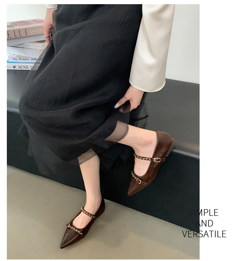 여성을위한 프랑스 플랫 포인티드 슈즈 2025 봄 여성을위한 새로운 금속 체인 다용도 메리 제인 슈즈스토어 가기