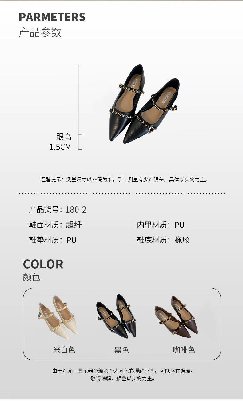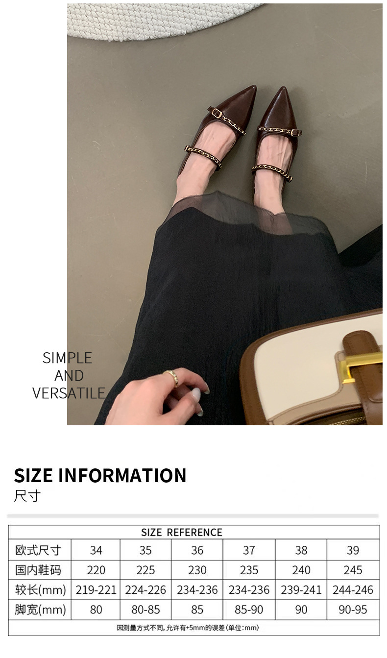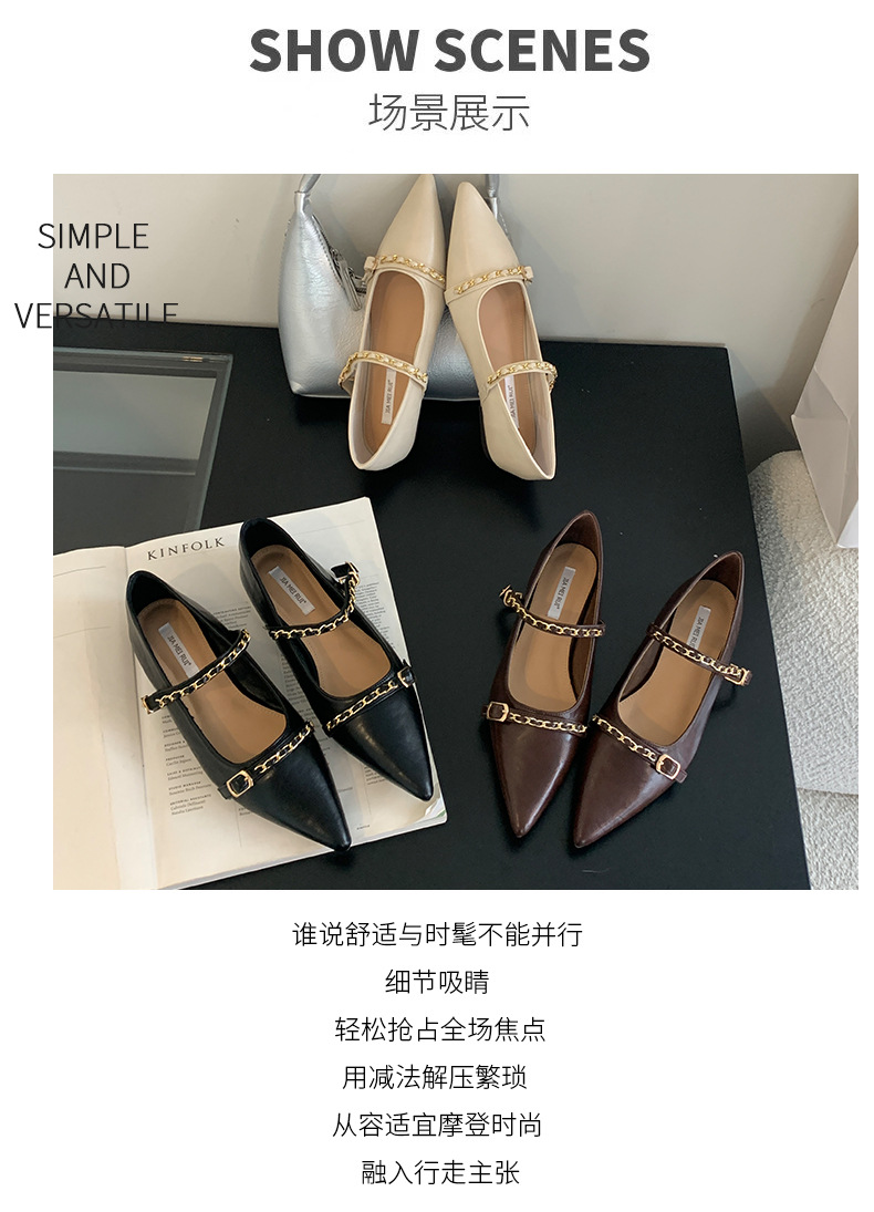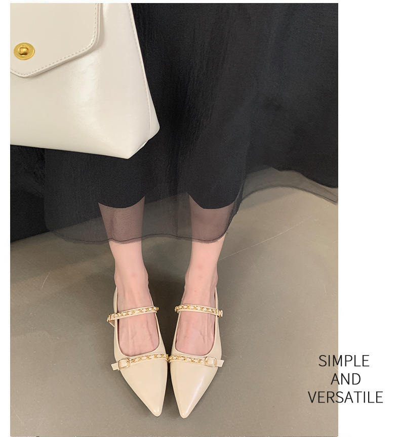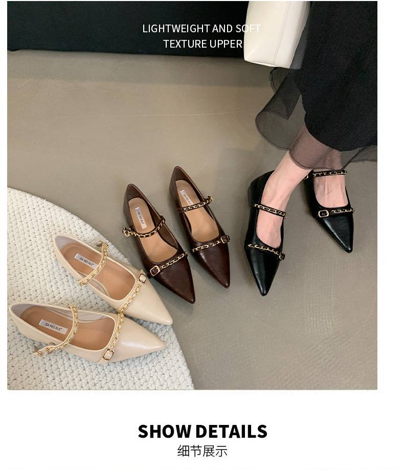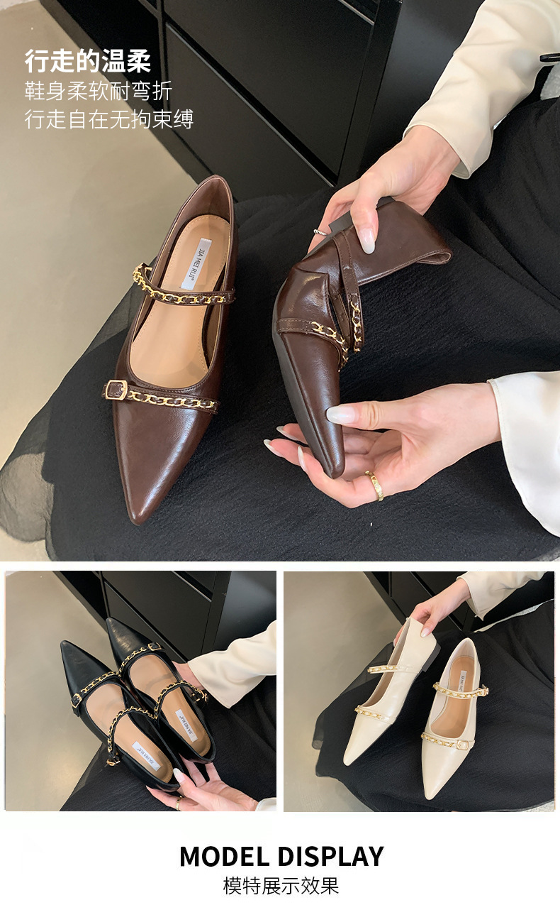여성을위한 프랑스 플랫 포인티드 슈즈 2025 봄 여성을위한 새로운 금속 체인 다용도 메리 제인 슈즈스토어 가기