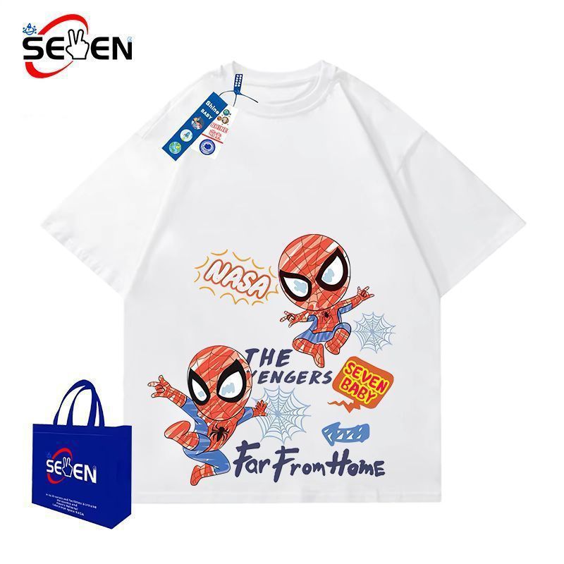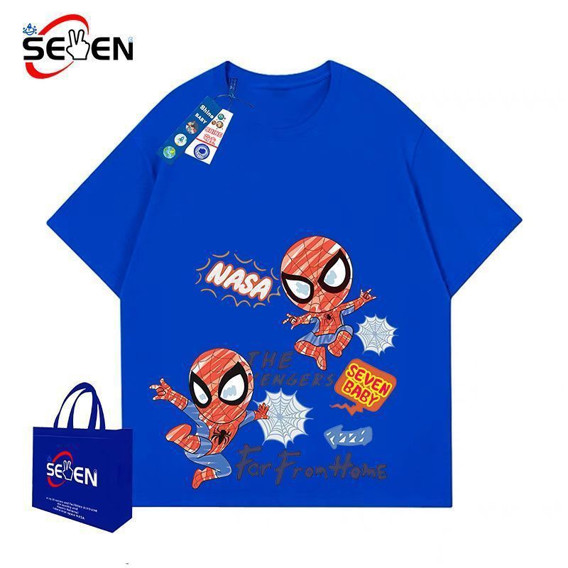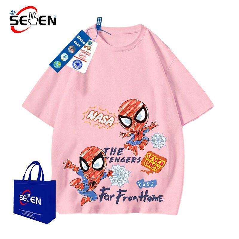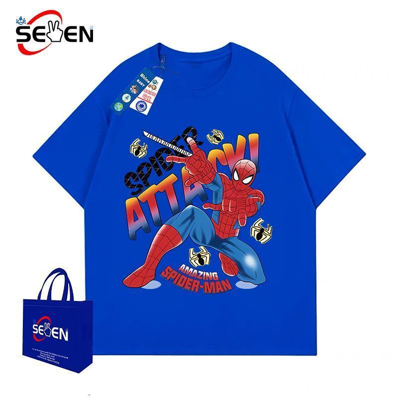 귀여운 스파이더 맨 퓨어 코튼 반팔 2024 여름 만화 소년과 소녀 티셔츠 잘 생긴 중대형 아동 의류 반팔 탑스토어 가기