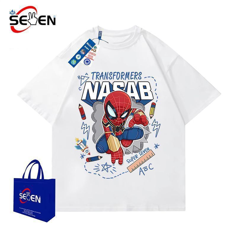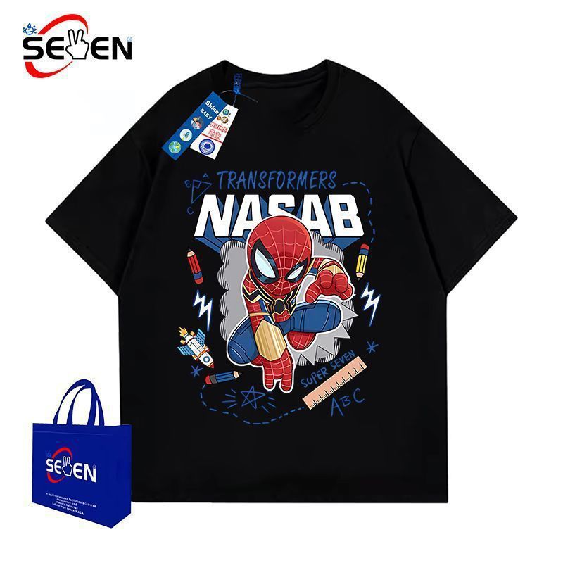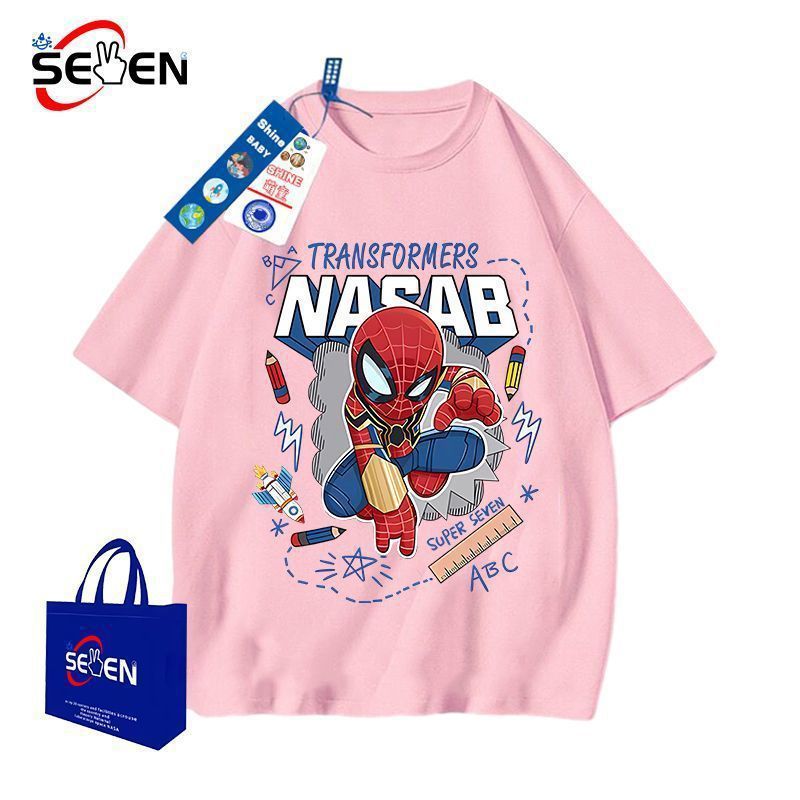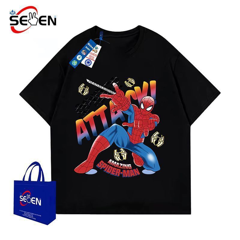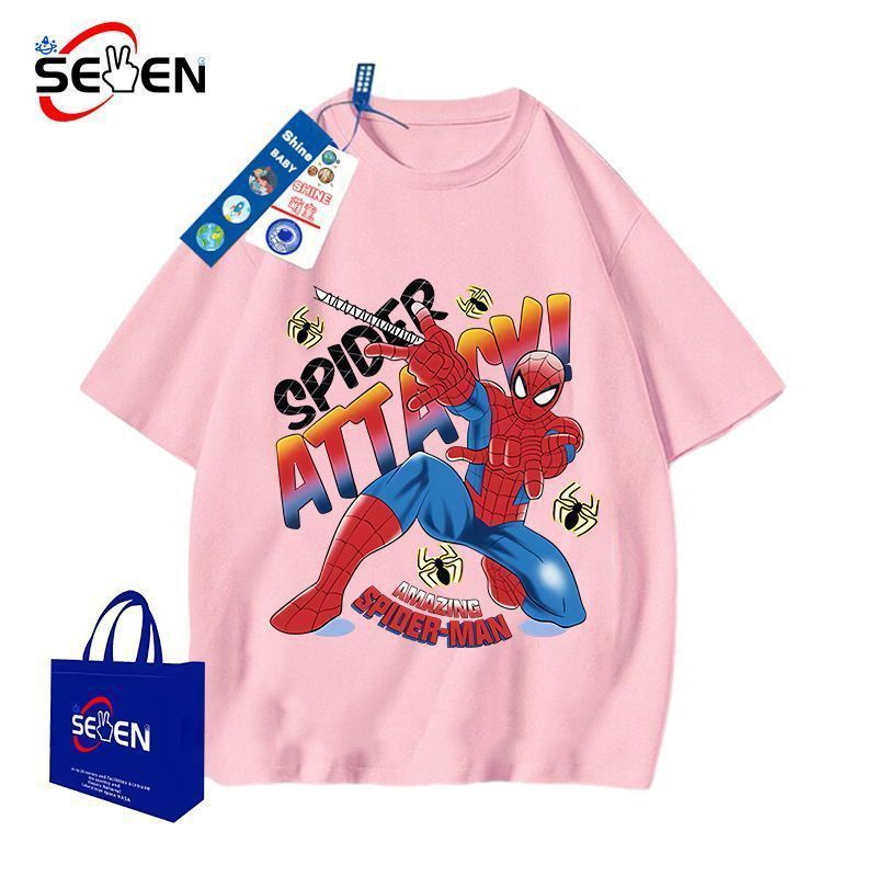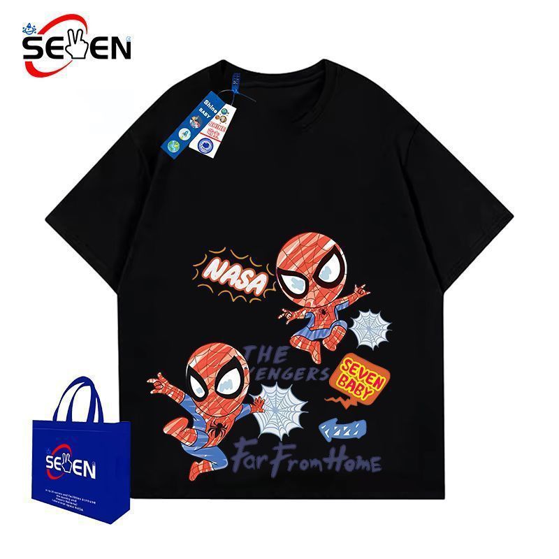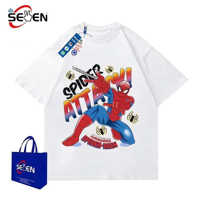 귀여운 스파이더 맨 퓨어 코튼 반팔 2024 여름 만화 소년과 소녀 티셔츠 잘 생긴 중대형 아동 의류 반팔 탑