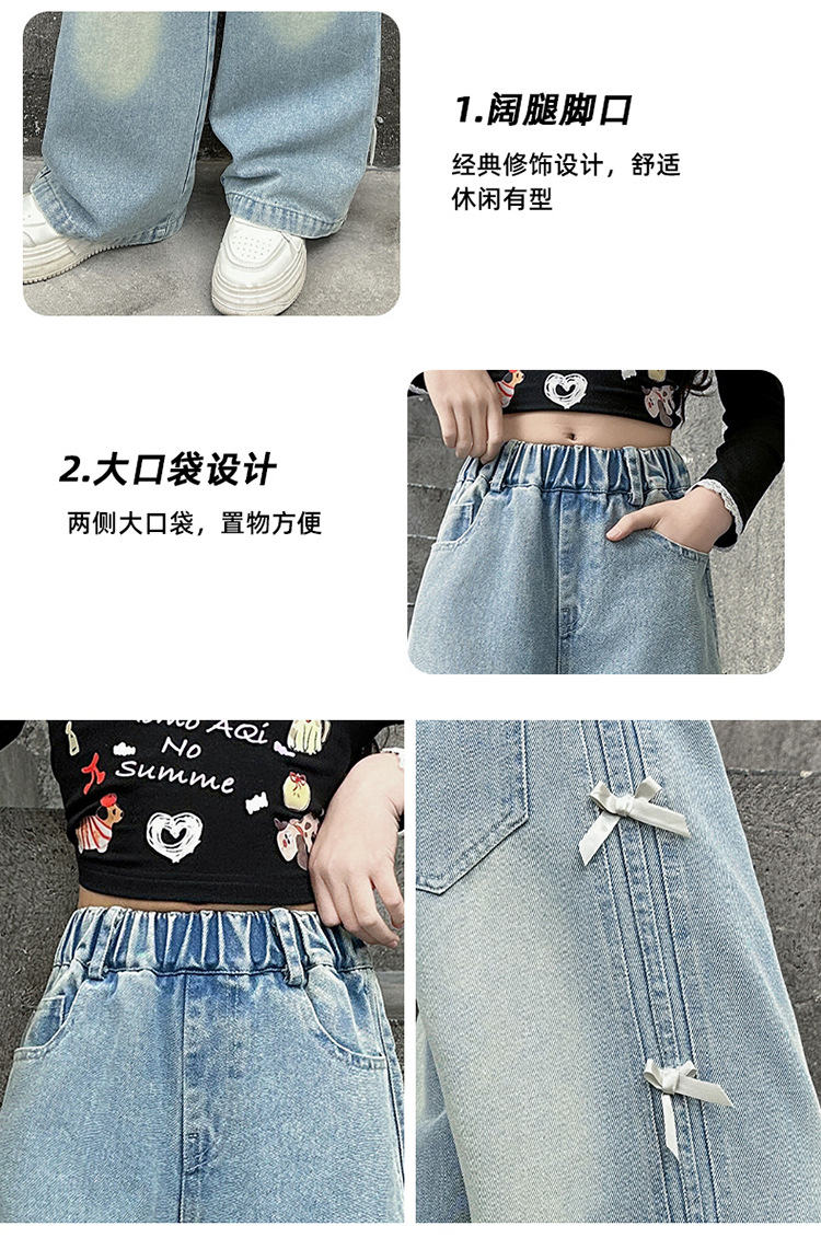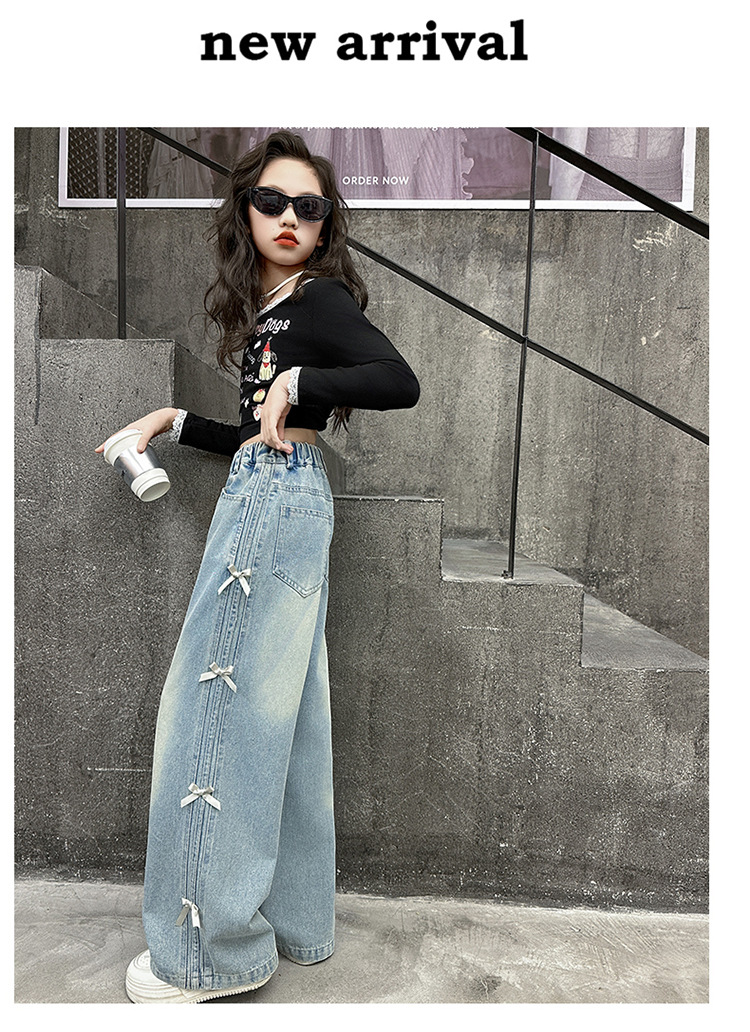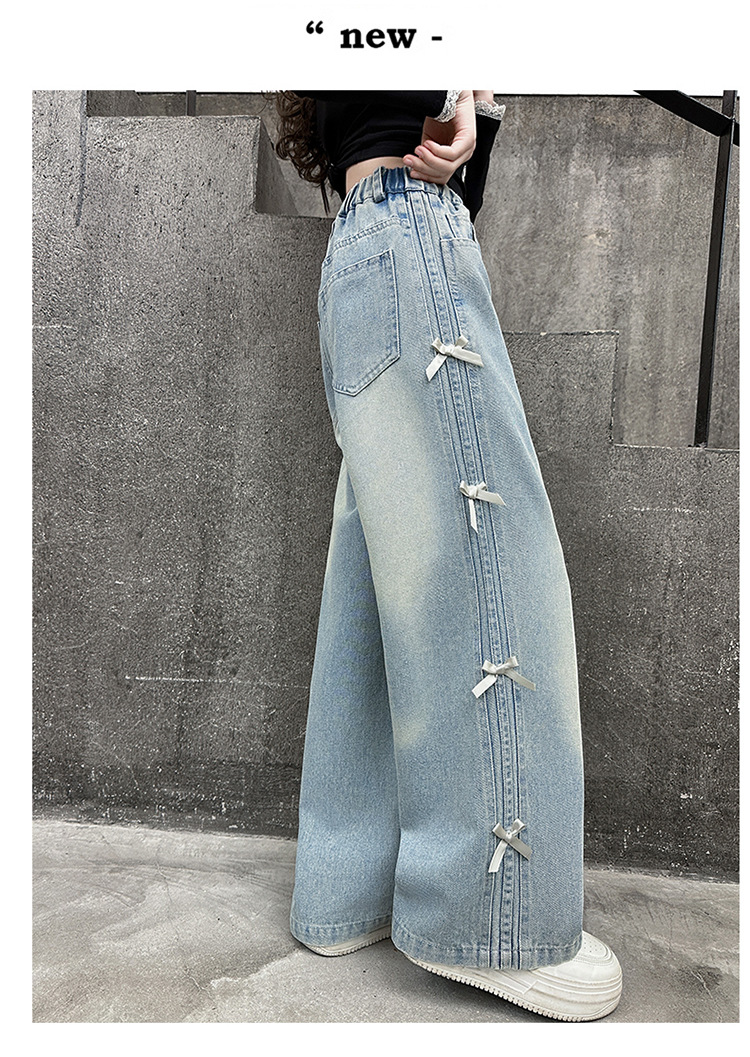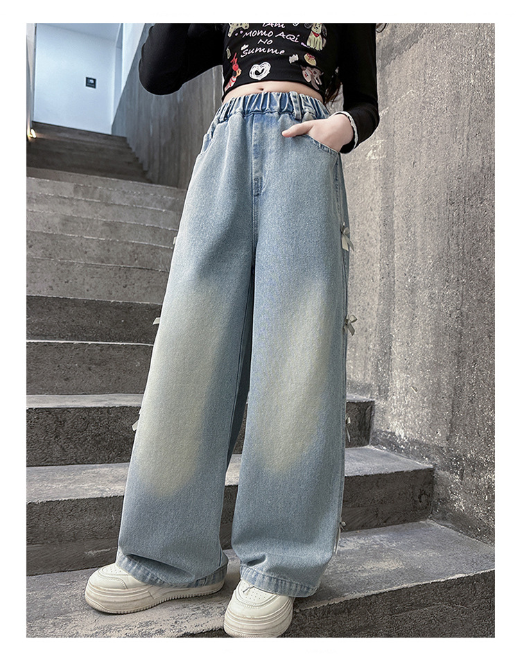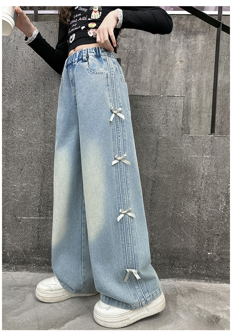 여아 바지 봄, 가을 새로운 스타일 2025 중대형 어린이 리본 청바지 어린이 스트레이트 루즈 와이드 레그 팬츠