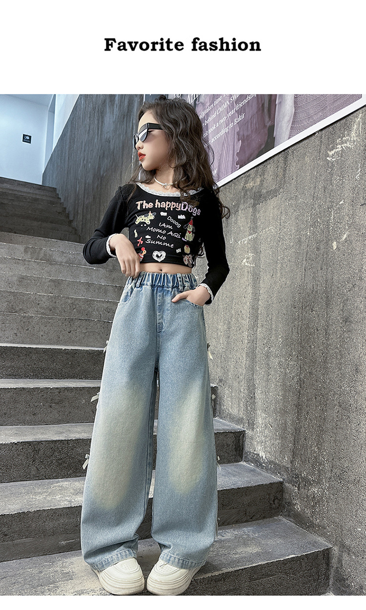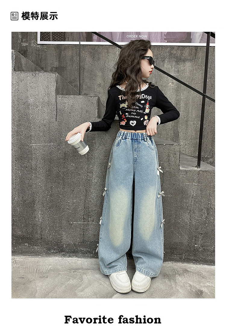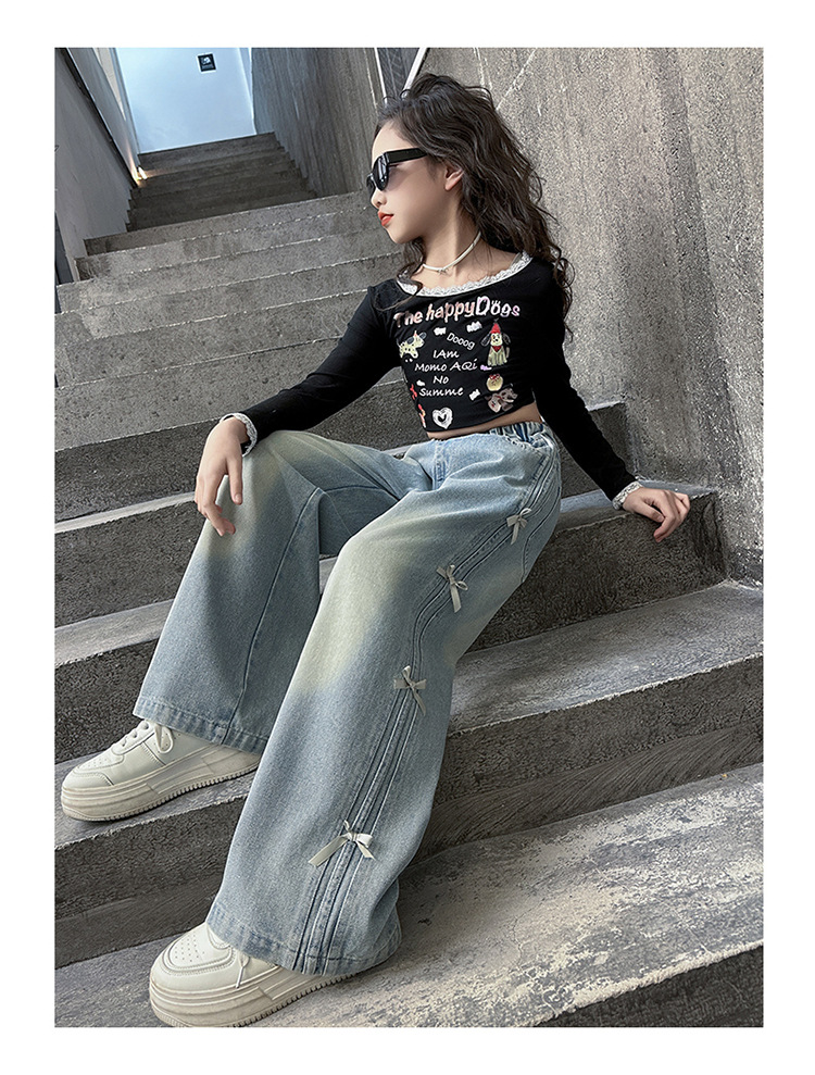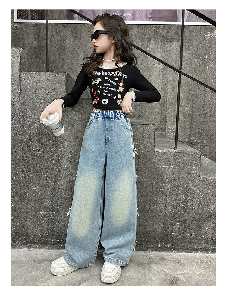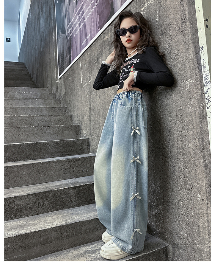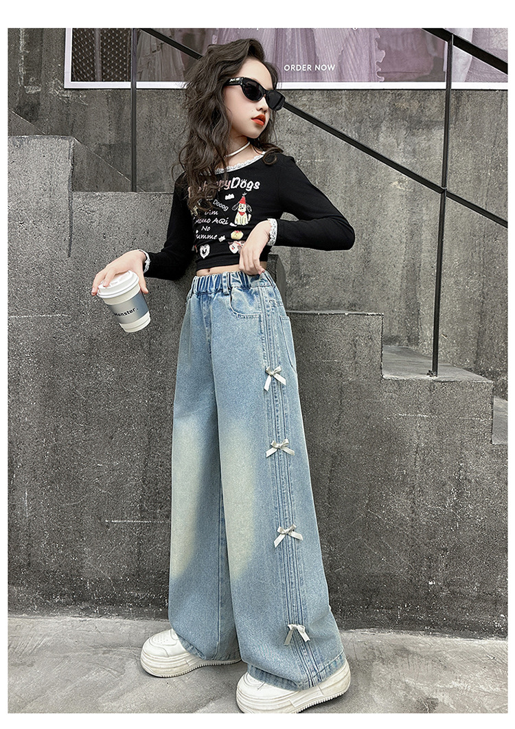 여아 바지 봄, 가을 새로운 스타일 2025 중대형 어린이 리본 청바지 어린이 스트레이트 루즈 와이드 레그 팬츠