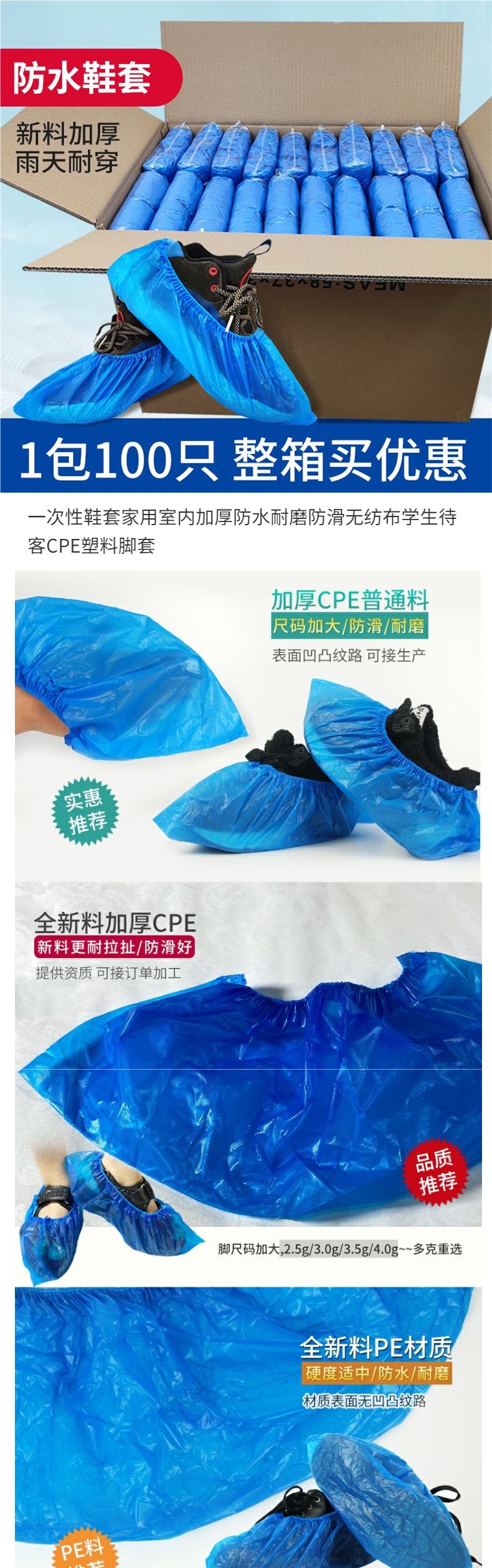 가정용 실내용 일회용 신발 커버 두꺼운 방수 내마모성 미끄럼 방지 부직포 학생 환대 CPE 플라스틱 발 커버스토어 가기