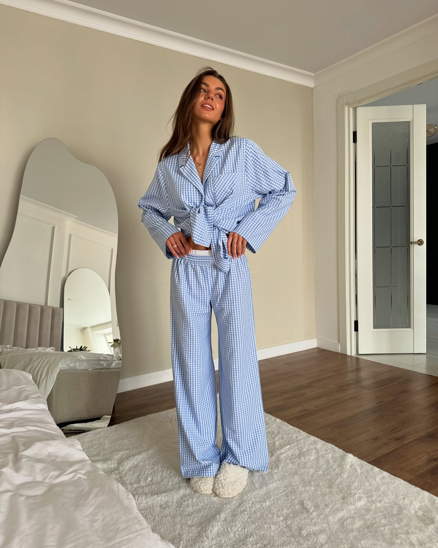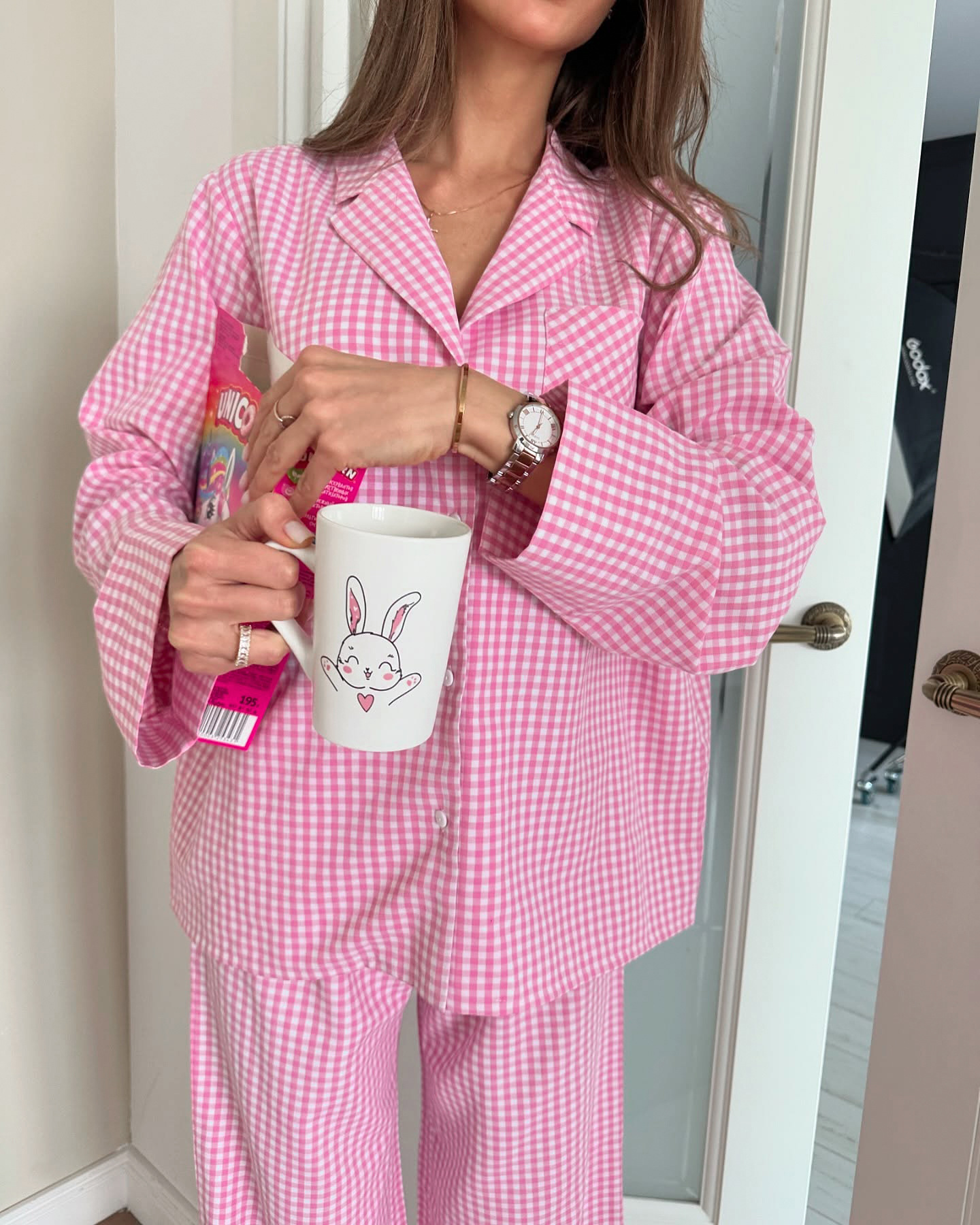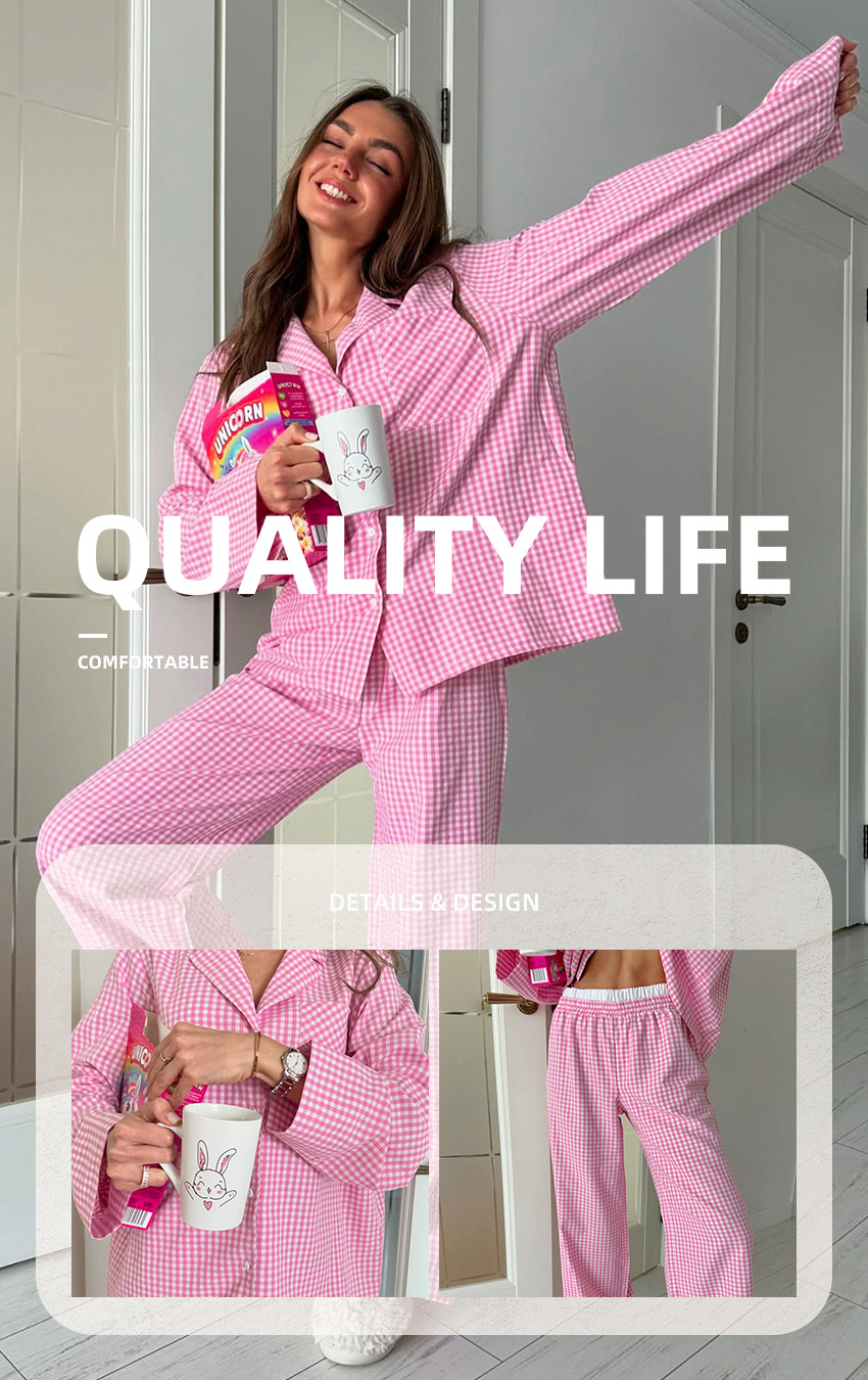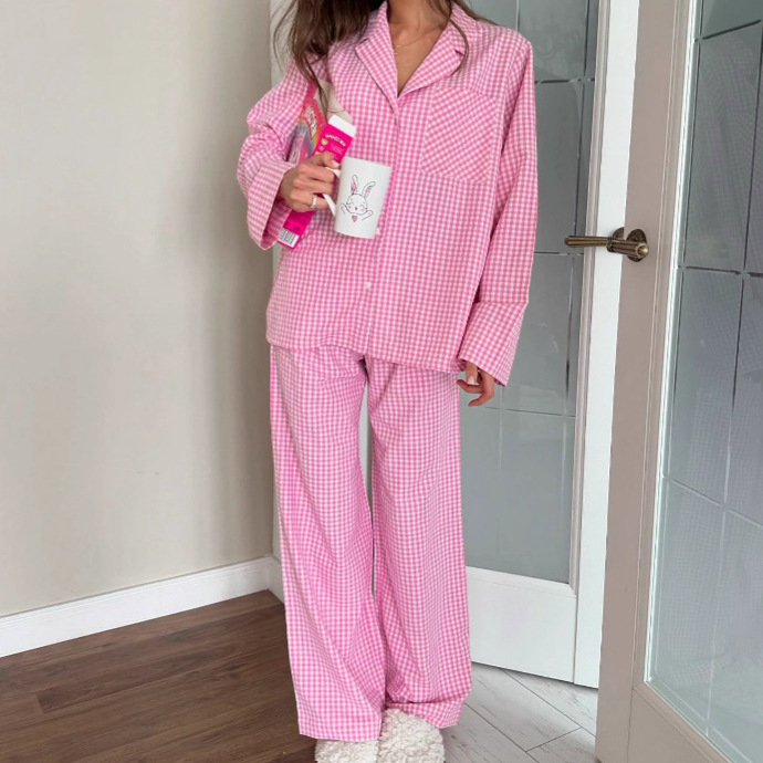 핑크색 체크무늬 긴팔 긴바지 잠옷 세트, 2026년 유럽 및 미국 가을 신상 여성 홈웨어, 외출복으로도 착용 가능스토어 가기