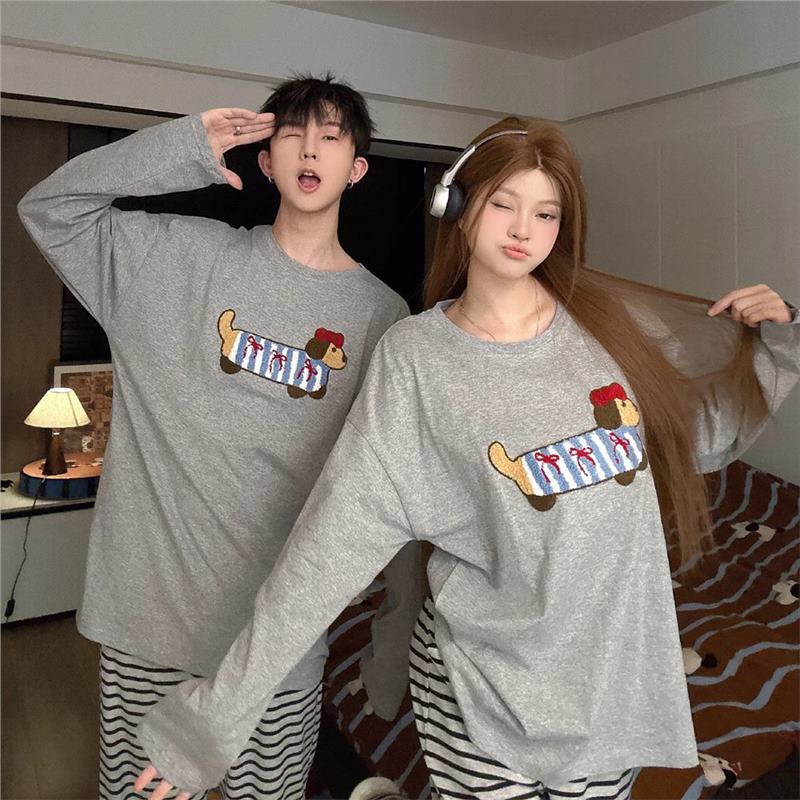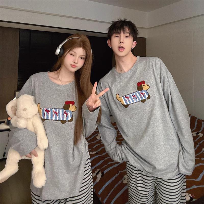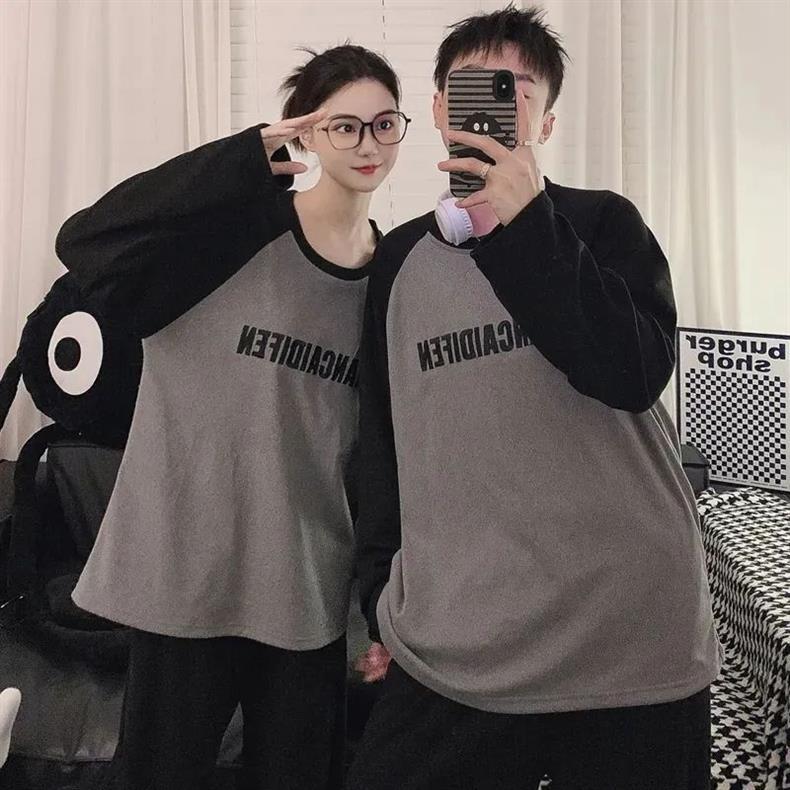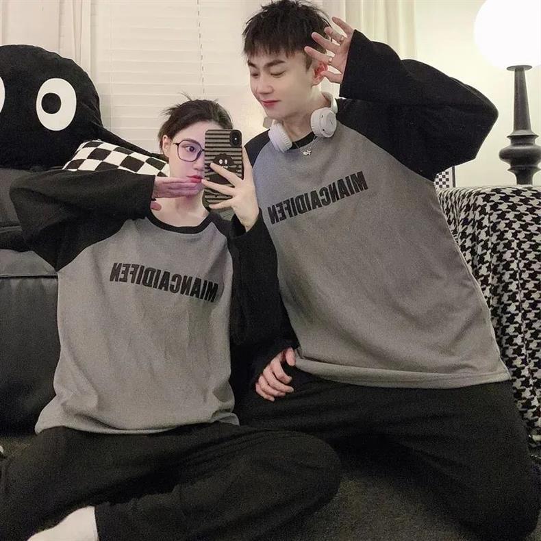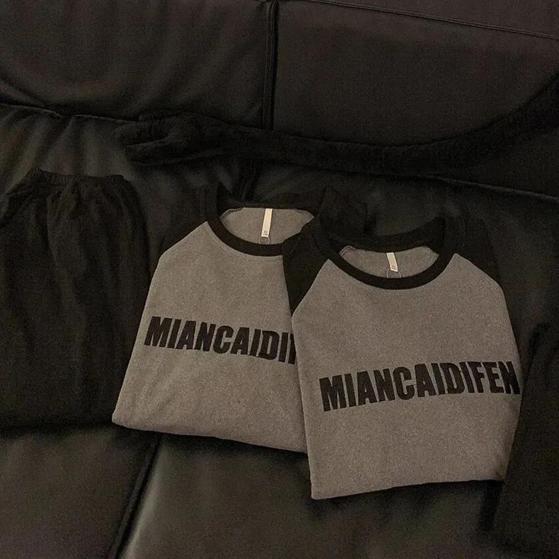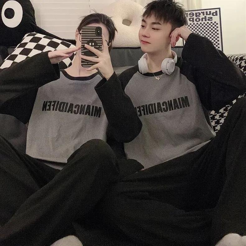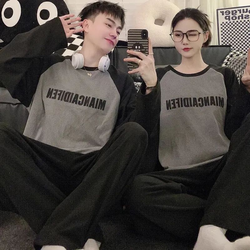 봄과 가을 소년과 소녀를위한 일본식 회색 캐주얼 간단한 편지 커플 잠옷 겉옷을위한 라운드 넥 얇은 홈웨어 세트스토어 가기