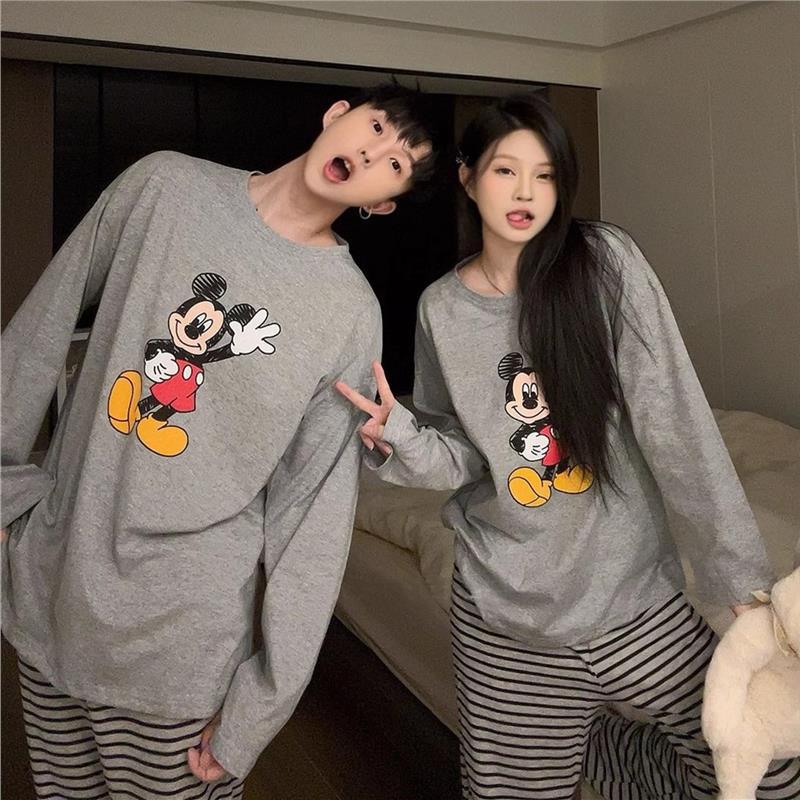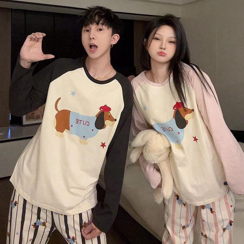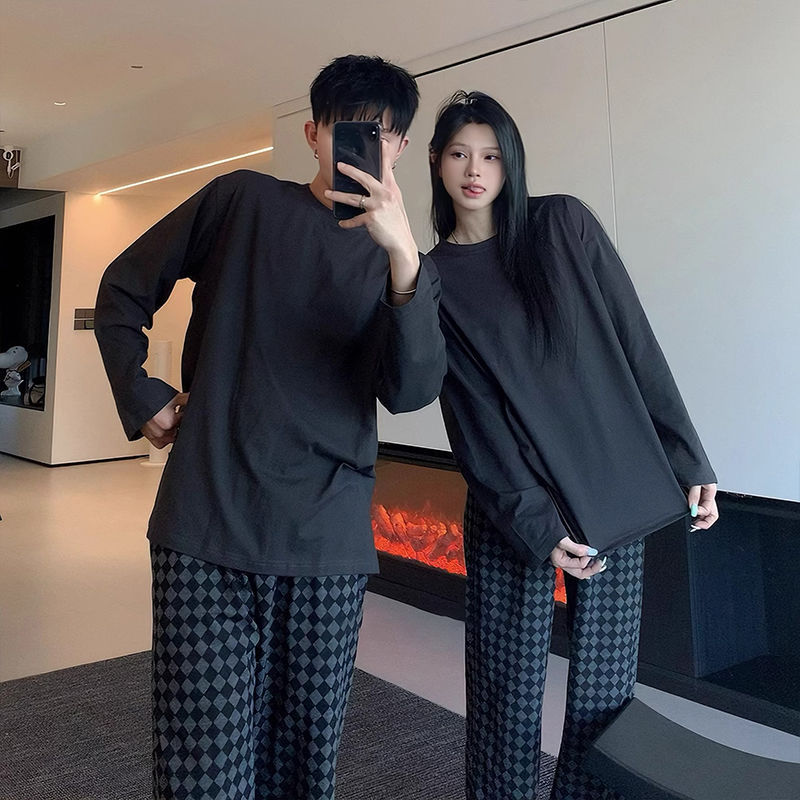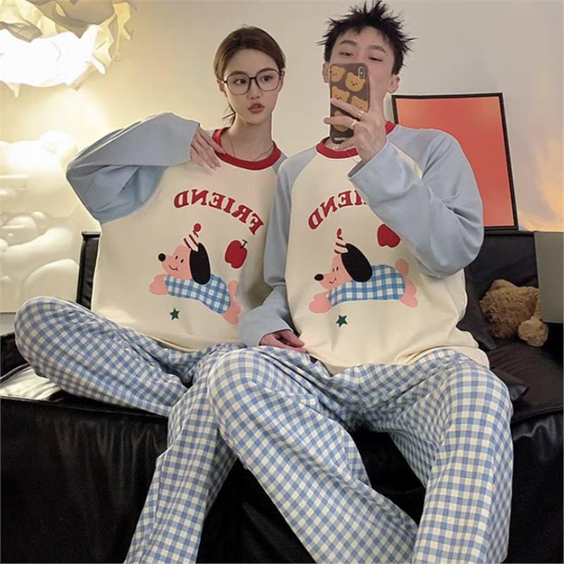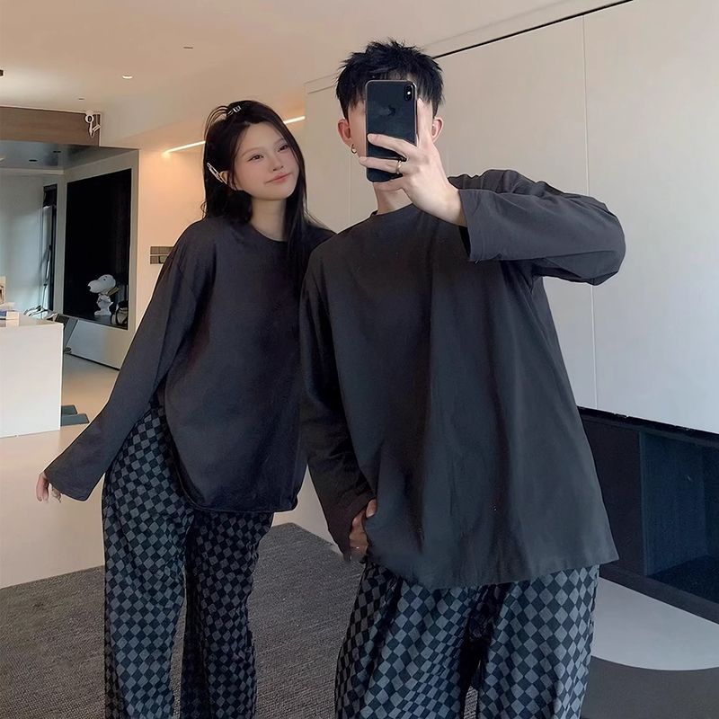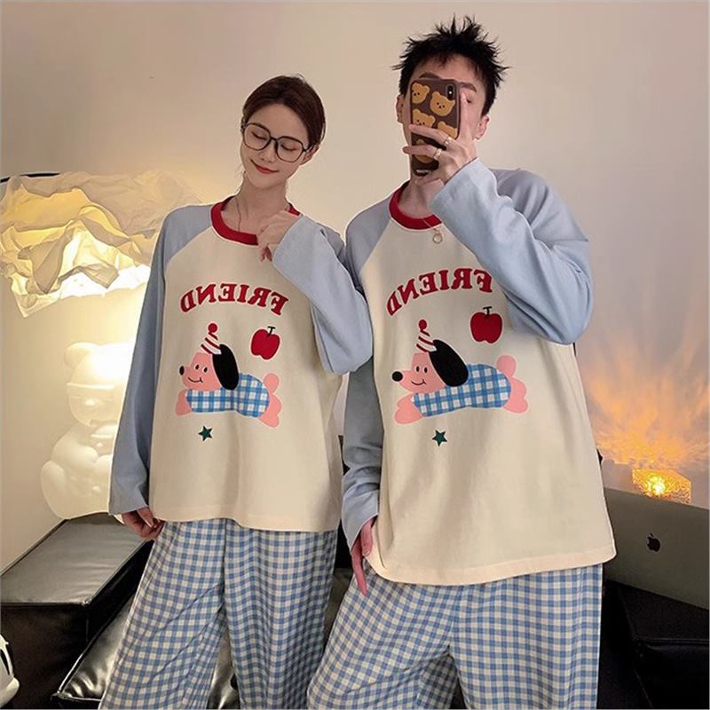 봄과 가을 소년과 소녀를위한 일본식 회색 캐주얼 간단한 편지 커플 잠옷 겉옷을위한 라운드 넥 얇은 홈웨어 세트스토어 가기
